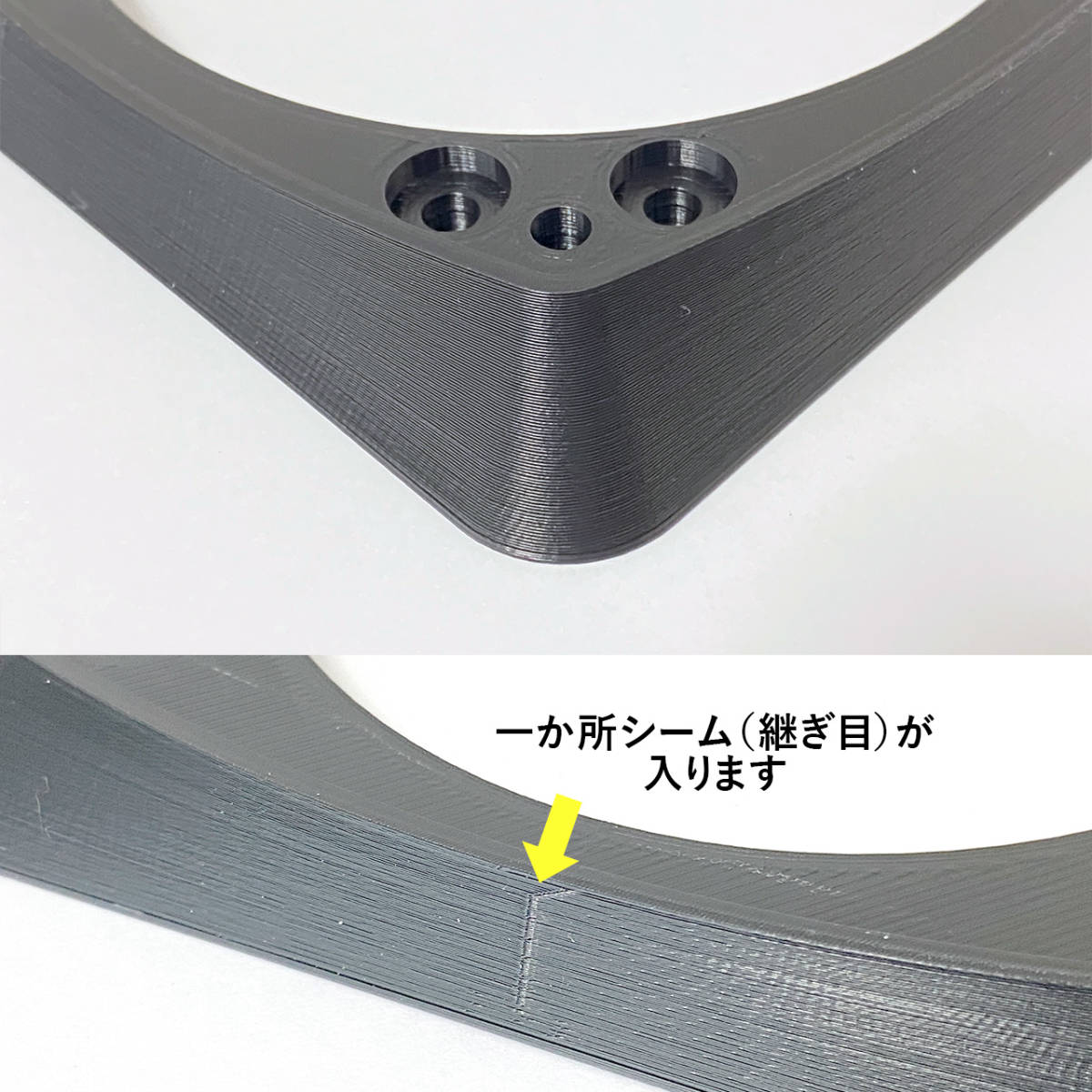 ・3Dプリンターは熱溶解積層法のため、商品の表面に積層痕があります。 | 大量生産される工業製品のような綺麗な表面の仕上げではありません。 ・3Dプリンターの仕様上、一か所にシーム(継ぎ目)が出来ます。