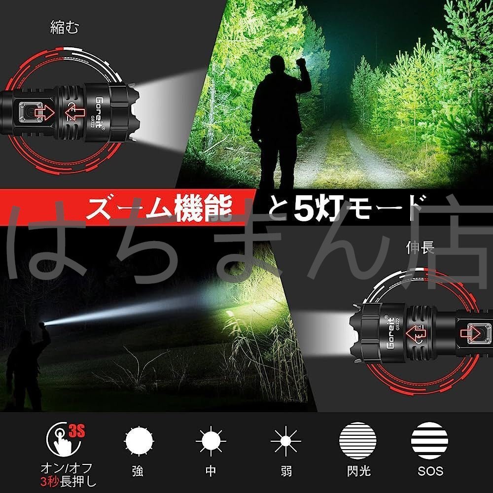 【ズーム機能& 5つのライトモード】S9322 強力なled懐中電灯は3つの明るさモードと2つの緊急モードがあり、1つのキーで消灯できます。 デイリーモード:高→中→省エネ。 非常灯モード:点滅→SOS。 手持ちライトはワンキーパワーオフ機能を追加します! どのモードでも、フラッシュライトのボタンを3秒間押し続けると、懐中電灯をオフにすることができます。 オフにするためにすべてのモードを循環する必要がある他の日本製懐中電灯よりも操作する方が便利です。 必要に応じて、懐中電灯のヘッドを伸縮させて焦点距離を調整したり、長距離スポットライトや大面積フラッドライトを自由に選択したりできます。 夜間照明、夜釣り、キャンプ、登山、犬の散歩、ハイキング、停電、地震、災害緊急対策などの緊急時の使用に非常に適しています。