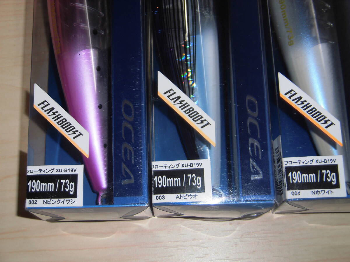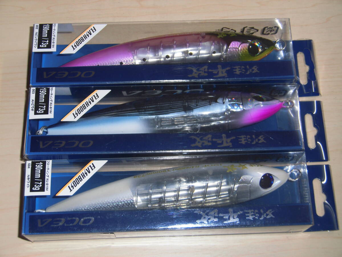シマノのオシア 別注平政 190F フラッシュブースト 73g 002 Nピンクイワシ・003 Aトビウオ・004 Nホワイト 3個セットです。