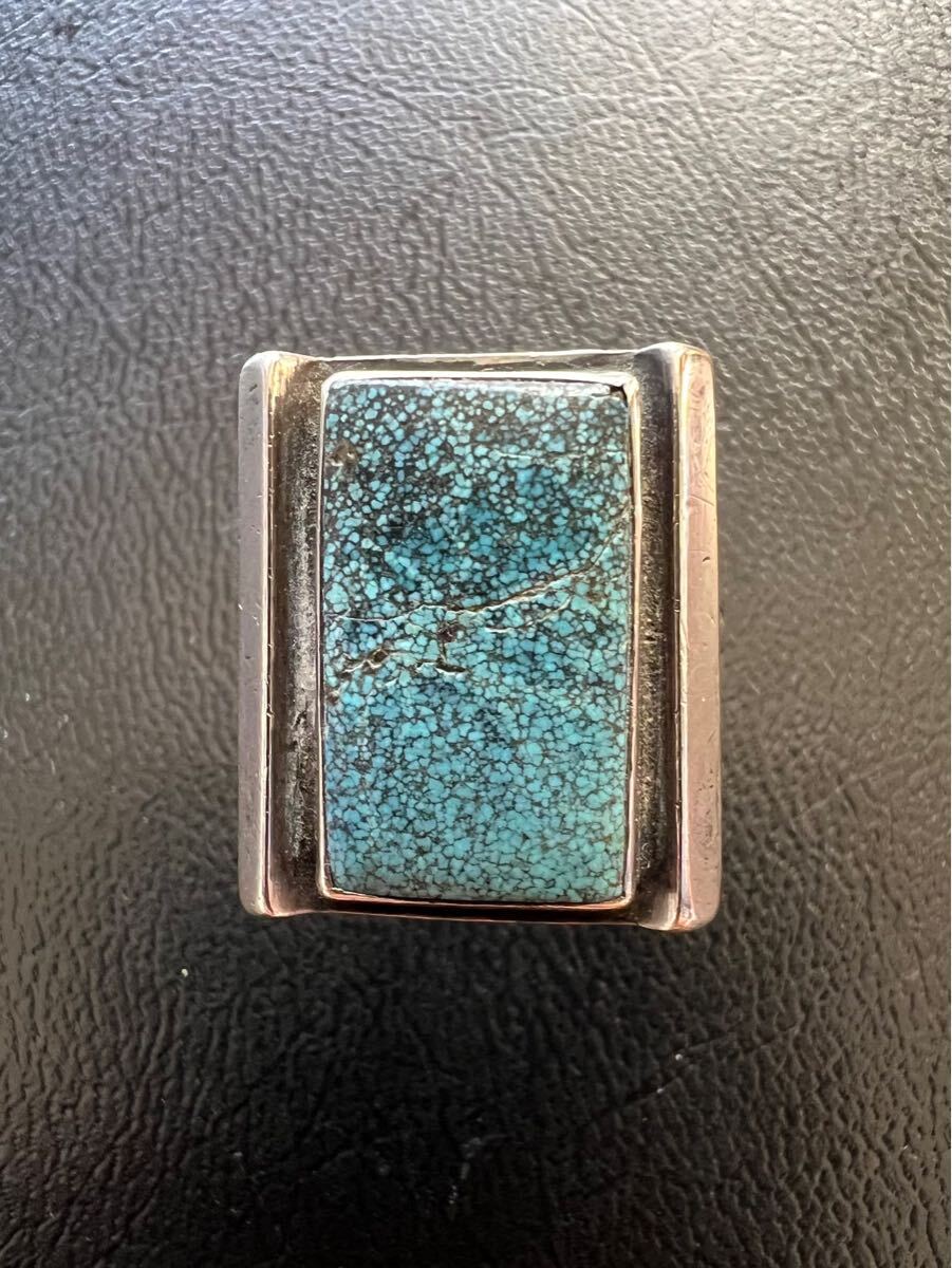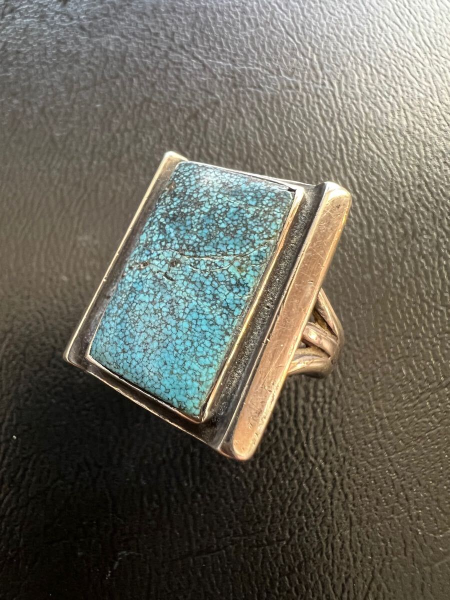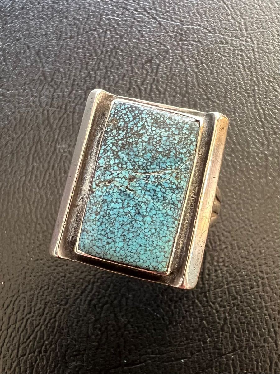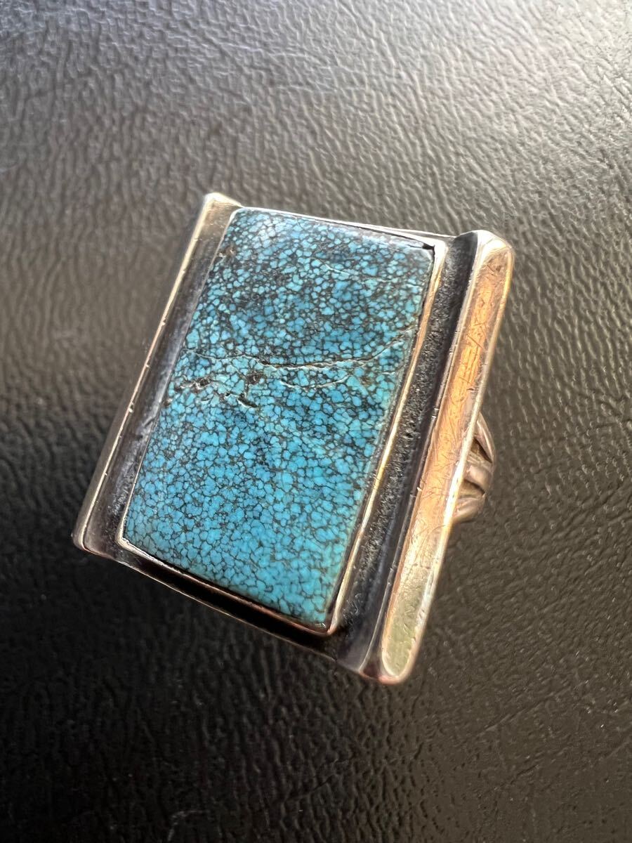 こちらの作品は1960〜70年代にナバホのアーティストにより制作されたリングで、スクエアにカットされたとてもキメの細かく深い色合いの美しいブルーウィンド・ターコイズをセット、洗練されたとても美しいヴィンテージリングになります。