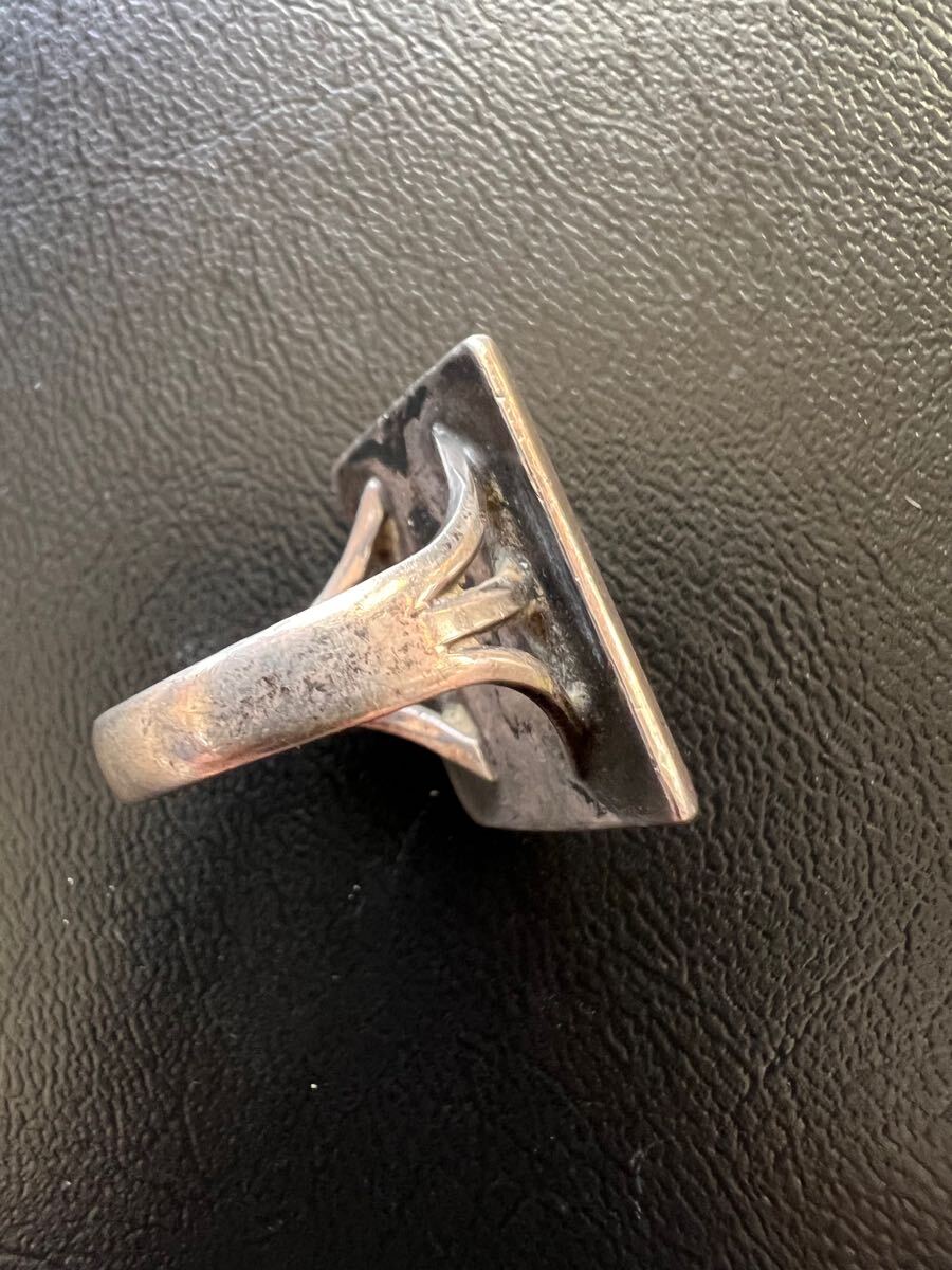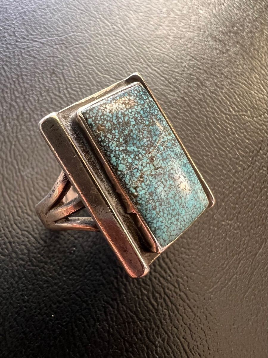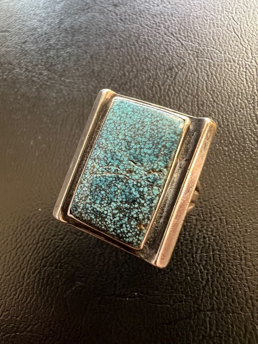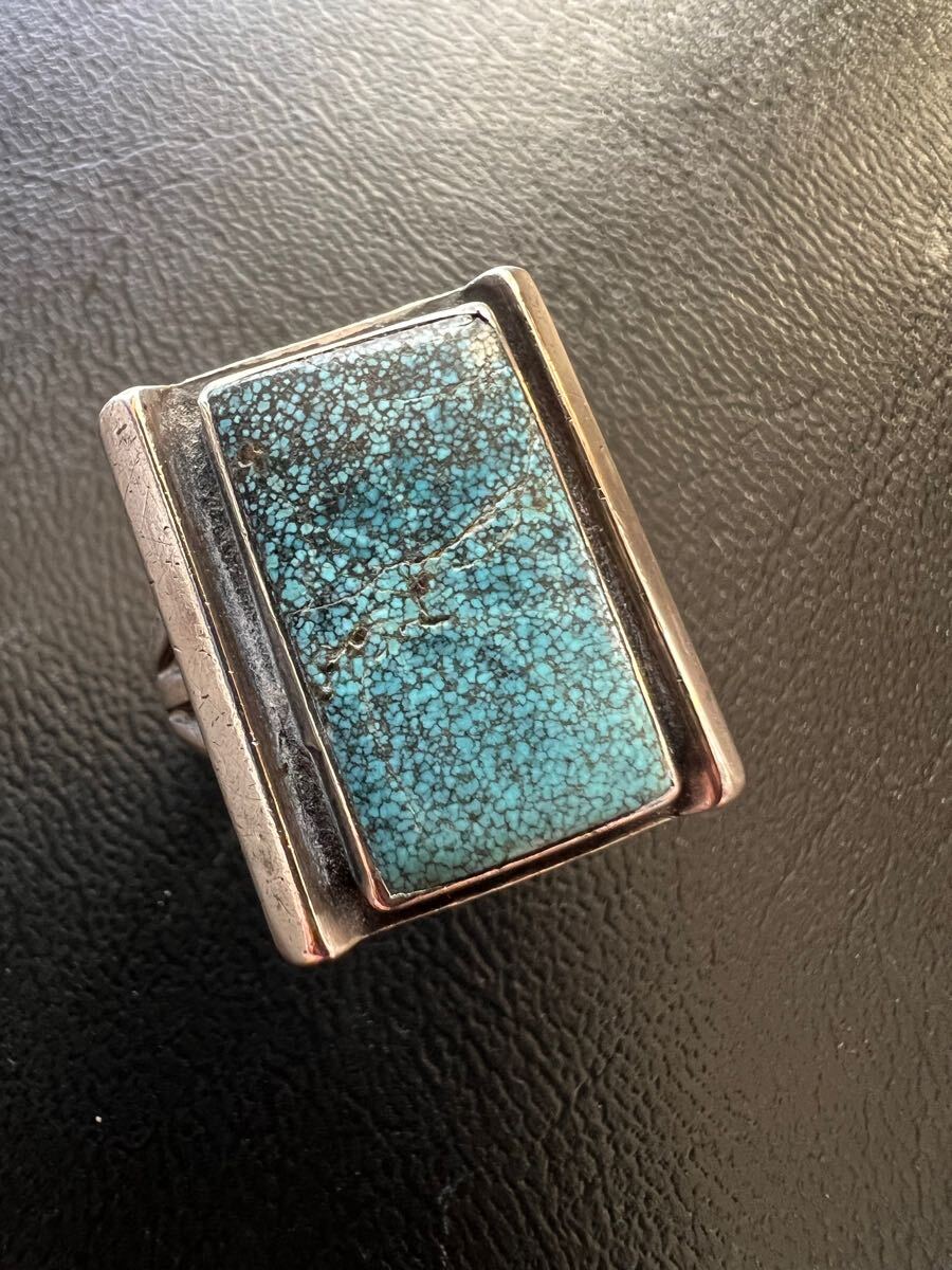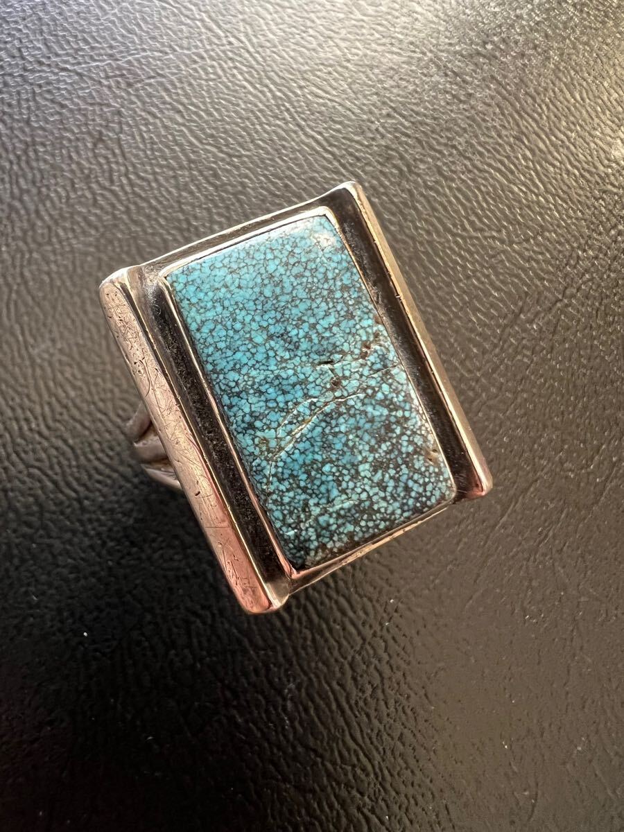 こちらの作品は1960〜70年代にナバホのアーティストにより制作されたリングで、スクエアにカットされたとてもキメの細かく深い色合いの美しいブルーウィンド・ターコイズをセット、洗練されたとても美しいヴィンテージリングになります。