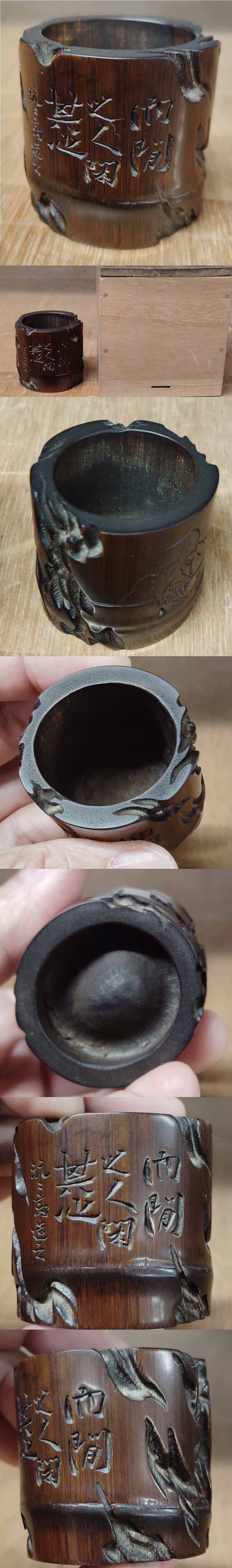 玩々斎 銘 古竹蓋置 箱付 / 鈴木玩々斎 竹細工 竹彫 名工 古竹 煤竹 漢詩彫