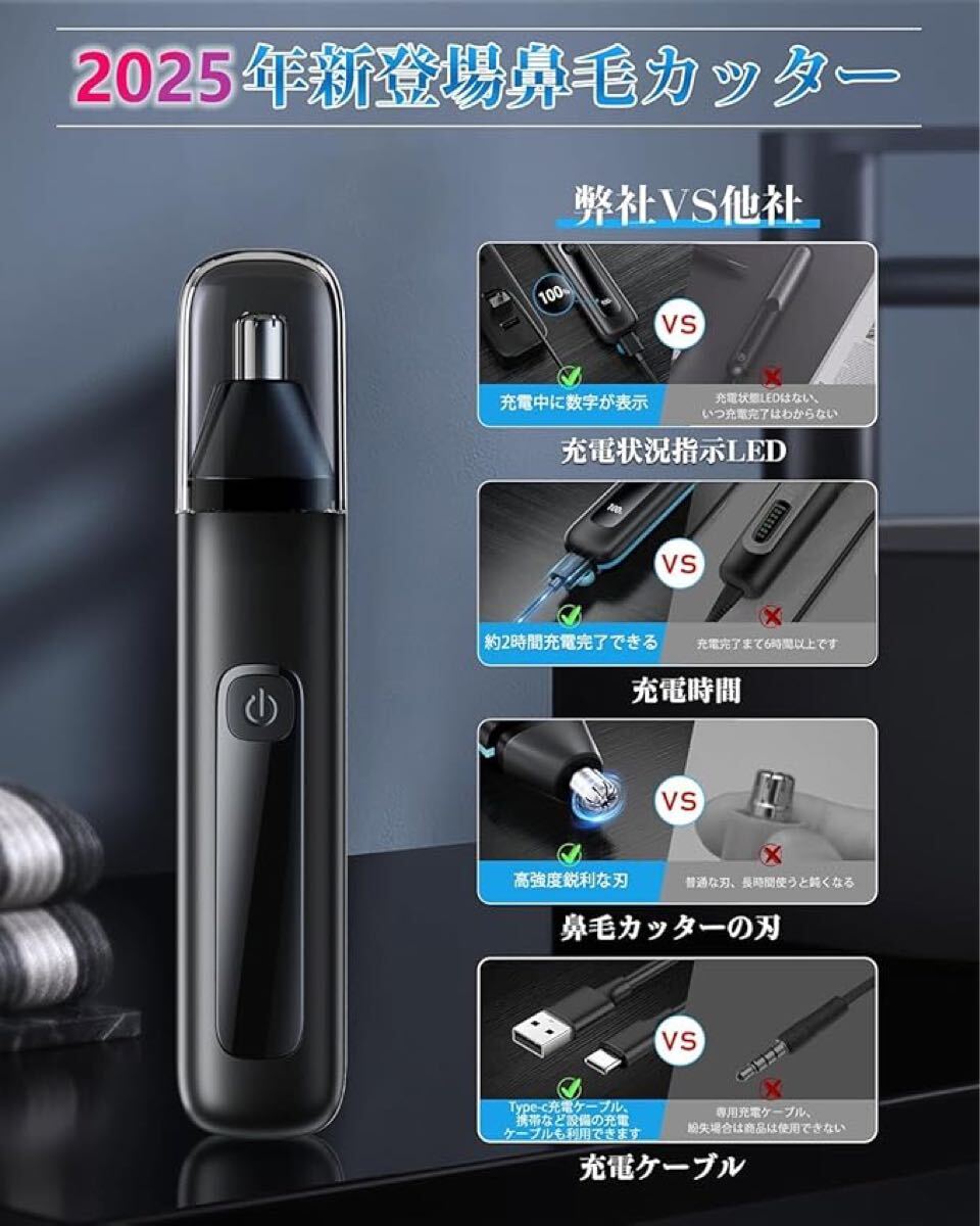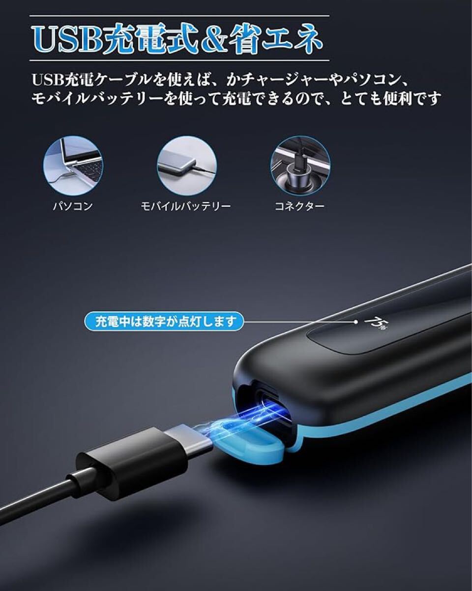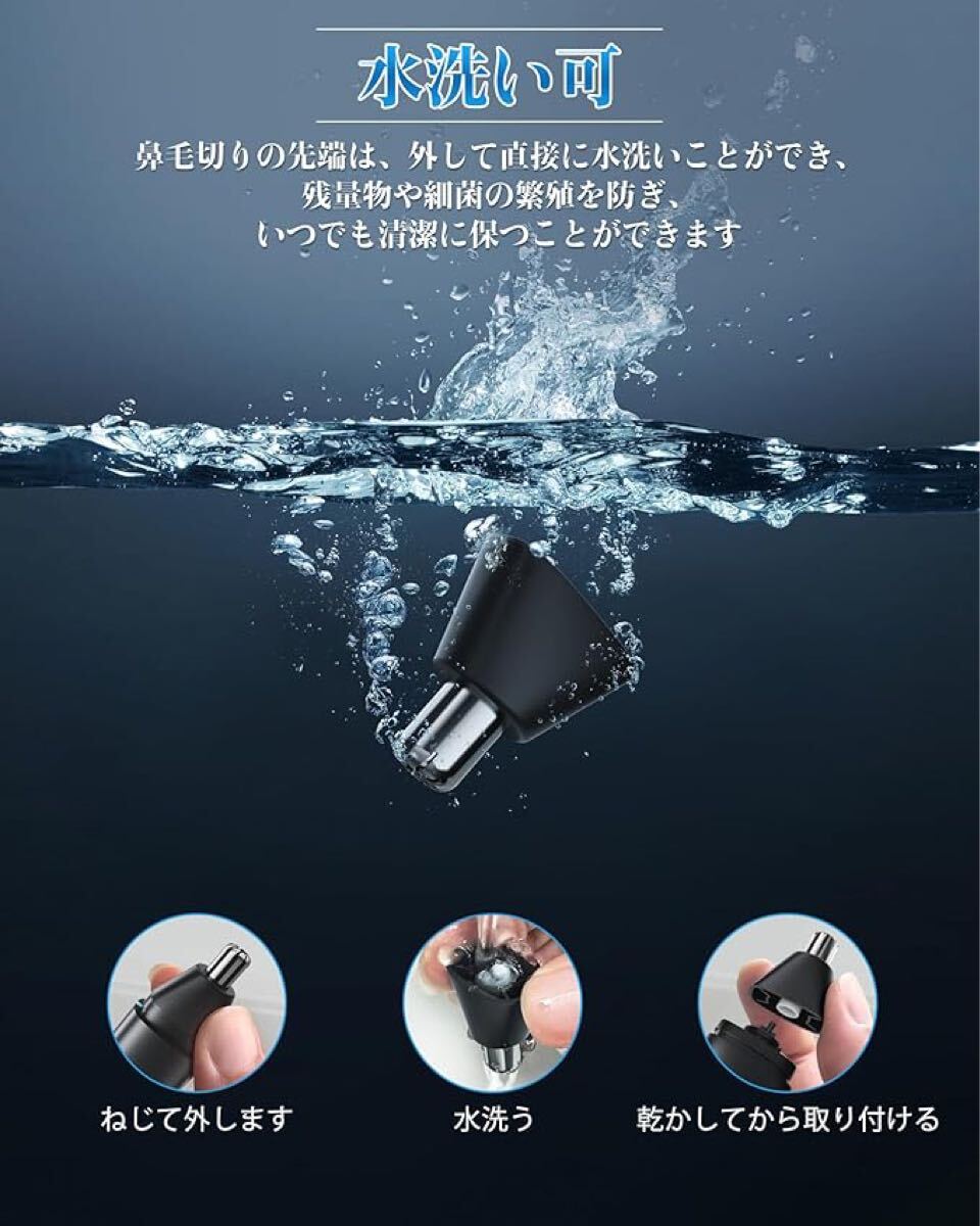 【IPX7防水】IPX7防水規格に準拠しており、安心して水洗いが可能です(充電ポートを除く)。鼻毛トリマーの先端は取り外し可能で、直接洗浄でき、残渣や細菌の繁殖を防ぎ、常に清潔を保ちます(本体は水洗い可能ですが、水中に浸さないでください)。