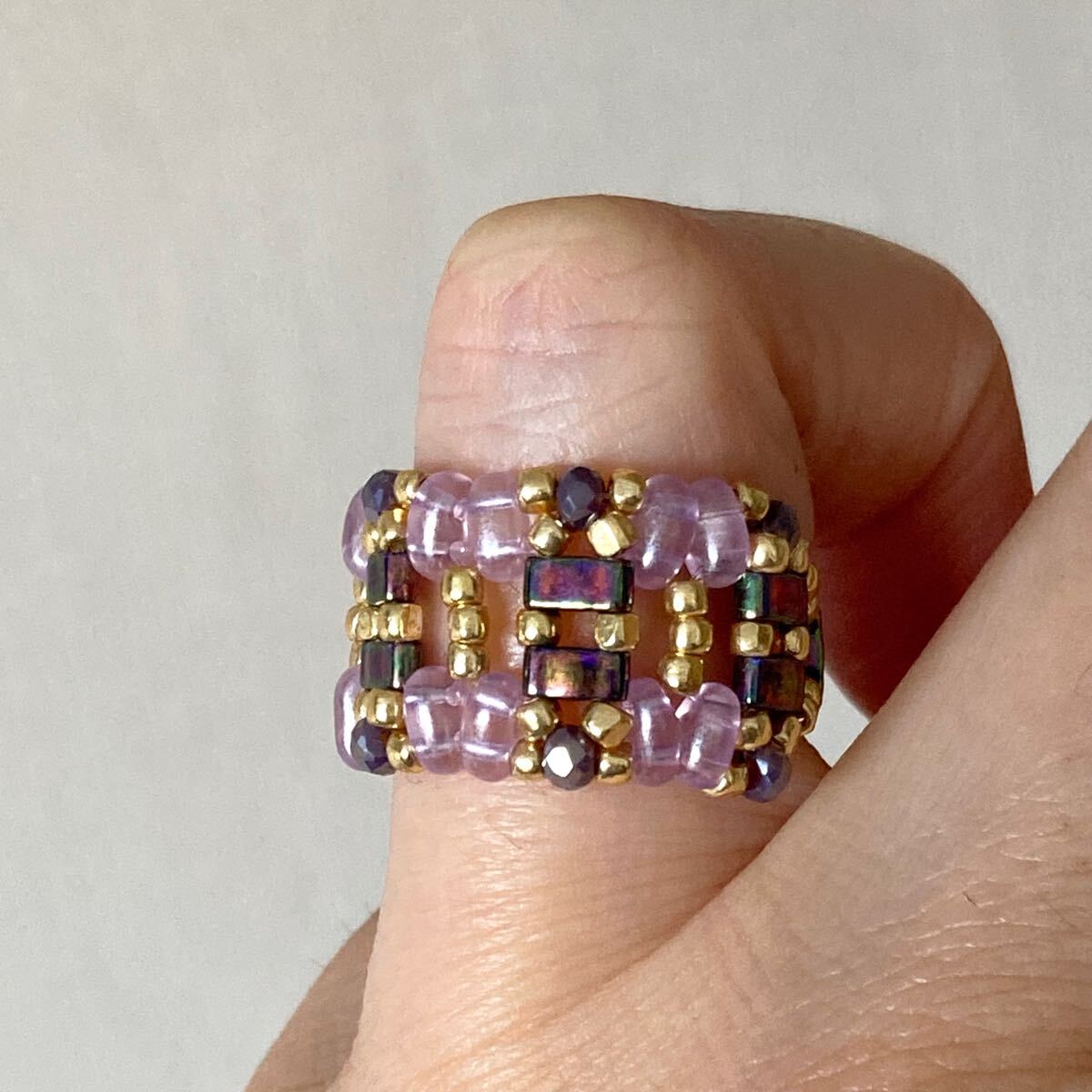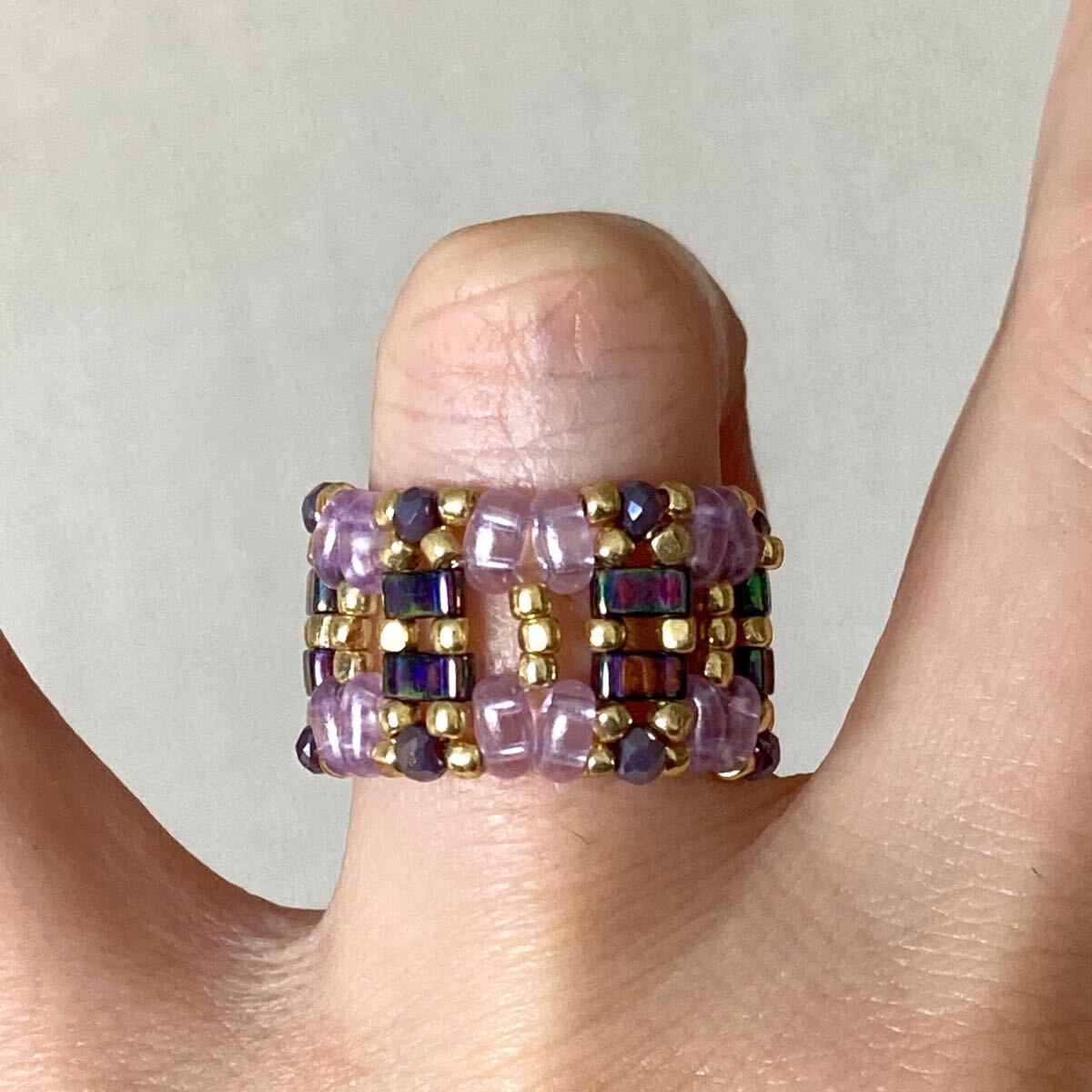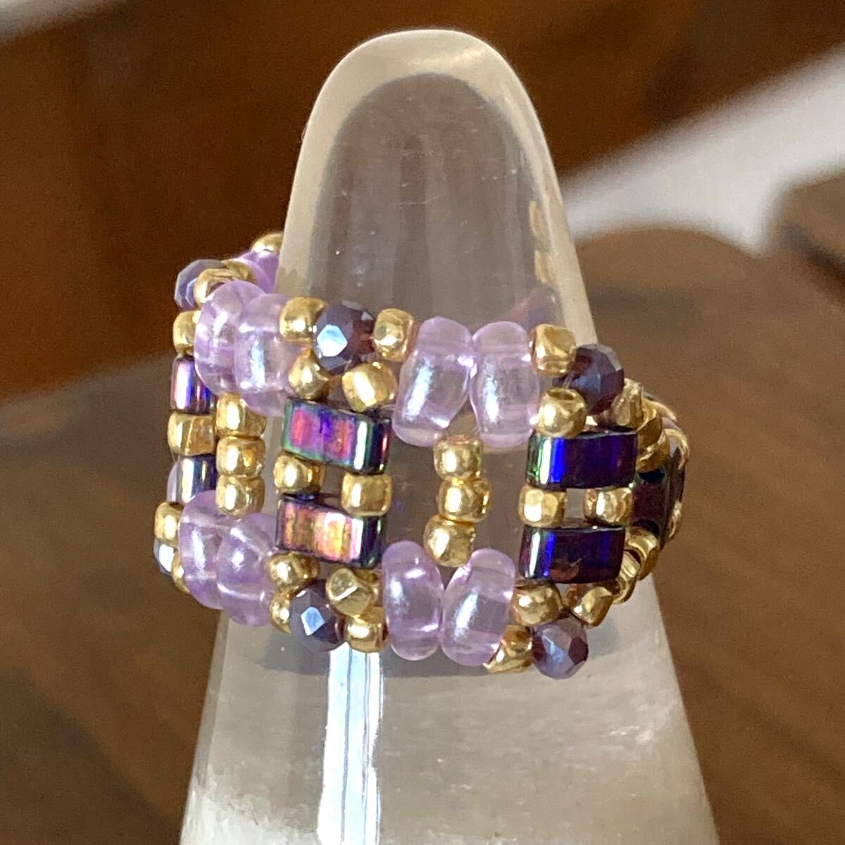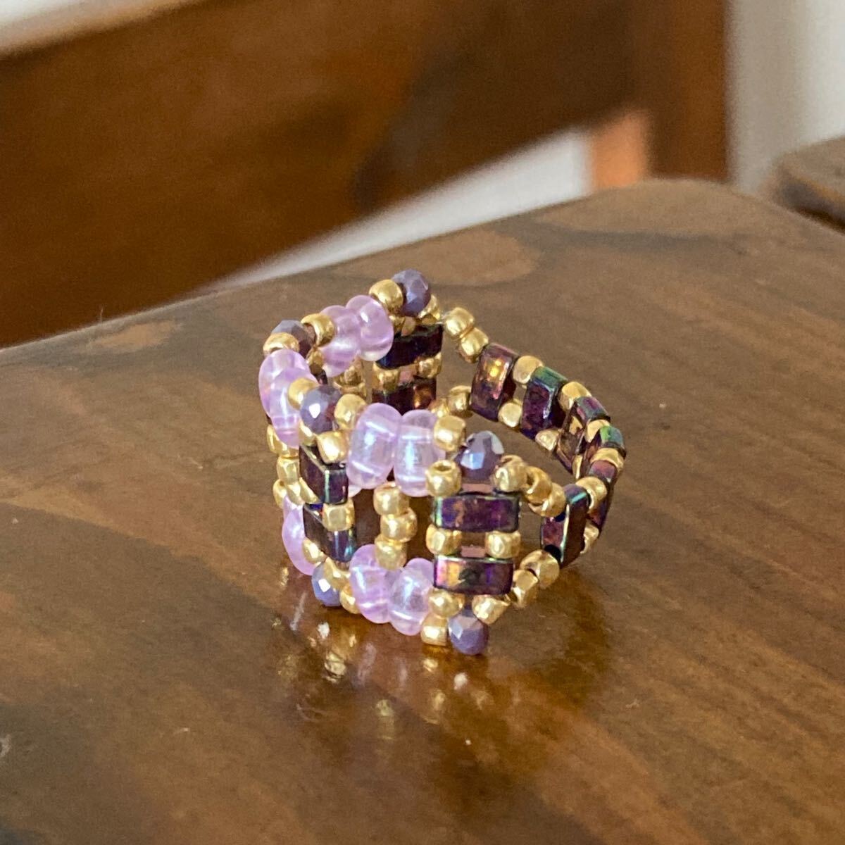 5mmの玉虫系パープルのハーフティラビーズ、薄いパープルのツインビーズ、パープルのミニボタンカットビーズ、ゴールドのスリーカットビーズで作ったリングです。