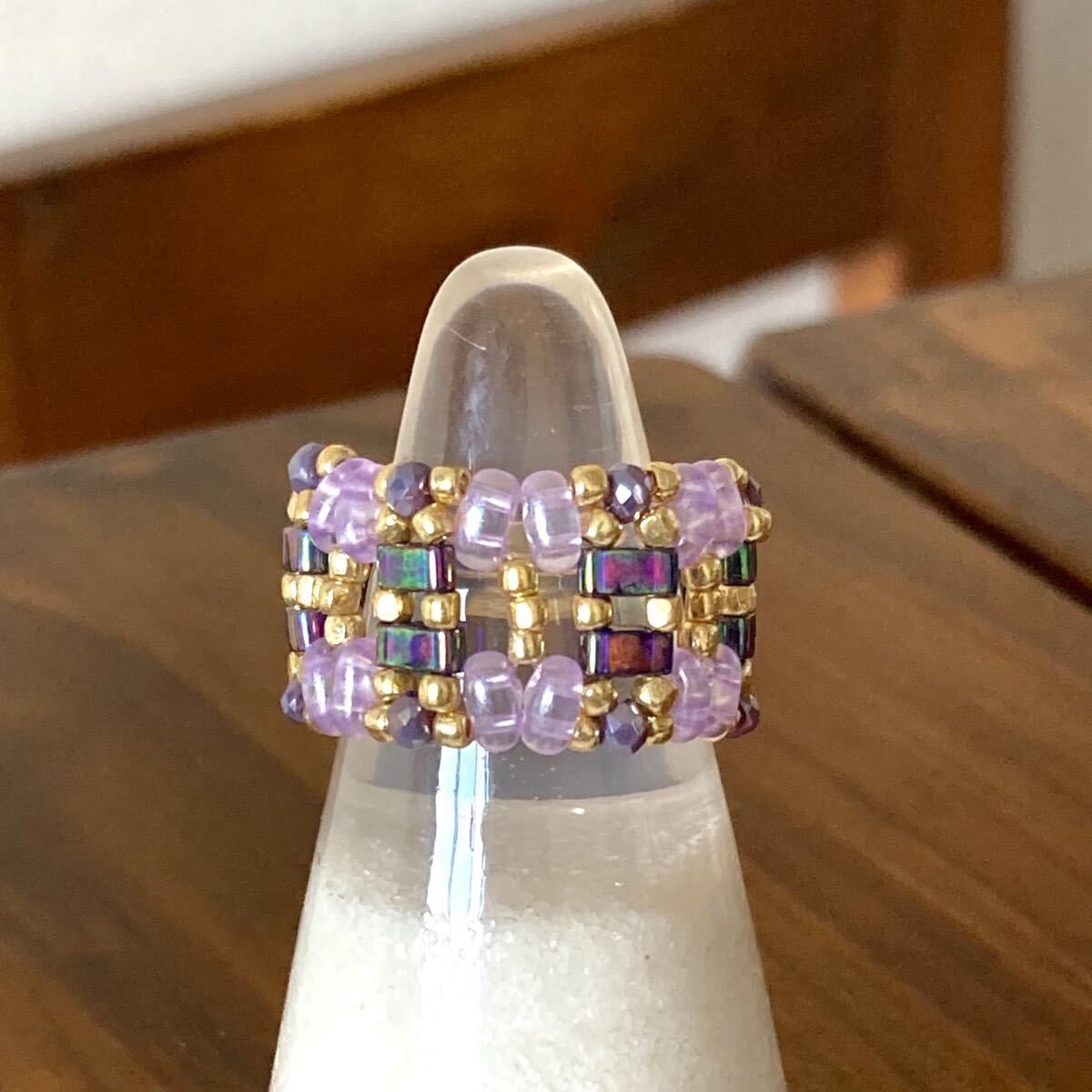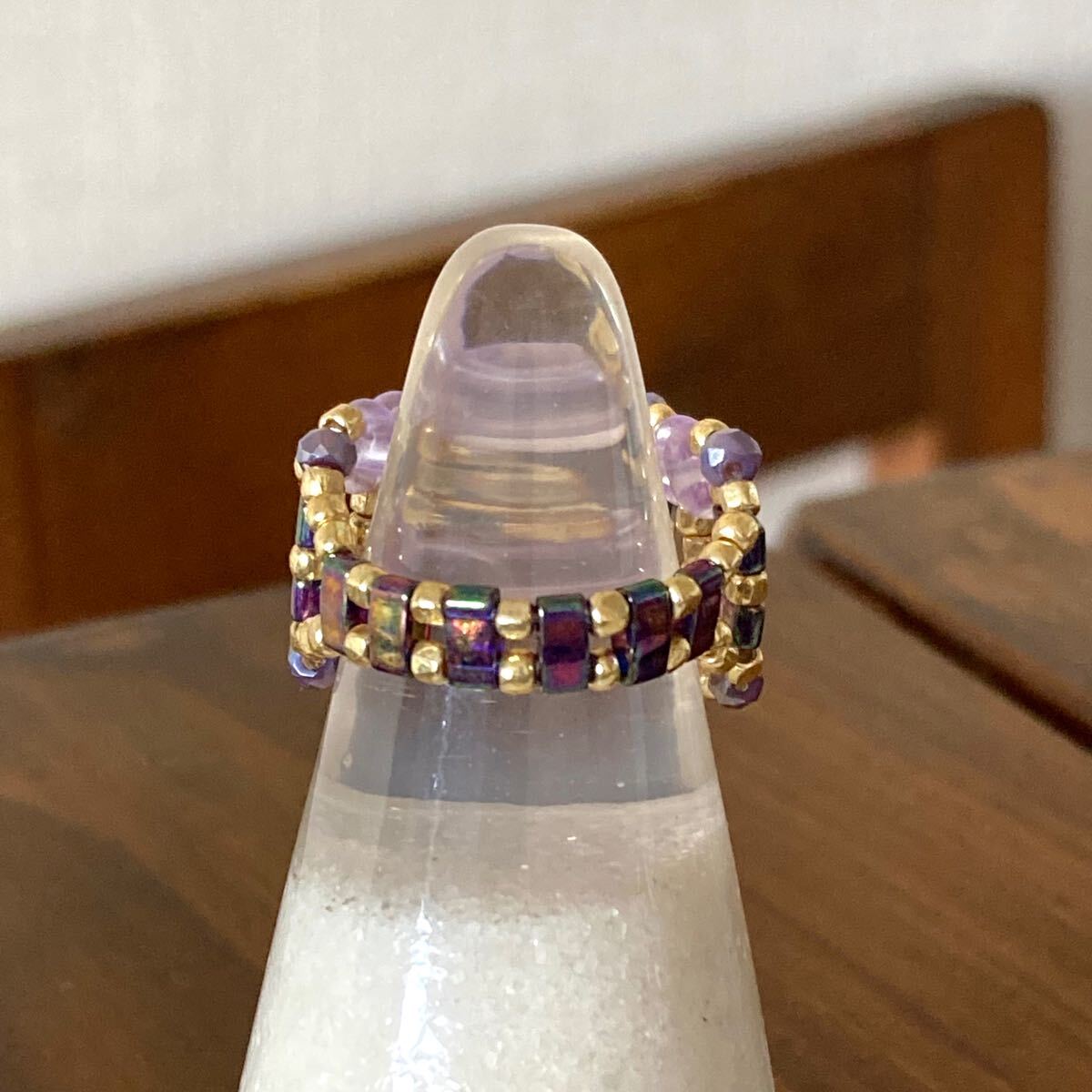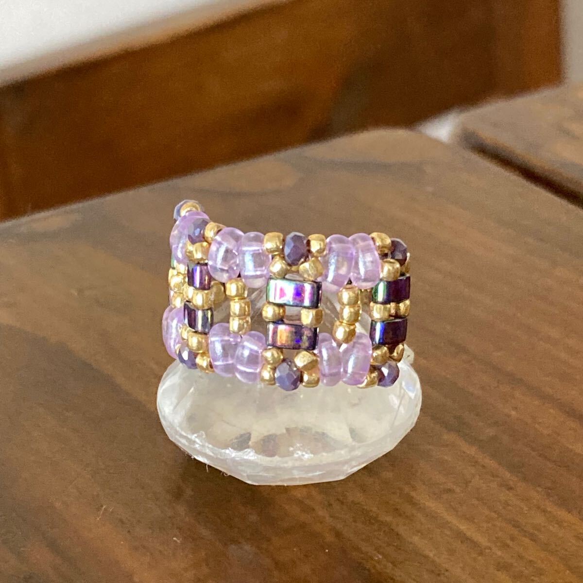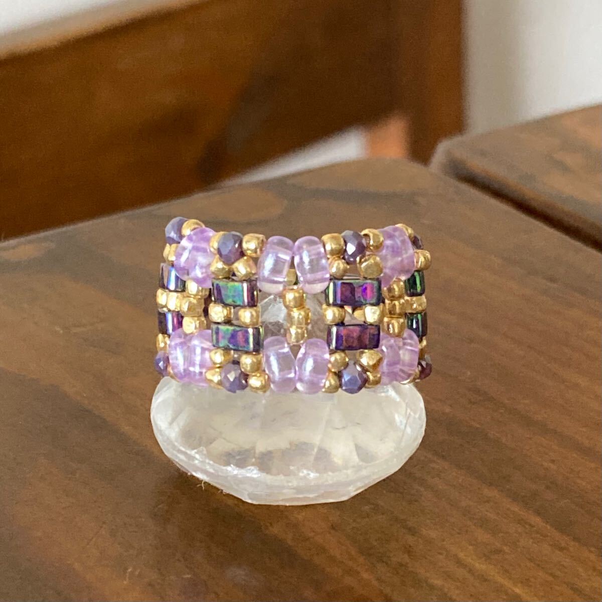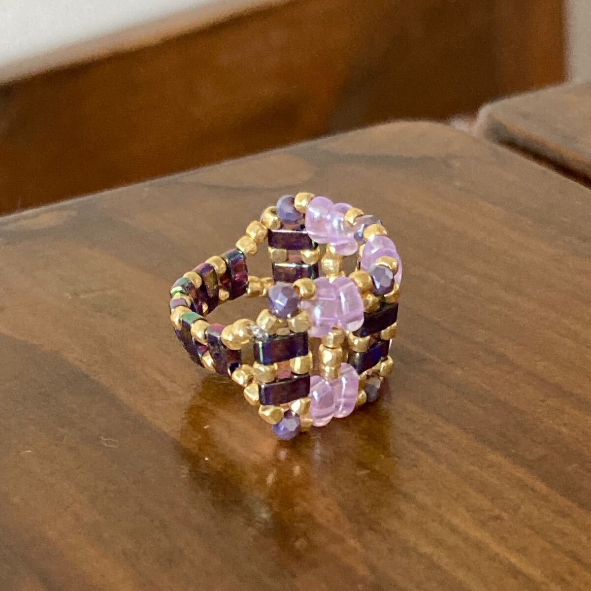5mmの玉虫系パープルのハーフティラビーズ、薄いパープルのツインビーズ、パープルのミニボタンカットビーズ、ゴールドのスリーカットビーズで作ったリングです。