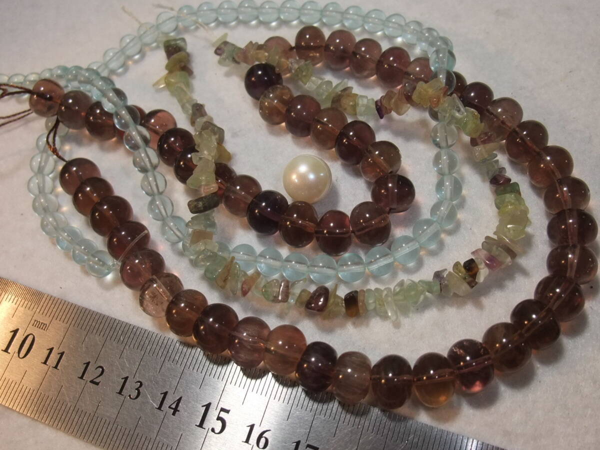 綺麗なバイカラーのルースもちらほら入った(出品によってバイカラーの感じと入る数が様々なので画像をご確認ください)品質の良いフローライト、人気のさざれ短連も入った2本セットと、大粒の白の淡水真珠両穴ルース、古い在庫のビンテージのアクアマリン色のラウンドグラスビーズ連材のお得なたっぷりセットです☆どれも古い時代の在庫のアソートですが、どれも近年価格が上昇しているので、セットでこの価格はとてもお得と思います☆ビンテージ仕様も含むとても古い保管品もあるため、未使用ではありますが、経年感や汚れ、擦れキズカケ連の乱れや鍍金の痛み、穴あけゆがみその他の難等あると思いますので、それをご了承いただける方にお願いいたします。