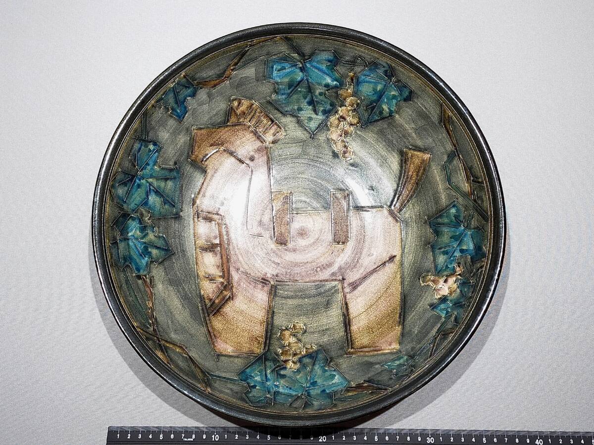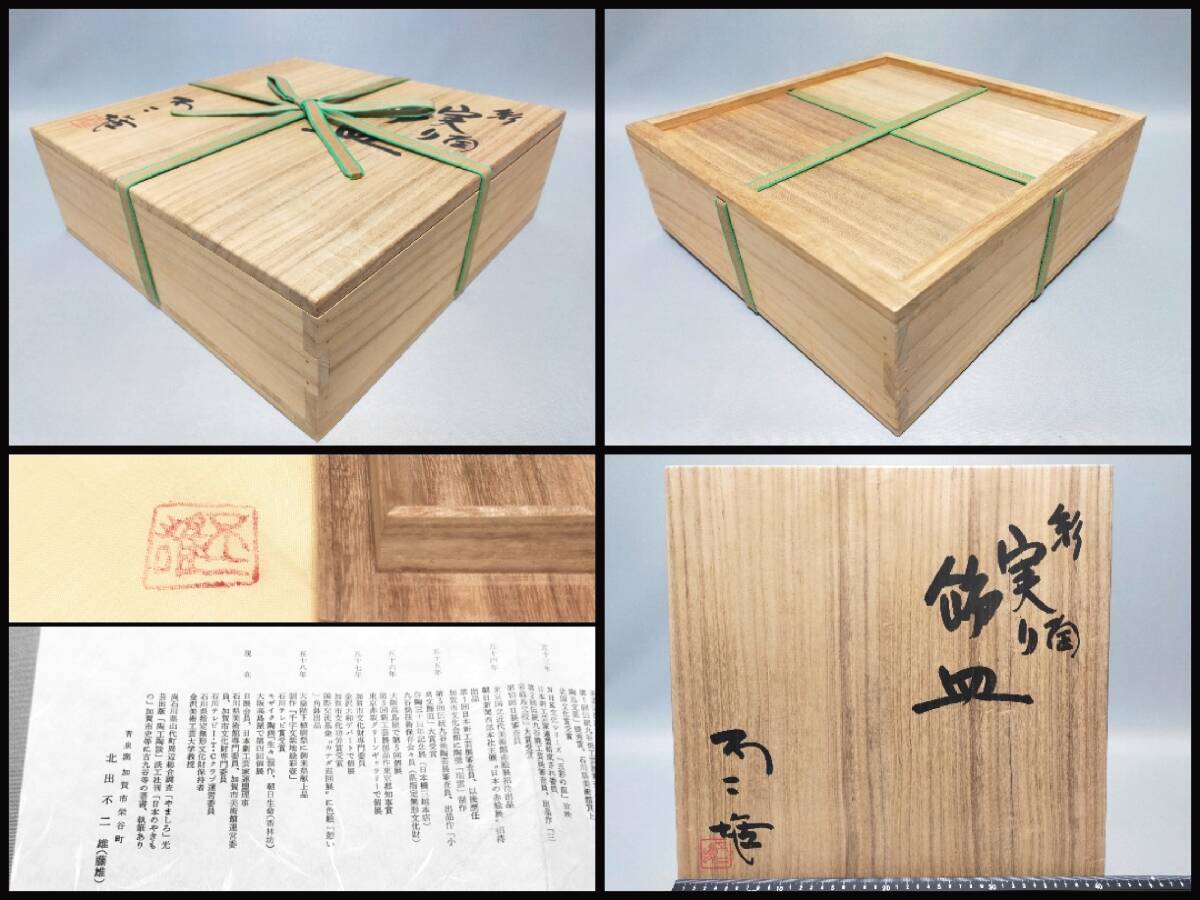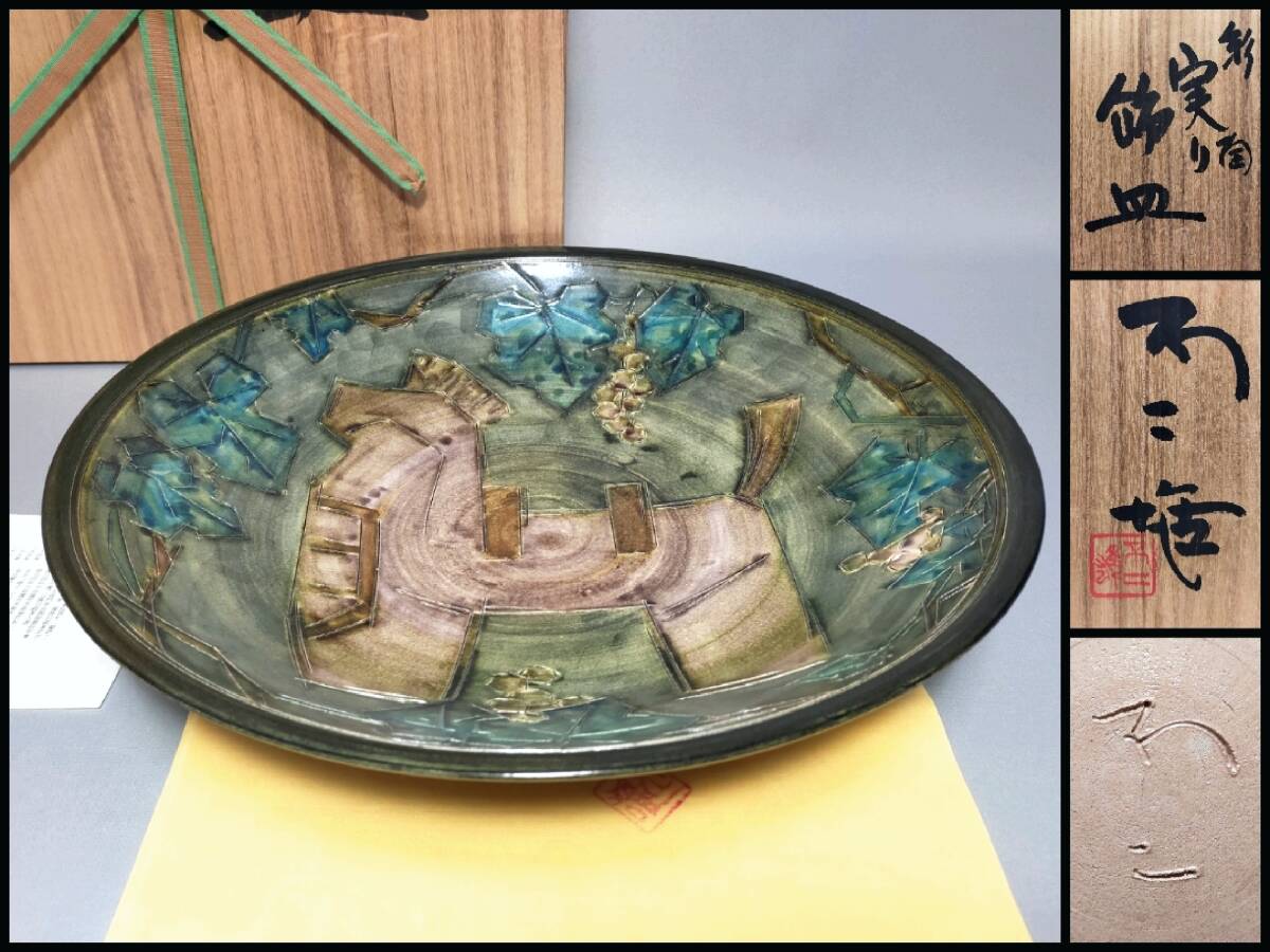 TN27 九谷焼 巨匠 北出不二雄 (藤雄)造 彩陶 実り 飾皿 刻線馬果実文大皿 幅37㎝ 栞・共布・共箱 モダン 希少