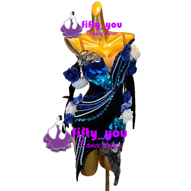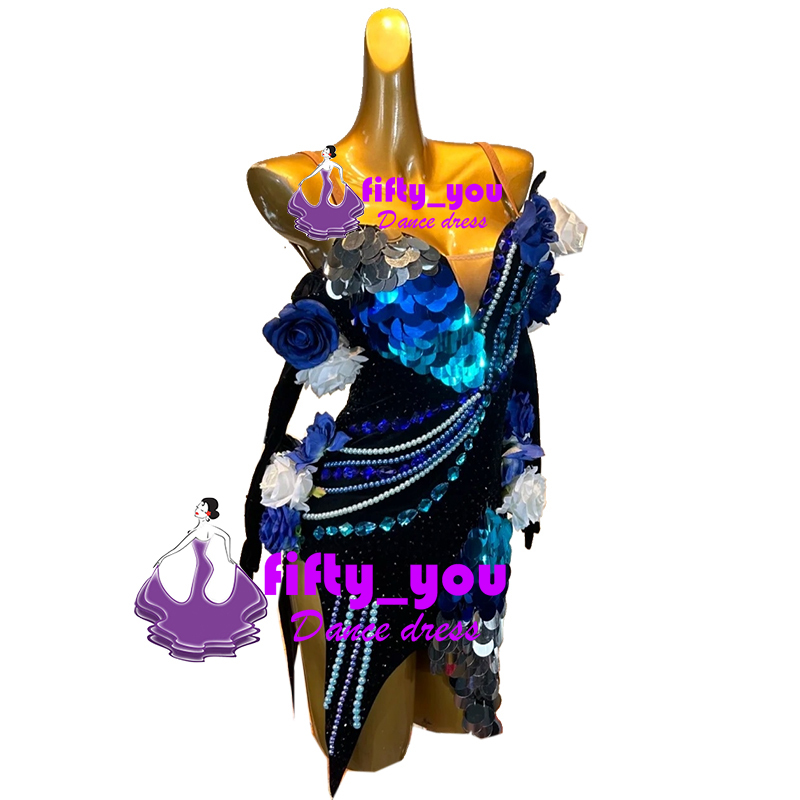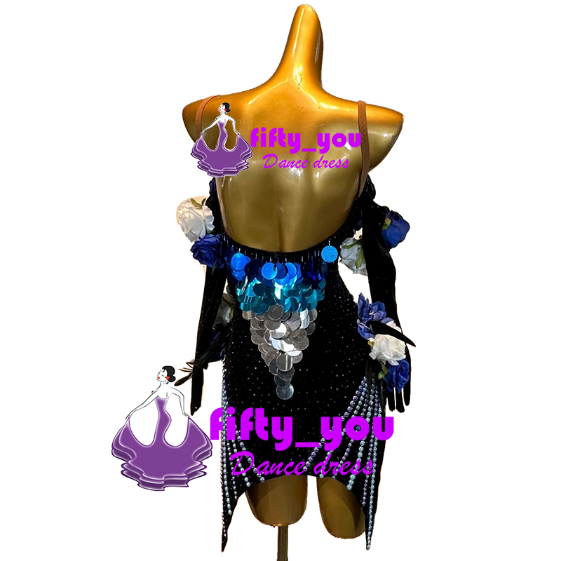 新品fifty_youレディース社交ダンス衣装 セミオーダー ラテン競技ドレス  高級ドレス お花飾り ビーズ付き 上品デザイン