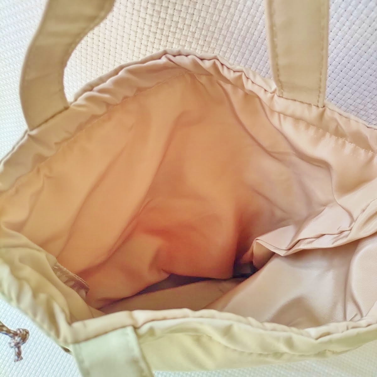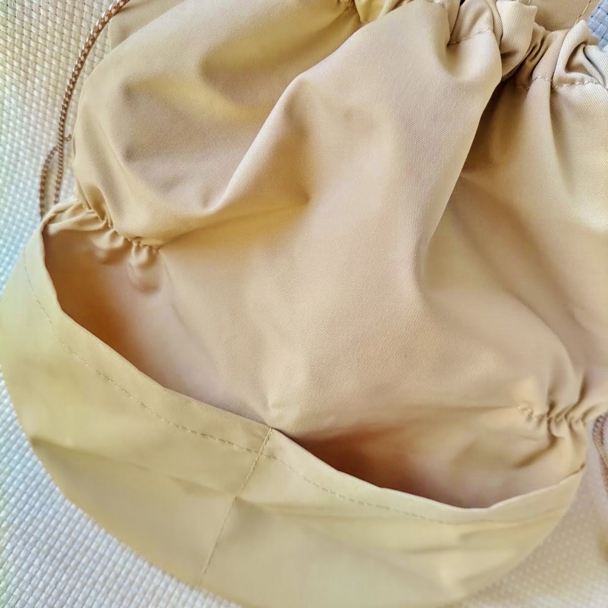 色は写真より濃いめのベージュで紐はブラウンと白