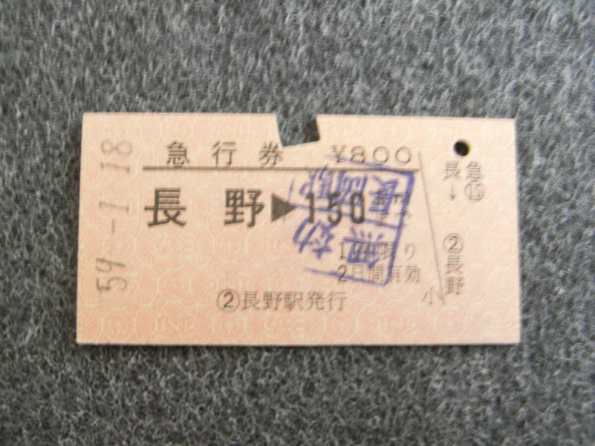 急行券 長野→150kmまで 昭和59年1月18日 長野駅発行 国鉄