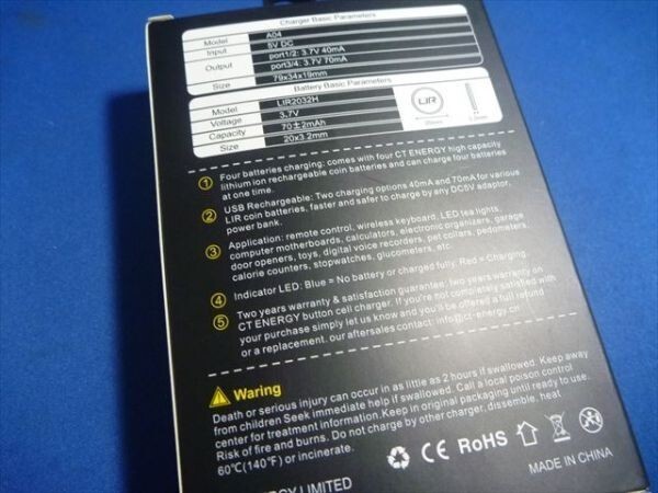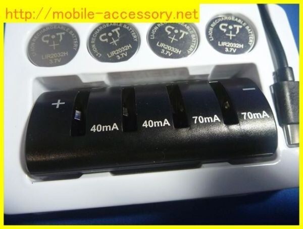 | 商品説明 | 充電できるコイン型のリチウムイオン電池4個と充電器のセットです。 一般的な CR2032は使い捨てです。こちらは充電可能な電池です。 ボタン電池は容量が少ないのでバッテリ交換の頻度も高めです 長い目で見ればコストメリットもあります。 LEDライト、ポケモン GO プラスなどに ボタン電池はもともと容量のすくないものですので、すぐに充電完了します。 二次電池ですから専用充電器で繰り返し使えます、サイクル回数は「500回~700回程度」ですが、過放電保護機能は持ちませんので十分に気を付けてください!(※2.5V以下まで放電すると充電しても復活しません) 電池保管時には、電極が接触してショートしないように気をつけてください。 CR2032とほぼ同規格ですので、これから使い捨てしなくてすみます。 LiLyPad用の電池など、LEDを幾つか光らせたいときなどに便利です。 LEDライトなどならそのまま代替出来ます。 CR2032、CR2025、1632、などのタイプの充電可能電池にも対応できます |