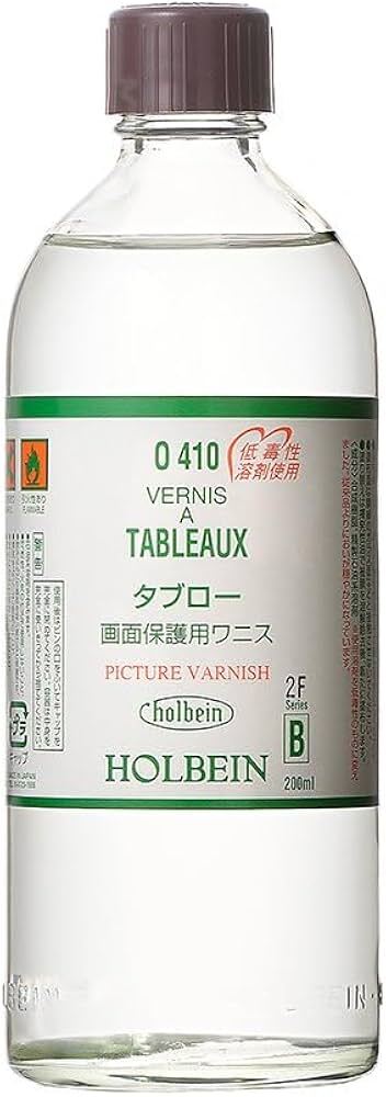 油彩画用液(画面保護用ワニス)特殊合成樹脂をペトロールで溶解したワニスです塗膜が強く、塗り替え時の再溶解性に優れています通気性がないため、使用は作品の完成後(目安は完成から6~12ヶ月後)に限り雨天などの湿度の高い日には塗布膜が白く濁ることがあるので避けてください後日、揮発性油で古い塗膜を除去し、塗り替えることができます外観:無色透明液体主用途:作品乾燥後の画面保護、光沢の付与成分:合成樹脂、石油系溶剤沸点:154~194℃引火点:43.5℃