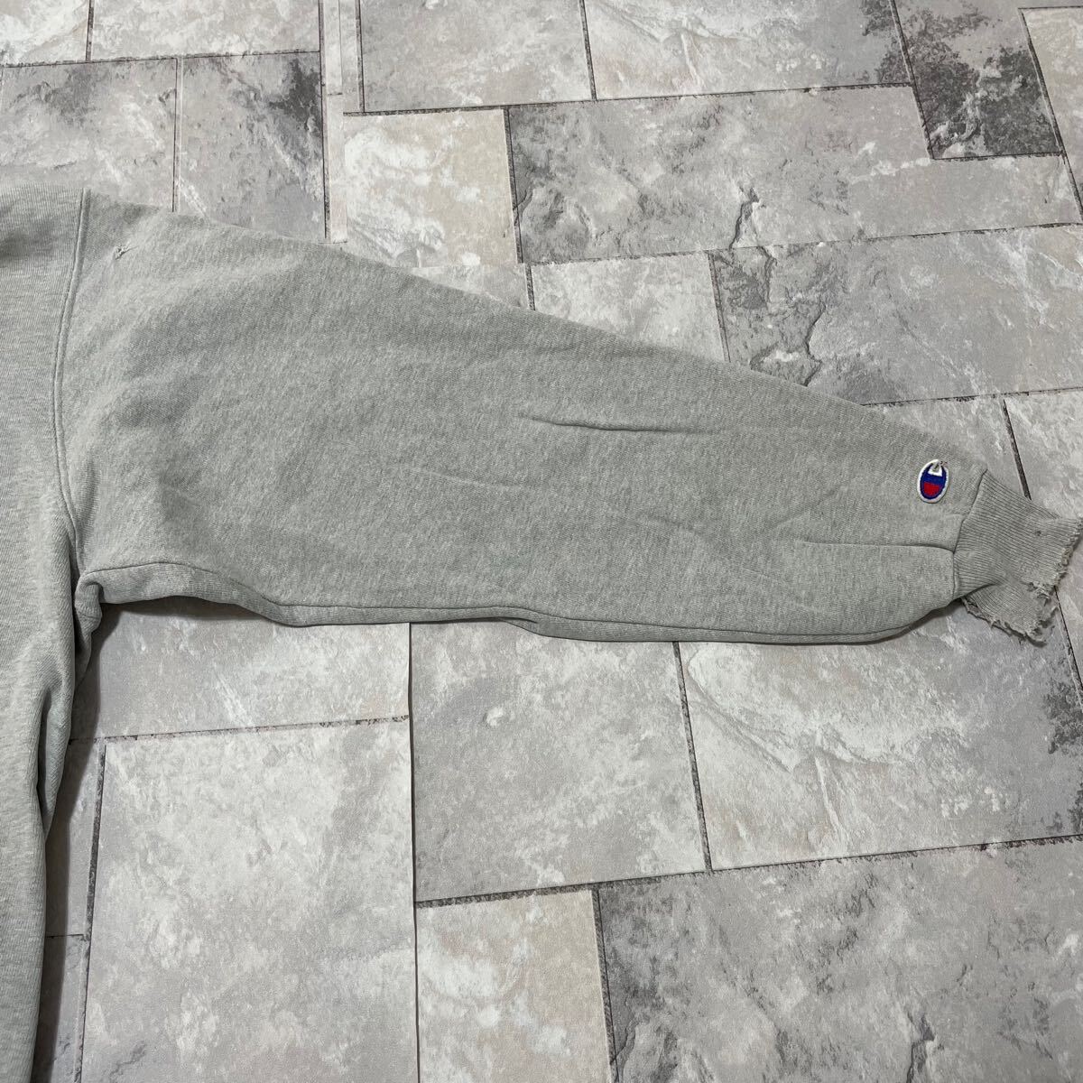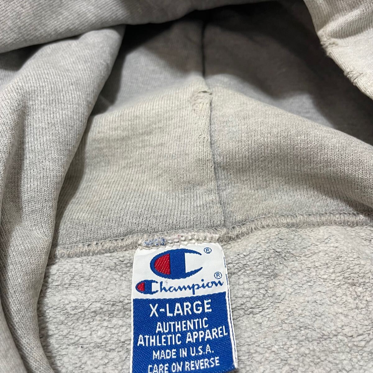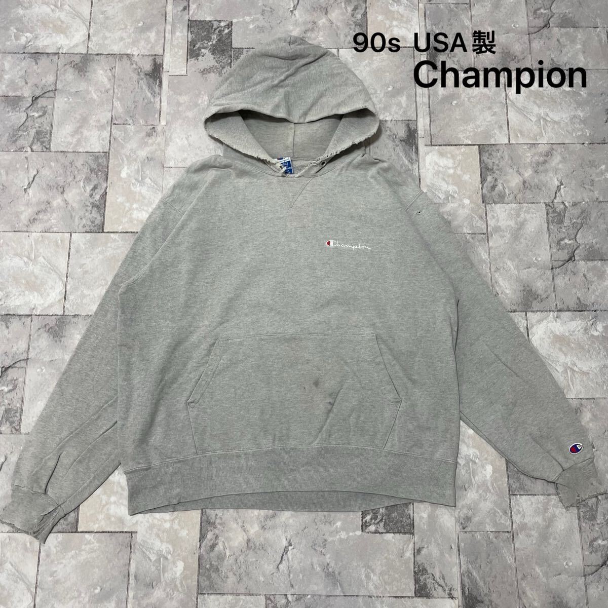 90s USA製 Champion チャンピオン sweat hoodie スウェットパーカーフード プルオーバー 刺繍ロゴ ヴィンテージ Vガゼット グレー サイズXL 玉FL3875