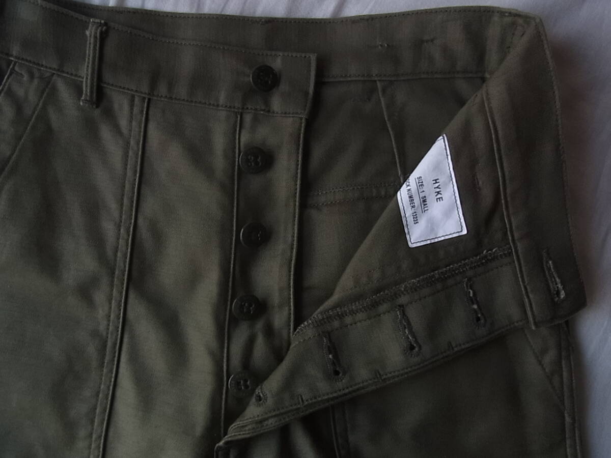 HYKE ハイク コットンバックサテン素材 ハイウエスト ミリタリー ベイカーパンツ サイズ 1 SMALL 日本製 ミリタリーオリーブ