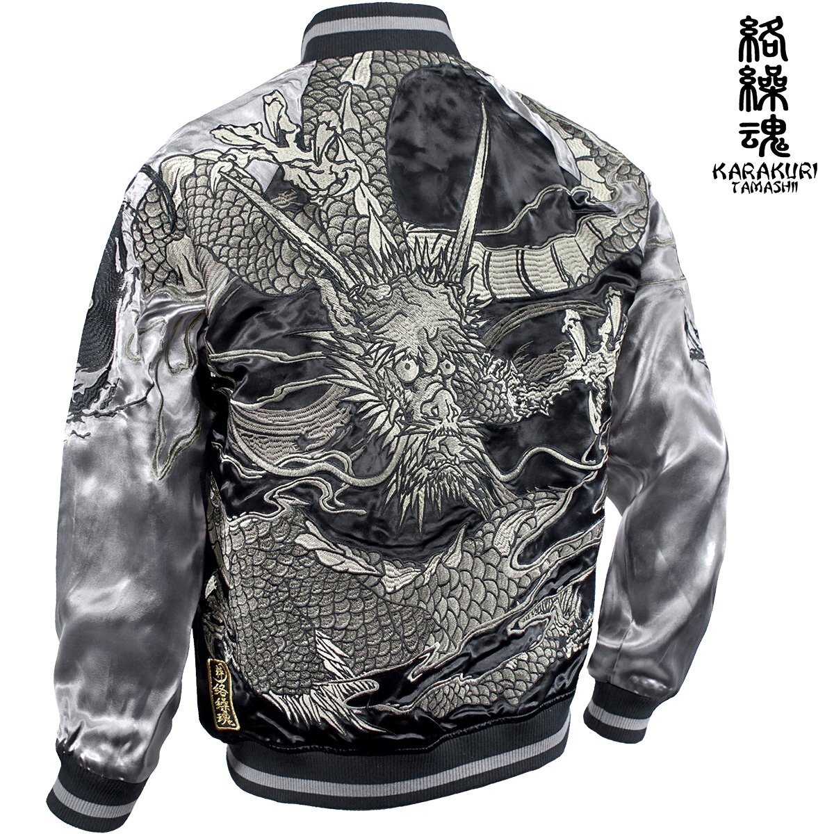 244132-25 絡繰魂 粋 スカジャン 八方睨みの龍 和柄 リバーシブル 刺繍 フルジップ サテン光沢ブルゾン メンズ(ブラック黒シルバー銀) M