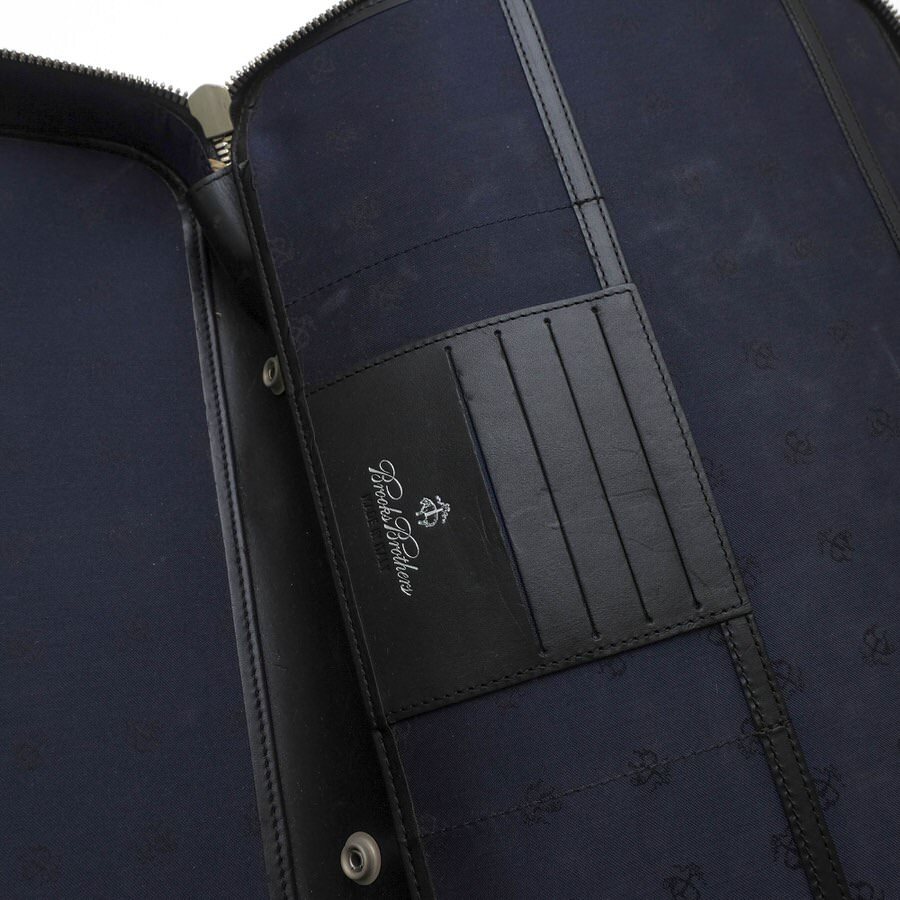 A4サイズの書類がすっきりと収まるサイズ感で、ビジネスシーンでの使用に最適なブルックスブラザーズのブリーフケース。本体のフラップ部分には鍵付きの錠前があり、大切な資料を安心して持ち運べます。内部には効率的な収納が可能な仕切りとカードケースなどビジネスツール収納が付いており、必要な物を整理しやすくなっています。シックで洗練されており、素材感も高品質で、プロフェッショナルな印象を与えます。 |