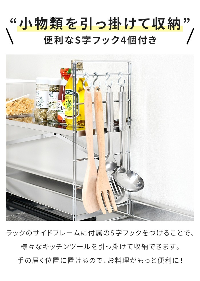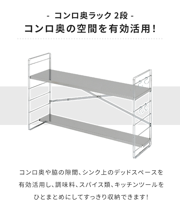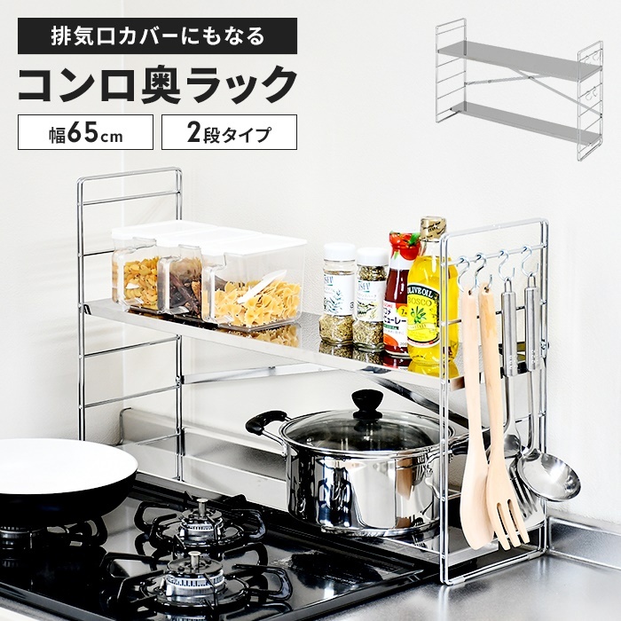 | コンロ奥ラック ステンレス製 日本製 多機能ラック 調味料ラック 幅65cm 2段 キッチンラック 排気口カバー S字フック付き ステンレス製コンロ奥ラック ステンレスラック 収納ラック オープンラック スリムラック キッチン用品 スパイス収納 コンロ奥 便利 調理器具置き シンプル スタイリッシュ 国産 シルバー |