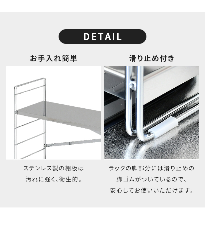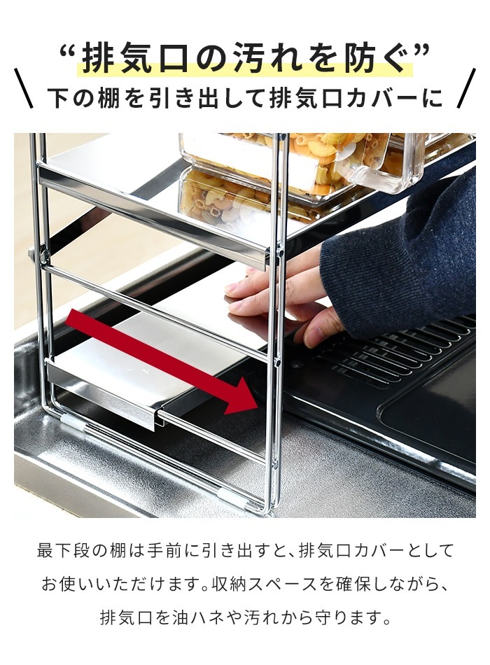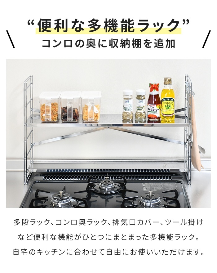 | コンロ奥の隙間を有効活用!排気口カバー付きコンロ奥ラック (60cmコンロ用) コンロ奥ラックに収納+排気口カバー+ツール掛けの3つの機能をプラス。 汚れをカバーしながらキッチン周りをすっきり整頓できる優れもの。 最下段の棚は排気口カバーとして使用でき、魚焼きグリルを使用時はカバーをスライドさせるだけでOK。 棚板は汚れに強いステンレス製、すぐに取り外してお手入れできるので衛生的。 安心の日本製ラック。 |