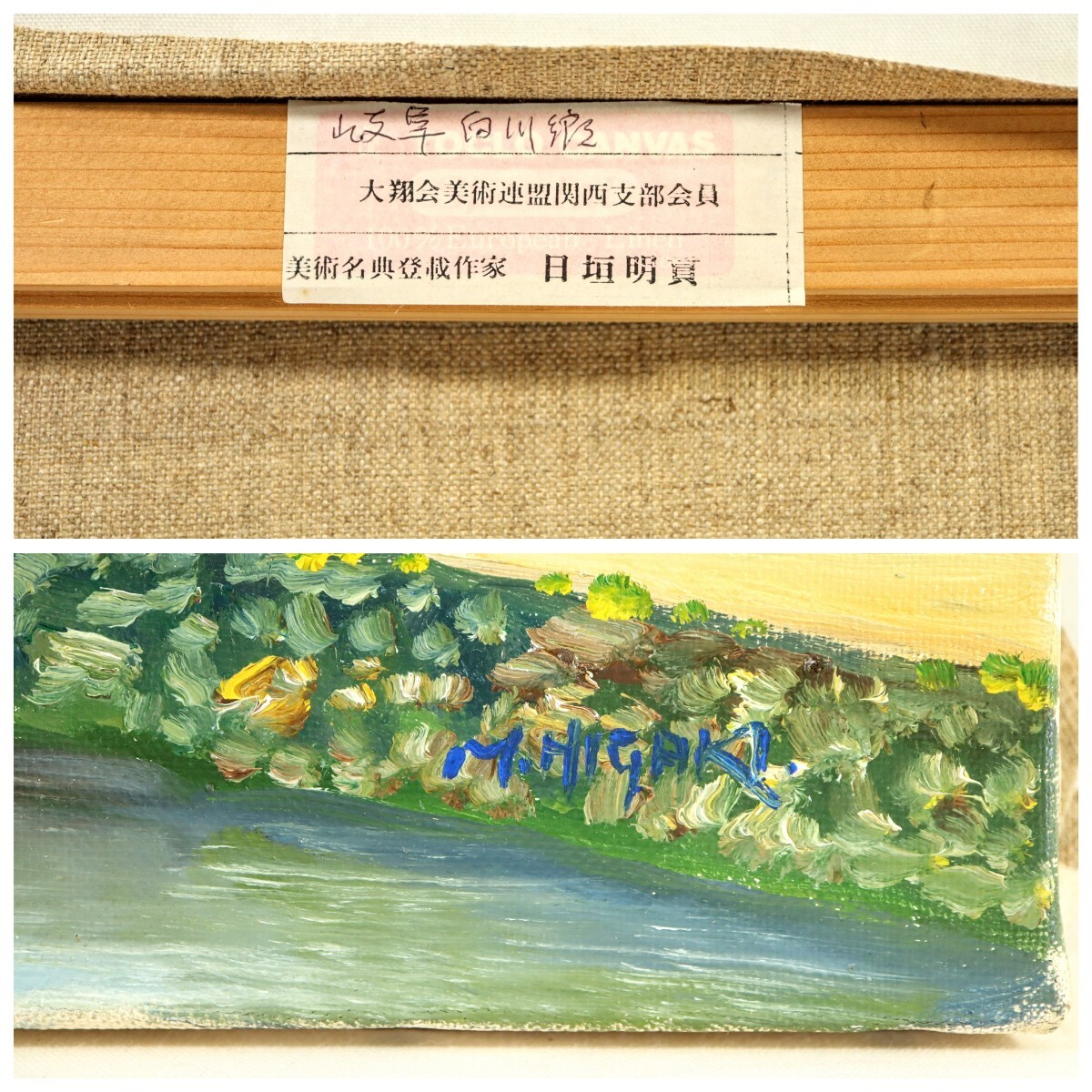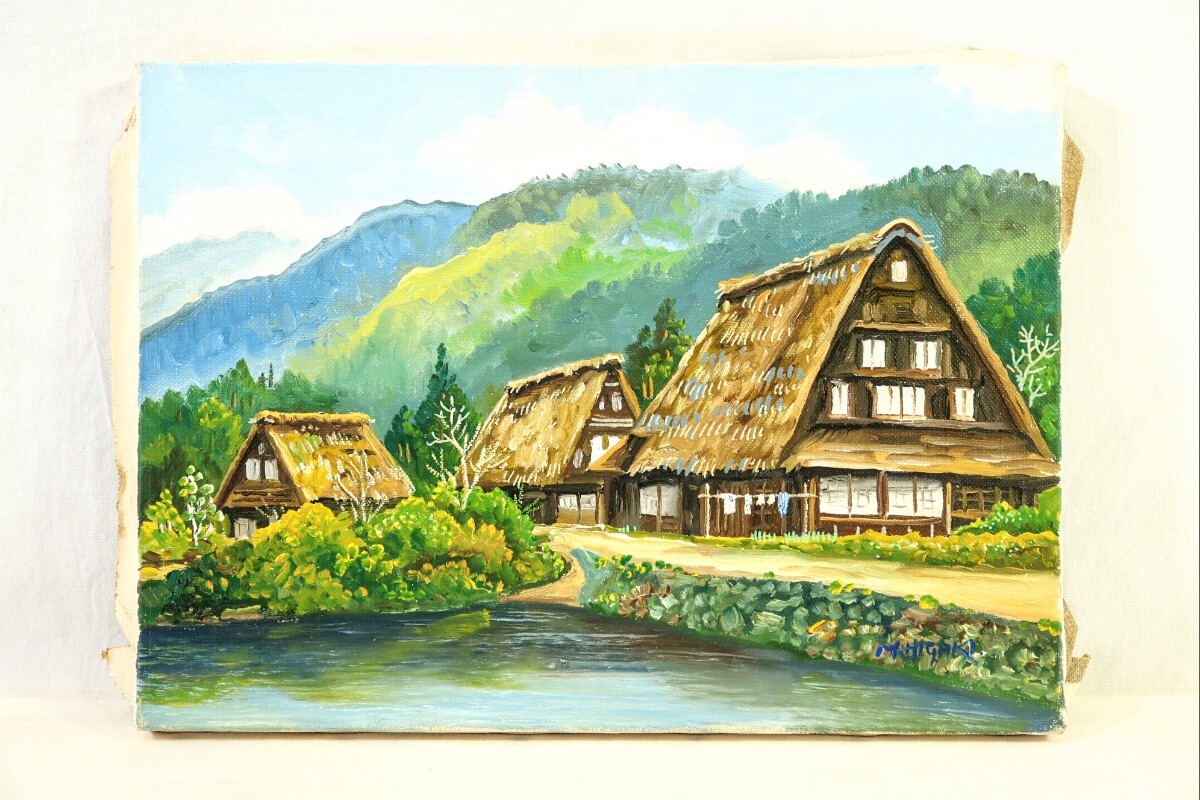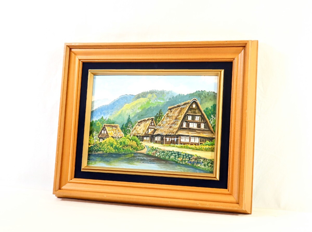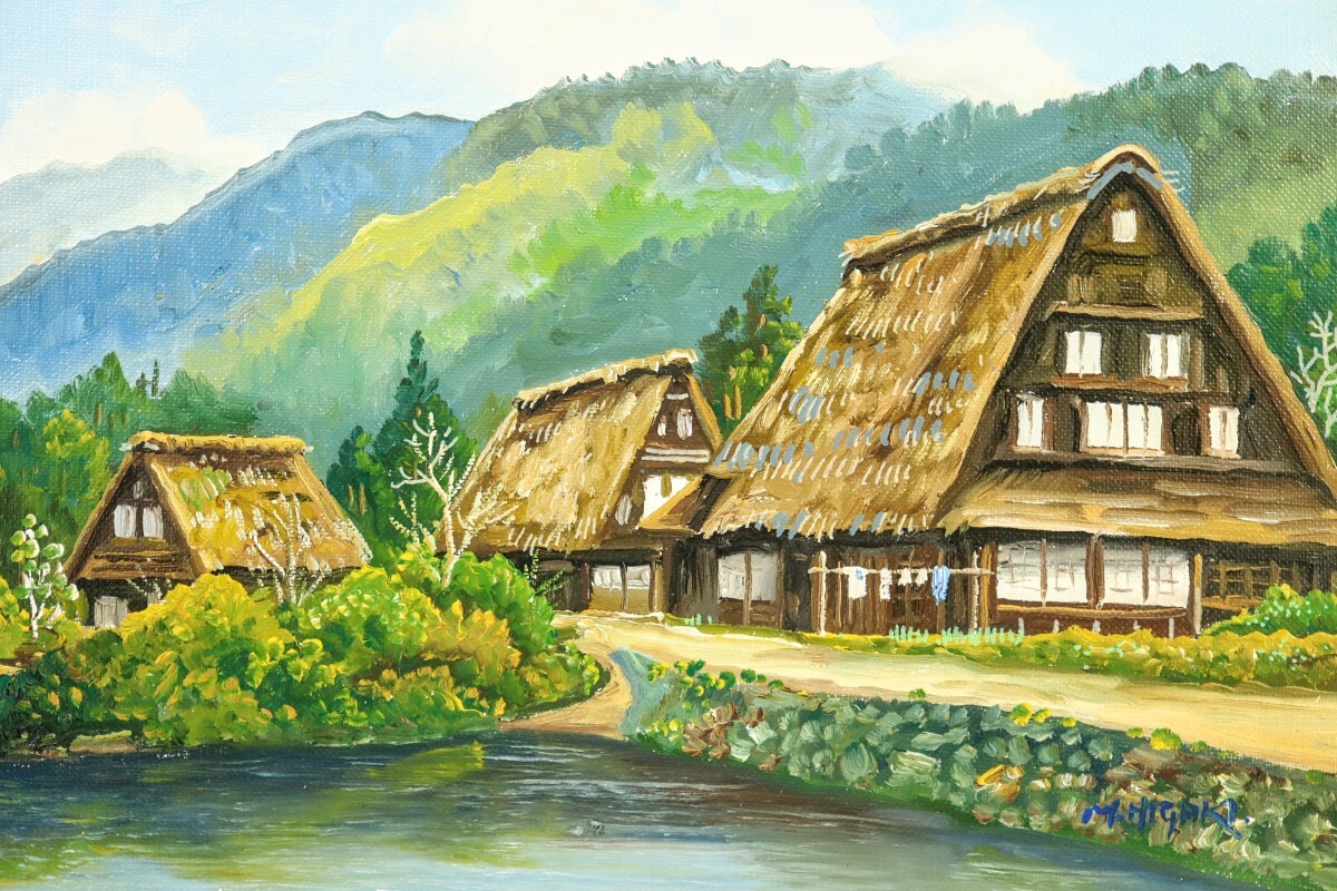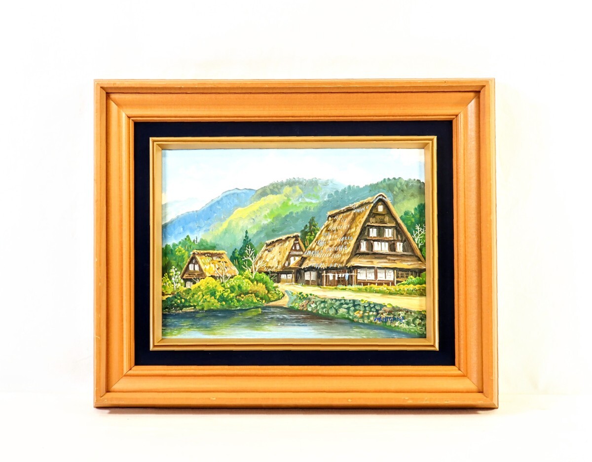 真作 日垣明貫 油彩「岐阜 白川郷」画寸 F4 大阪府出身 大翔会関西支部員 新緑の山並みと茅葺き屋根の古民家 長閑な日本の原風景 10216