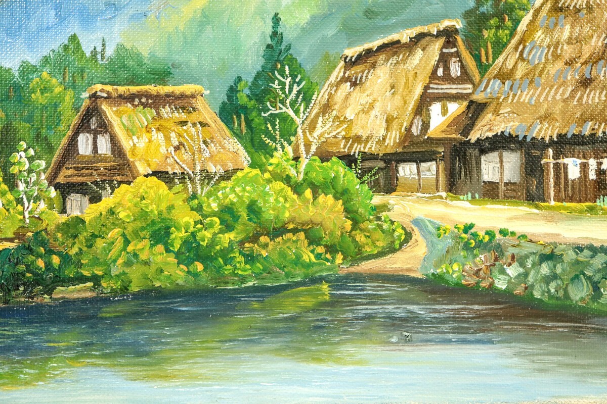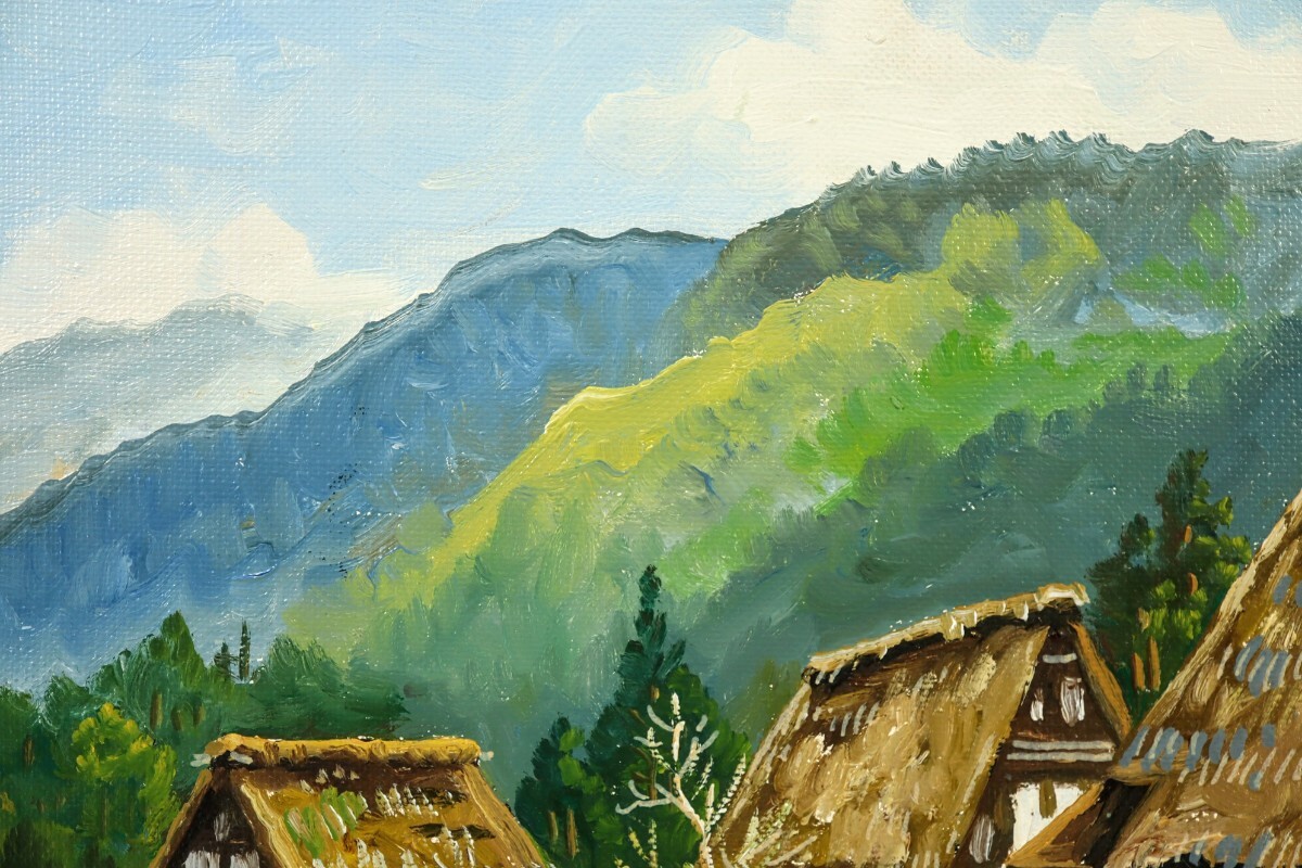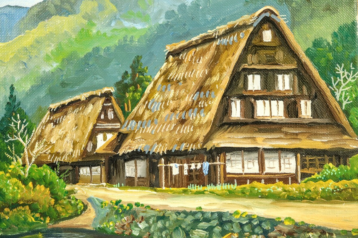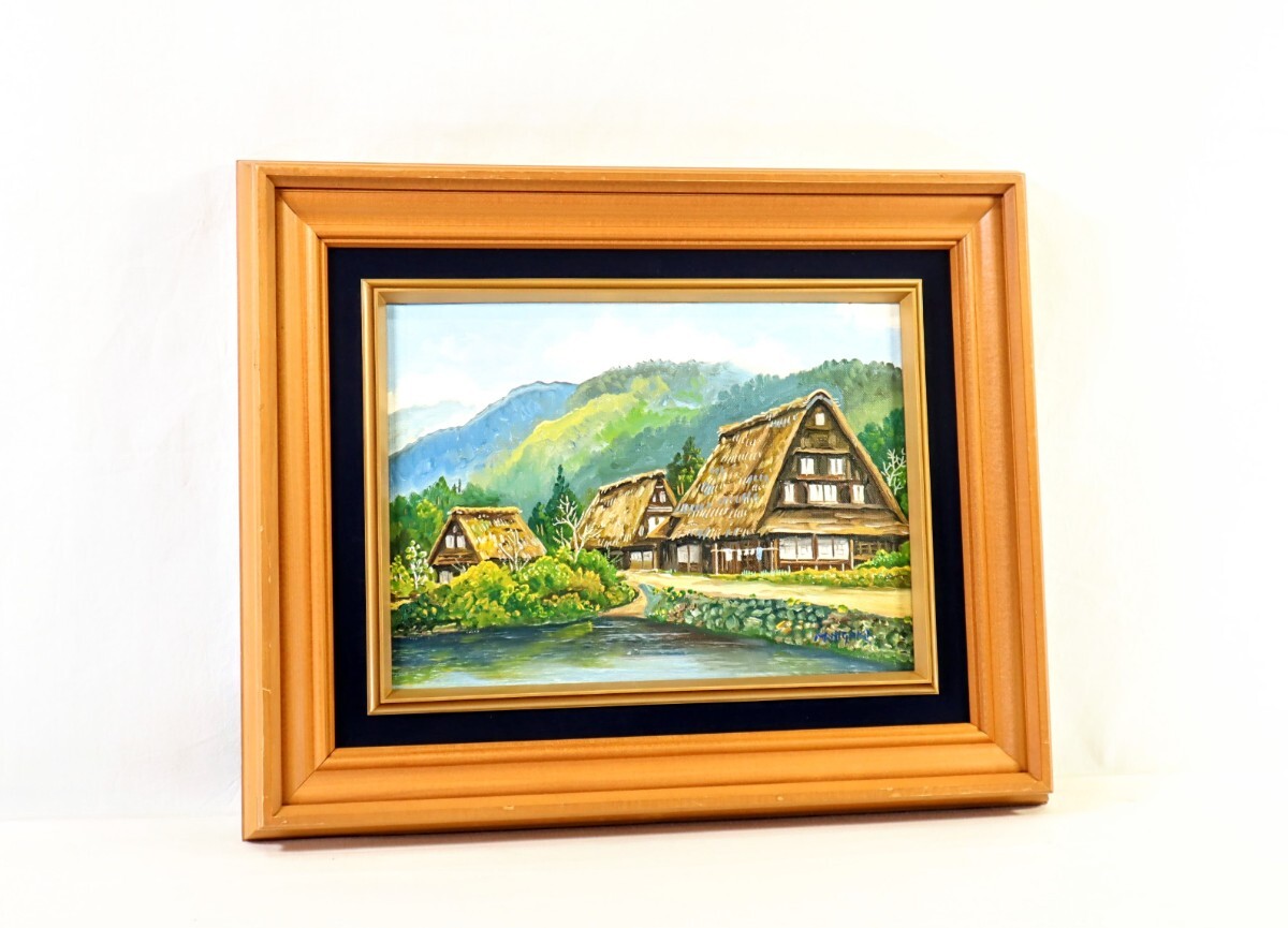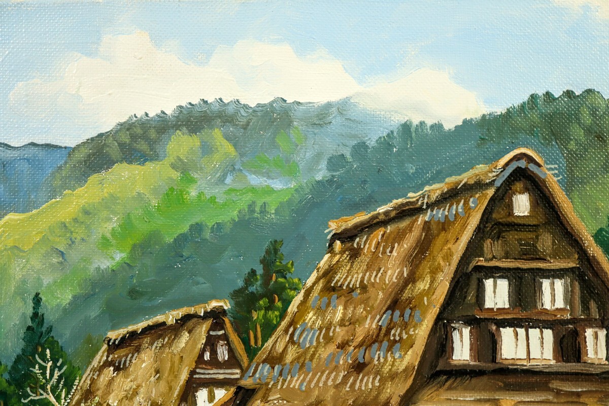 真作 日垣明貫 油彩「岐阜 白川郷」画寸 F4 大阪府出身 大翔会関西支部員 新緑の山並みと茅葺き屋根の古民家 長閑な日本の原風景 10216