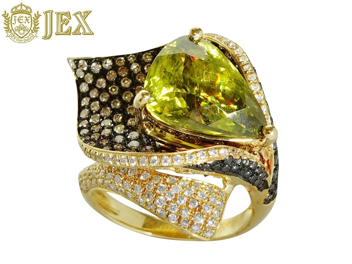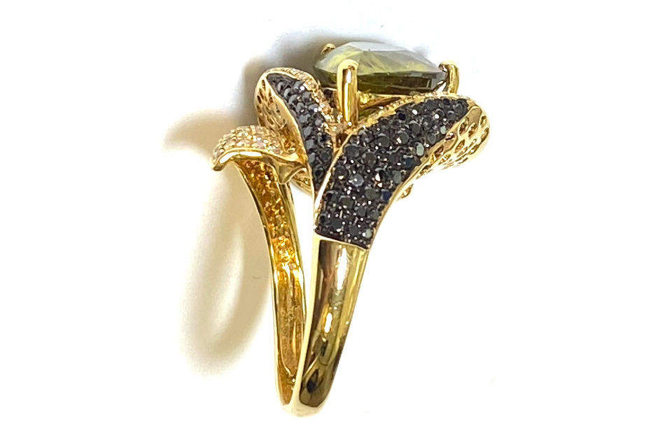解説 | 2色のダイヤを巧みに使い分け、スフェーンの虹色をドラマティックに香らせるカラーの花一輪。シックでお洒落通の方に・・・! |