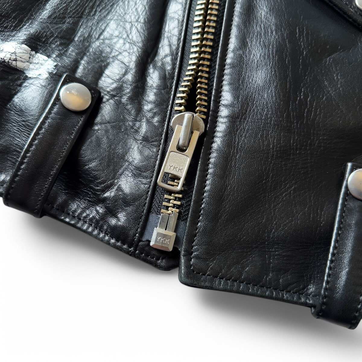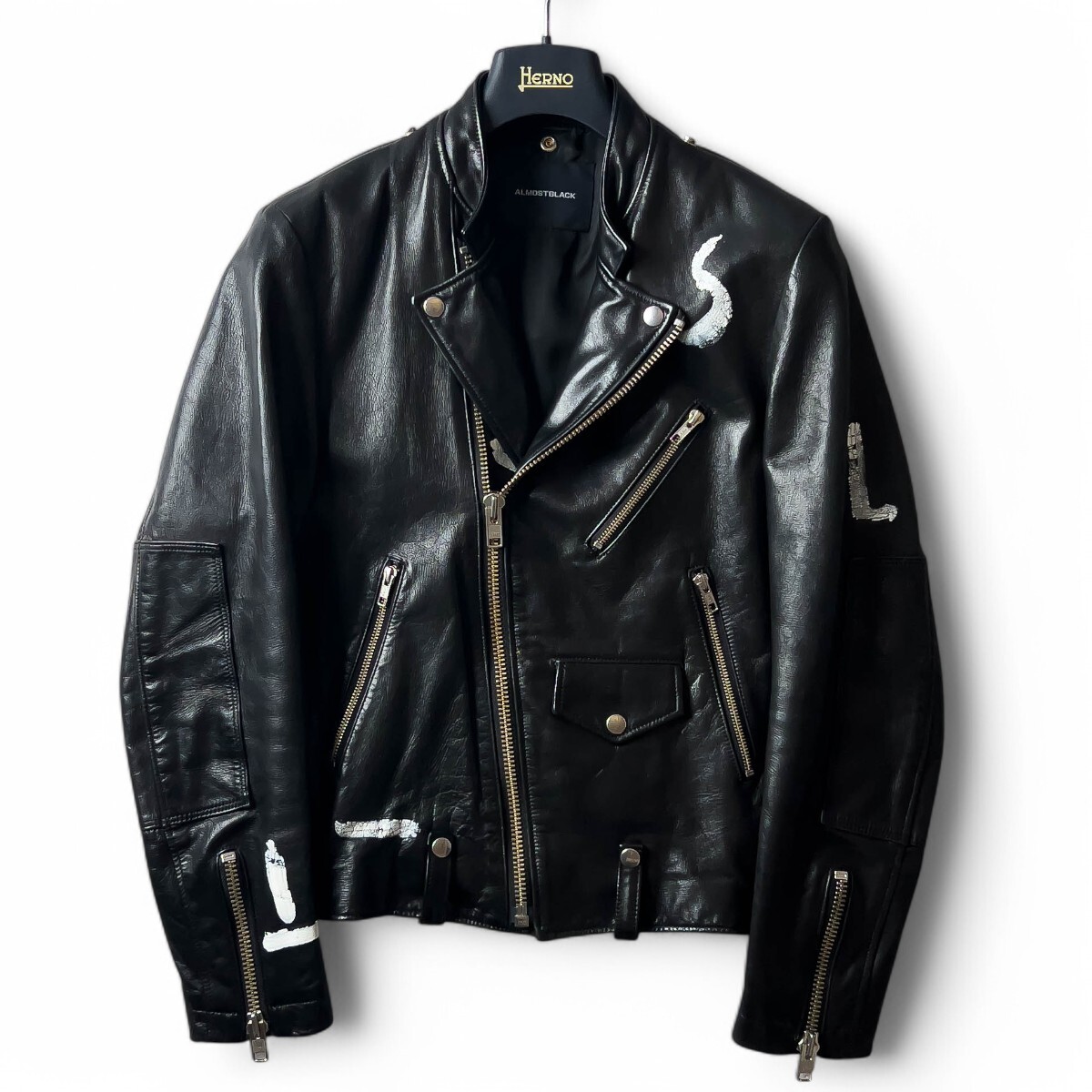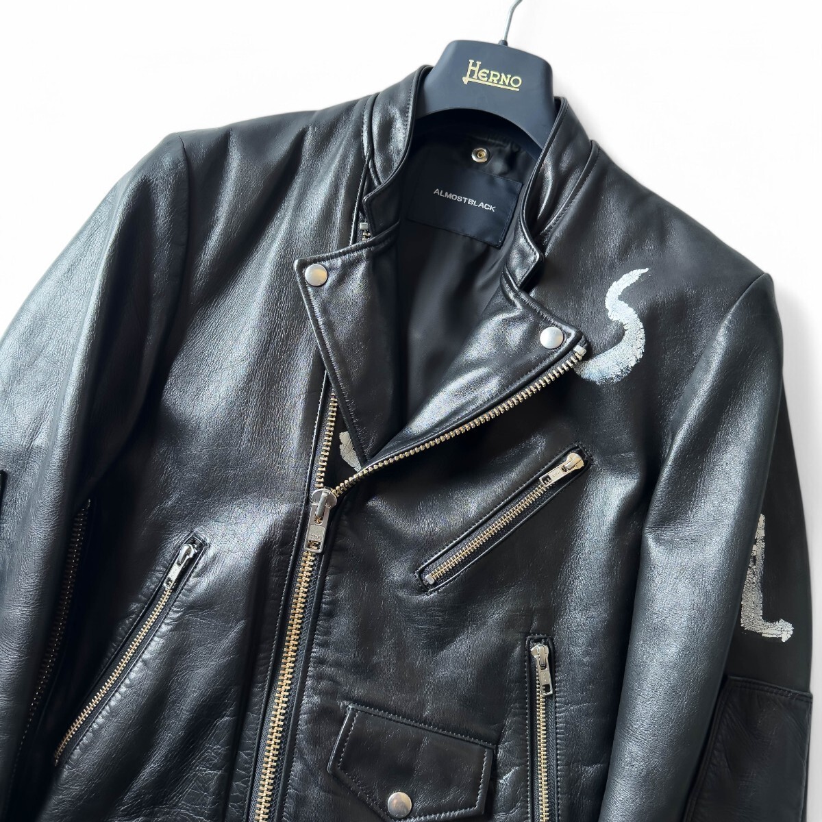 ◆こちらは、ALMOSTBLACKの特別なダブルライダースジャケットです。しなやかでありながら芯の強さを感じさせる馬革(ホースレザー)を使用し、無骨ながらも洗練された印象に仕上げられています。随所に施されたハンドペイントは一点一点異なり、まさに唯一無二のアートピースとも言える仕上がりです。