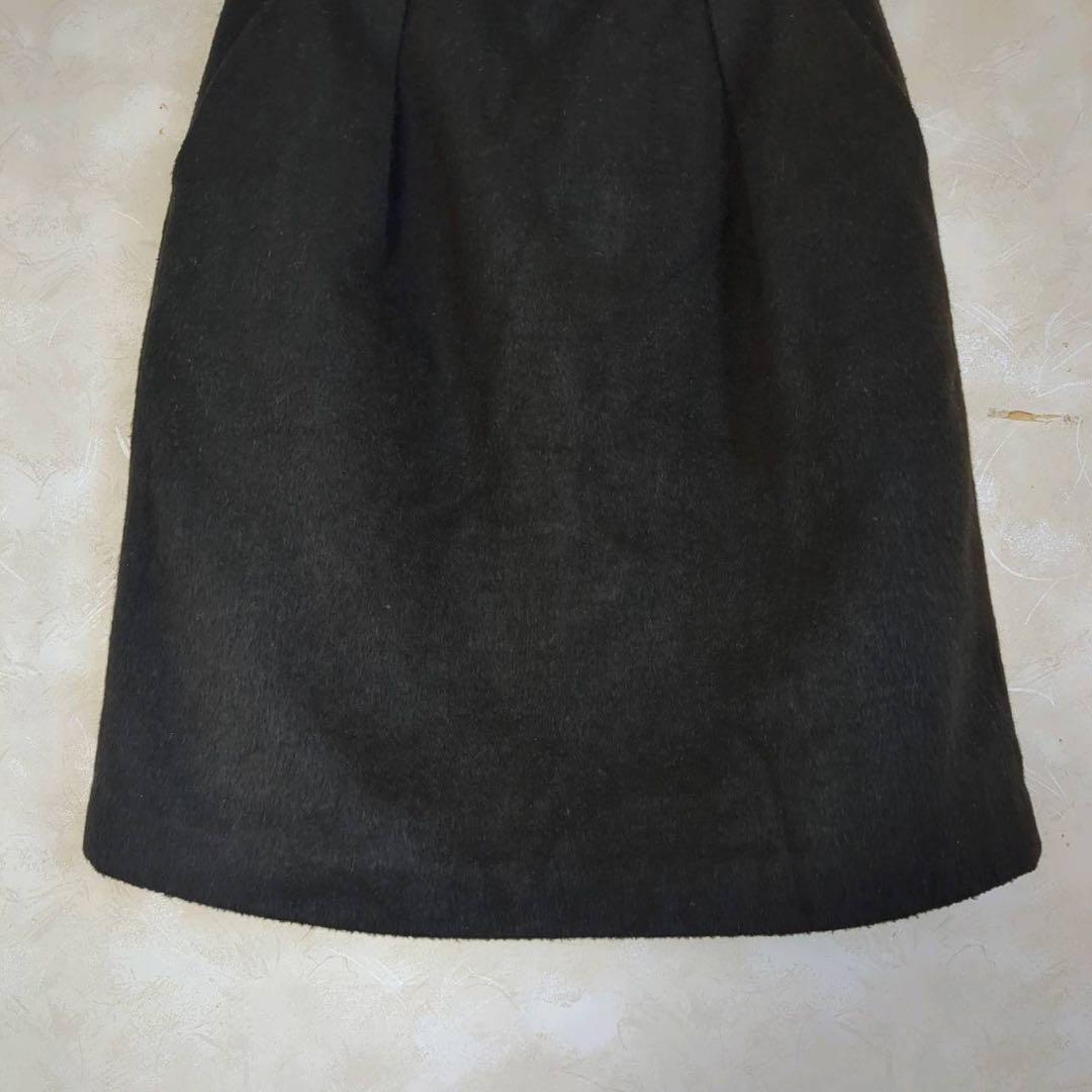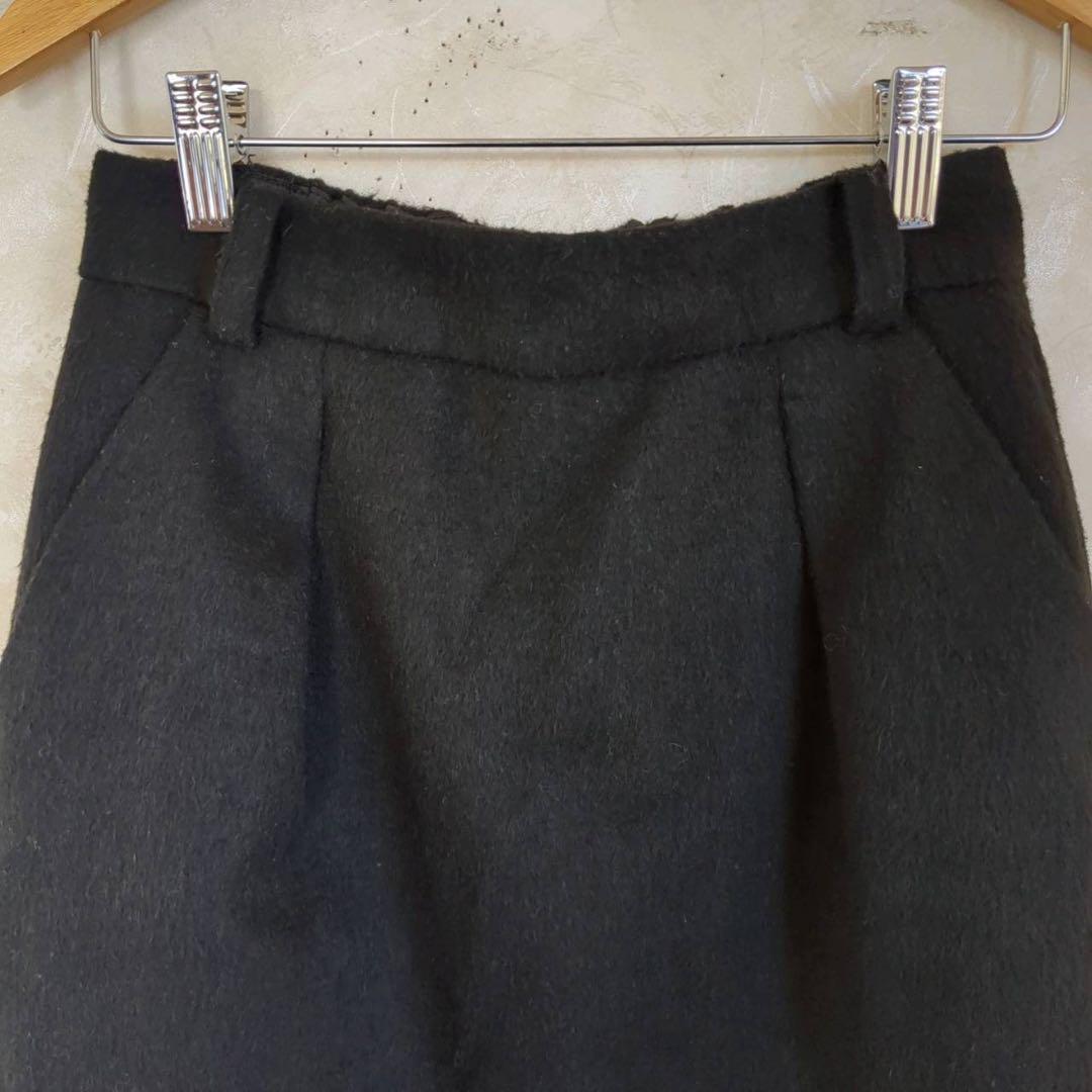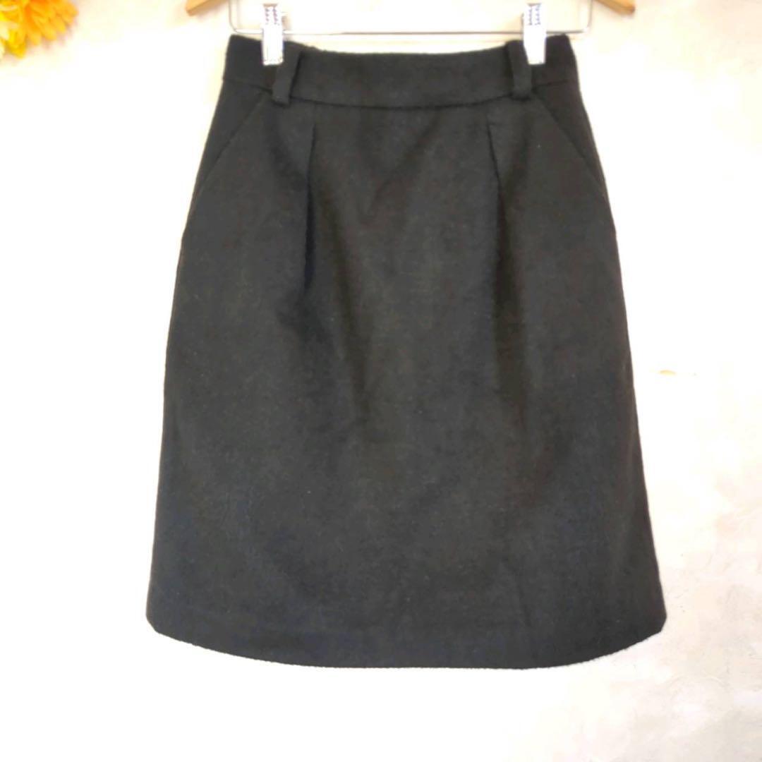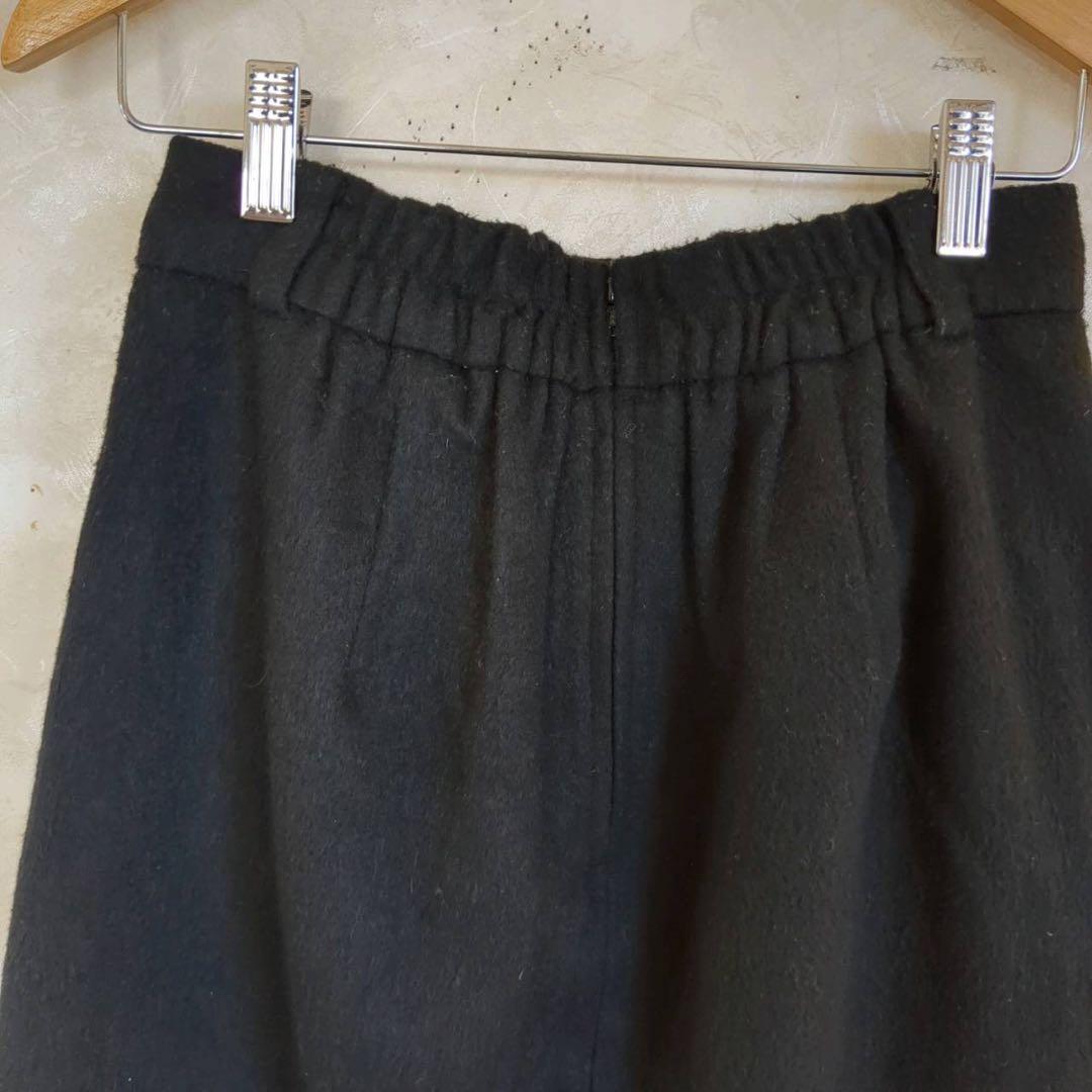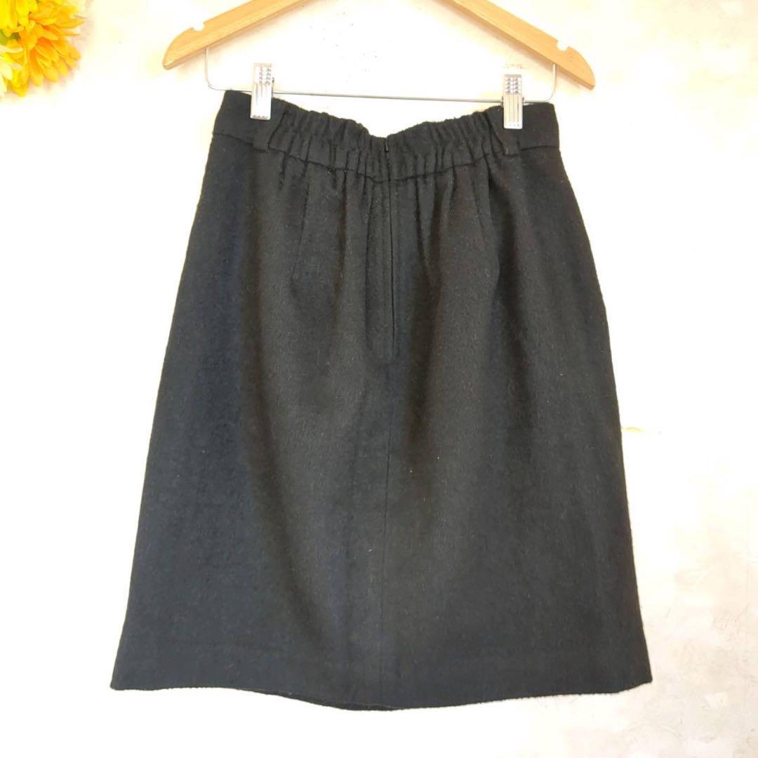 シンプルなデザインの黒いタイトスカート、後ろファスナーとゴム入りウエストで快適な着用感。