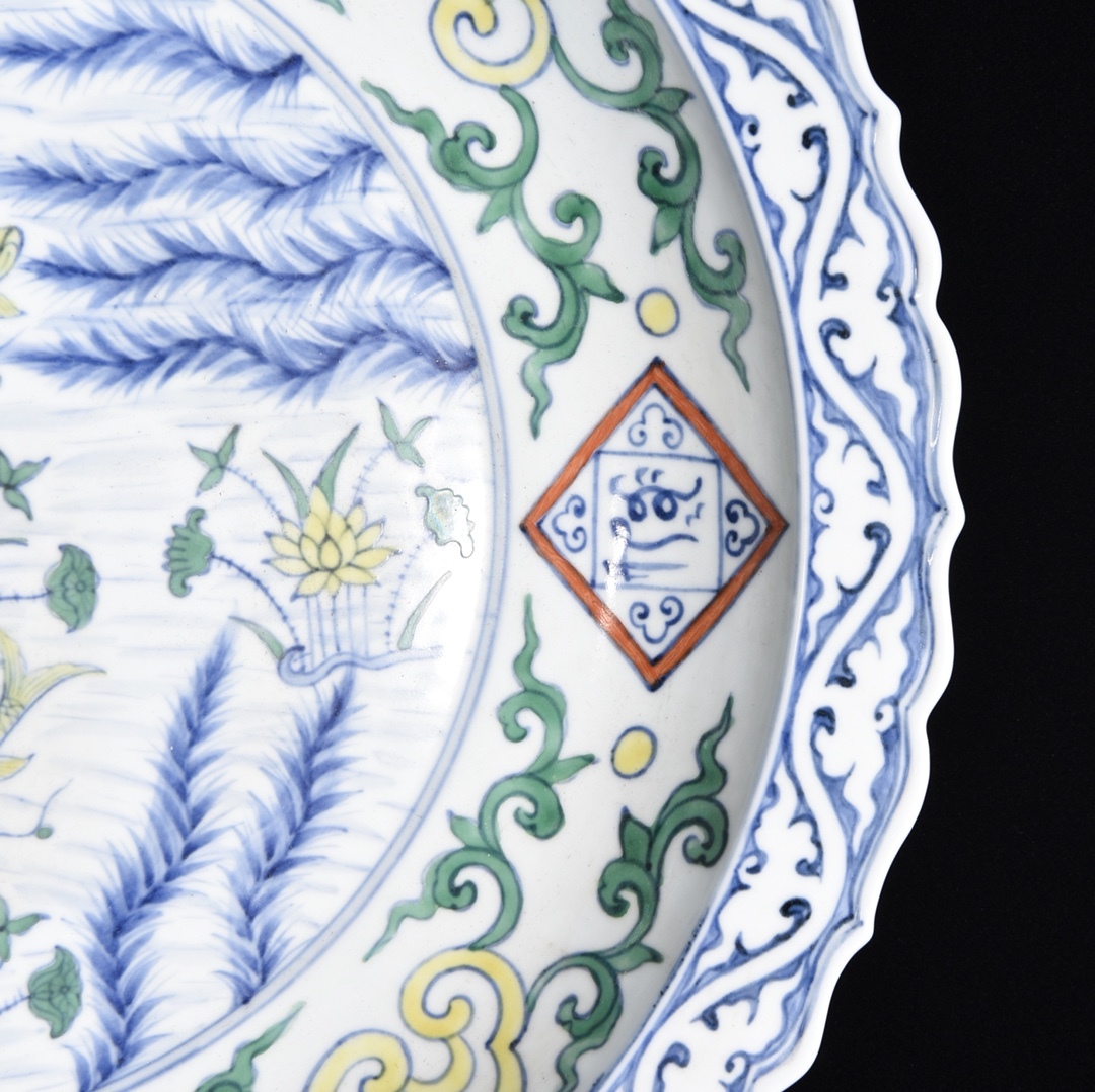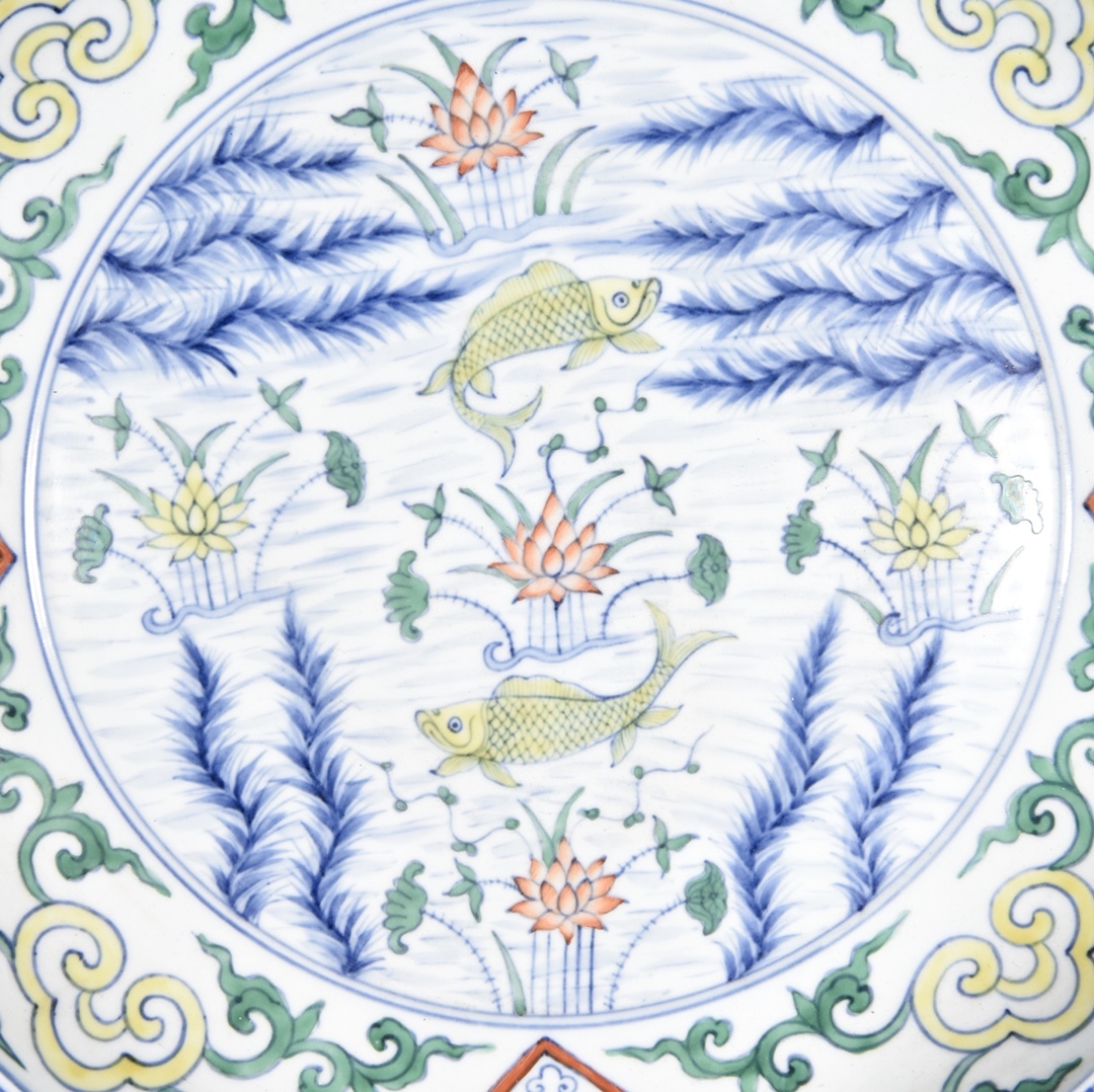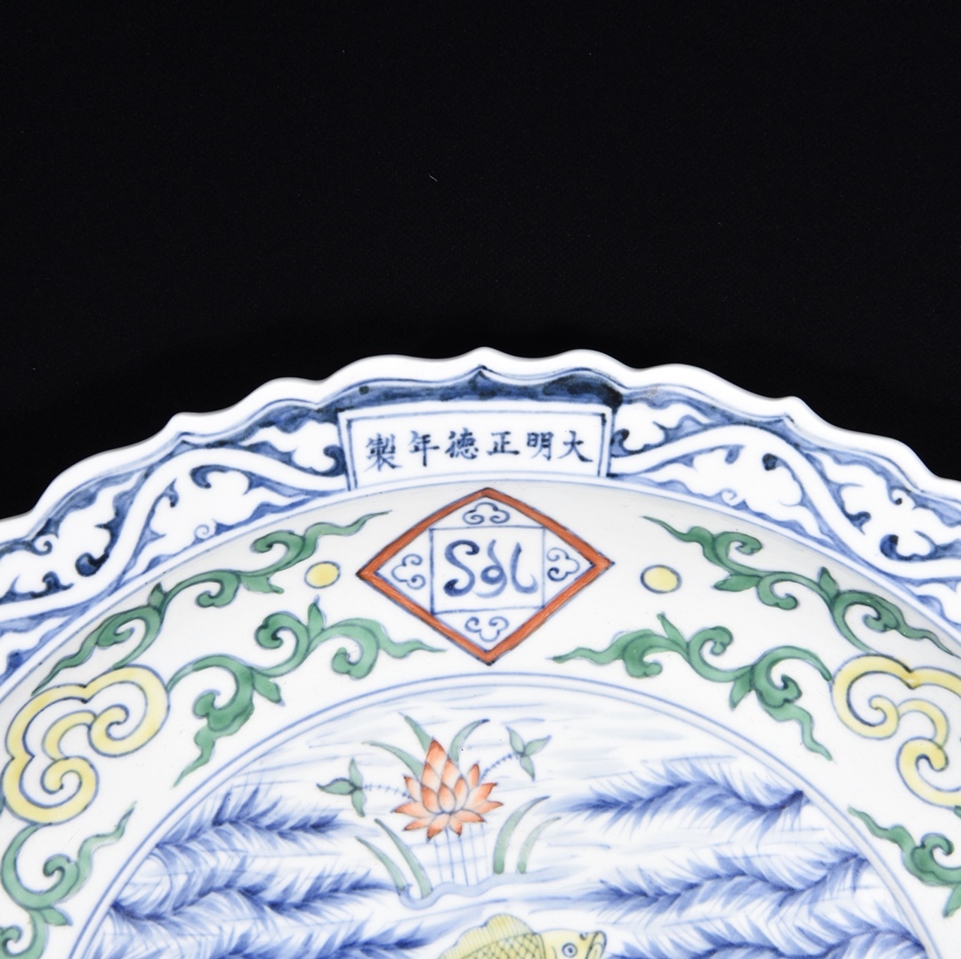 『明・正德年製款・古陶磁器・大明赤絵・青花五彩魚藻紋・盤・賞盤』極細工・時代物・東洋彫刻・古賞物・中国古玩・中国古美術