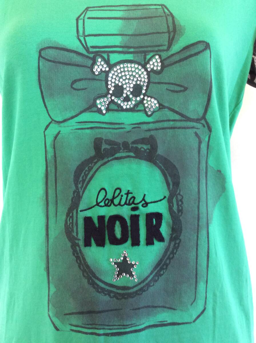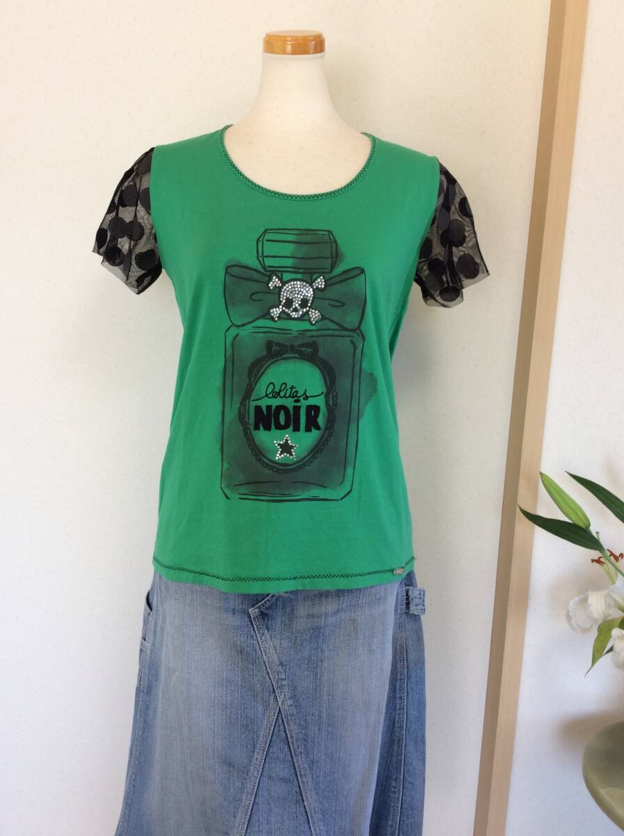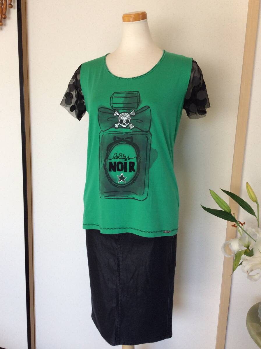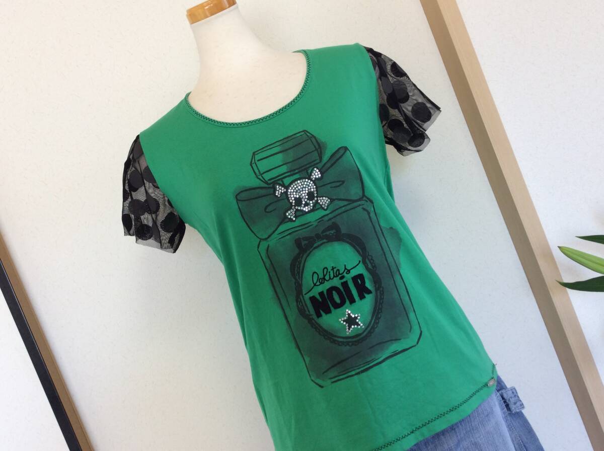 出品者よりひと言…ロリタス&ロロスの、大人の女性仕様なお洒落トップス♪半袖のお袖部分は黒のチュール素材、正面真ん中に香水瓶モチーフのイラスト、スカル部分にはラインストーン。グリーンも発色の良い緑色で、日本製のお洋服には無い独特の雰囲気があります。イタリー製の、他に無い感じのお洋服をお探しの方、よろしくお願いいたします!