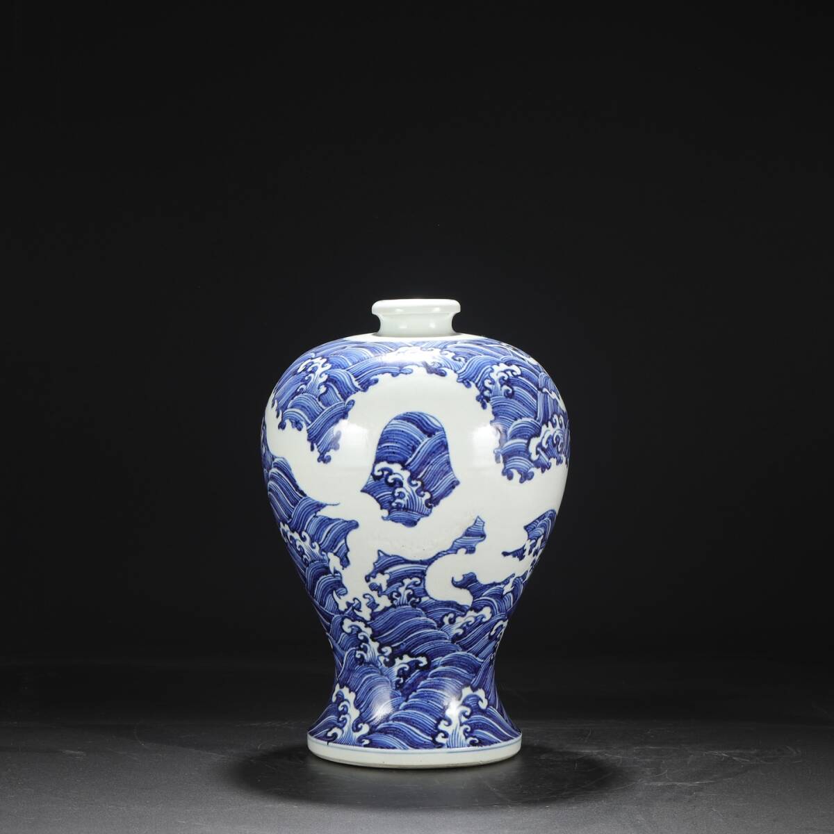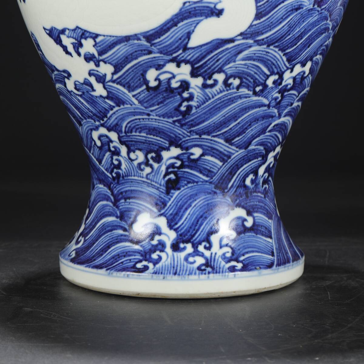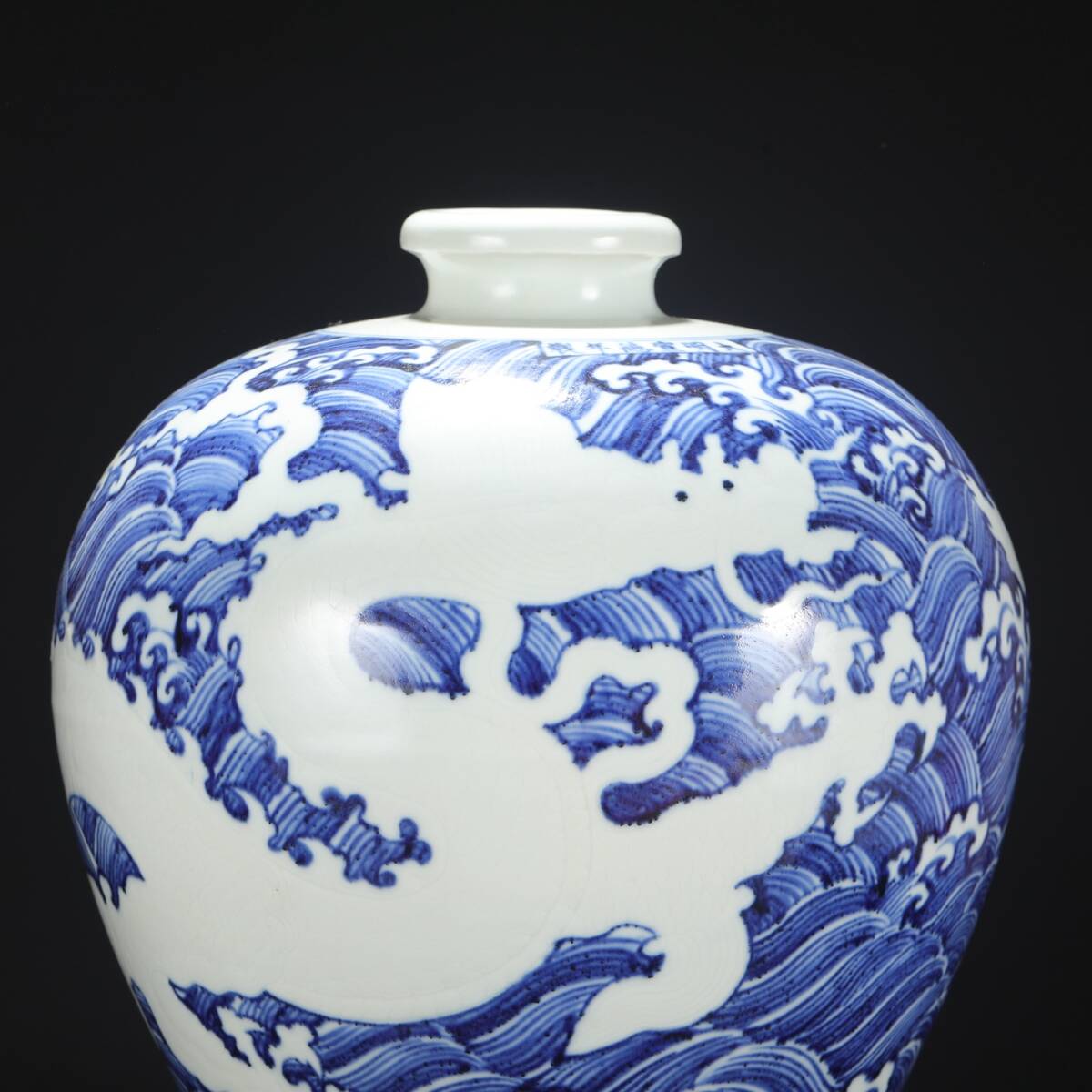 明時代 宣徳 青花 留白剔刻海水龍文大梅瓶 唐物 箱付き 陶磁器 中国美術 古美術 置物 高さ40.3cm 口径8cm 胴径27cm RG268