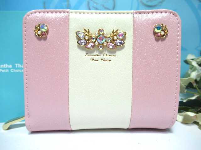 送無 40%引 サマンサタバサ 限定 キラキラ ビジュー付 ロゴ入 バイカラー 牛革 二つ折り財布 折財布 ミニ財布 ピンク 新品 証明書 包装付