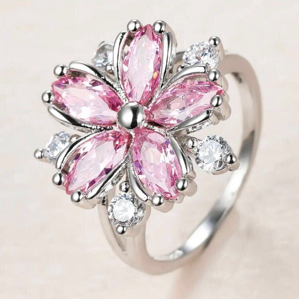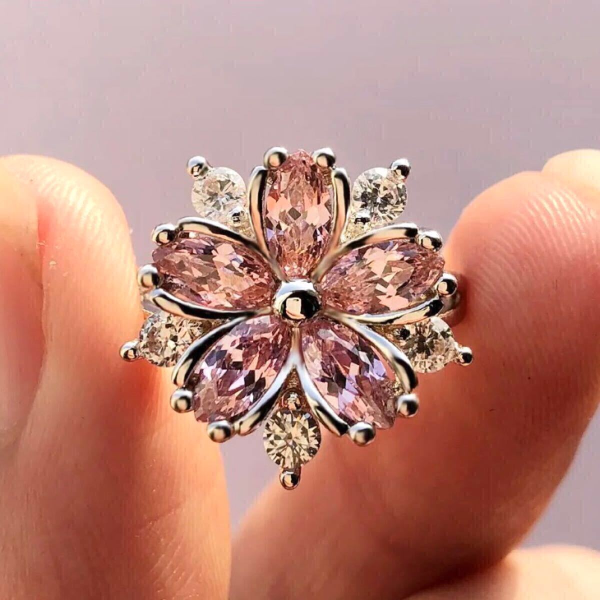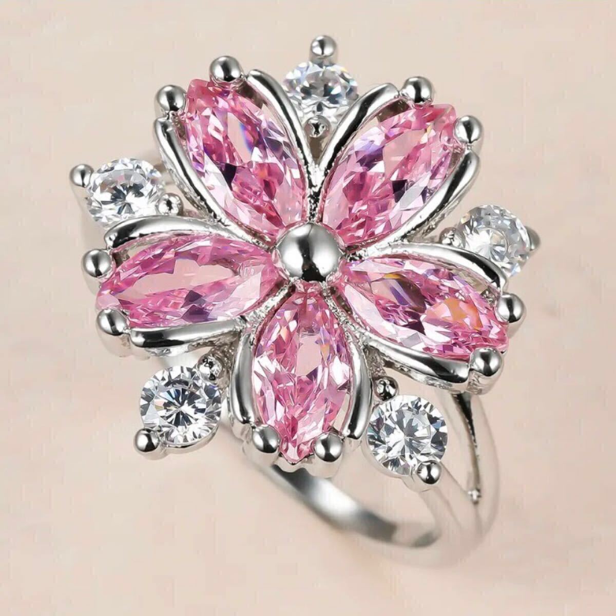 フラワーモチーフのCZピンクダイヤと周りを彩るCZクリアーダイヤが視線を集めるリングです。女性らしい魅力を引き立てるフェミニンなデザインです。