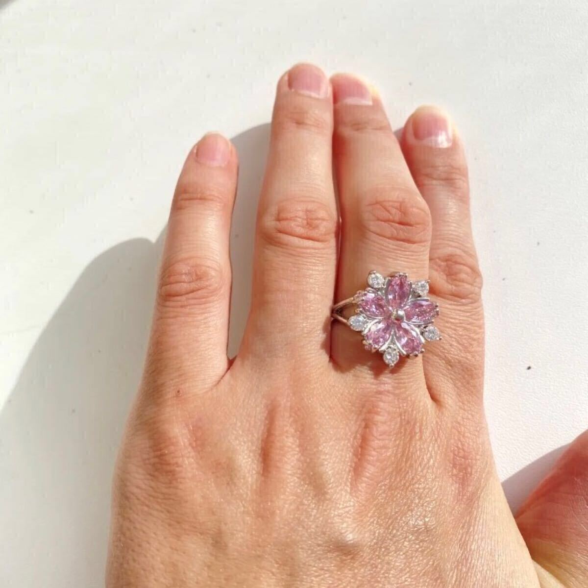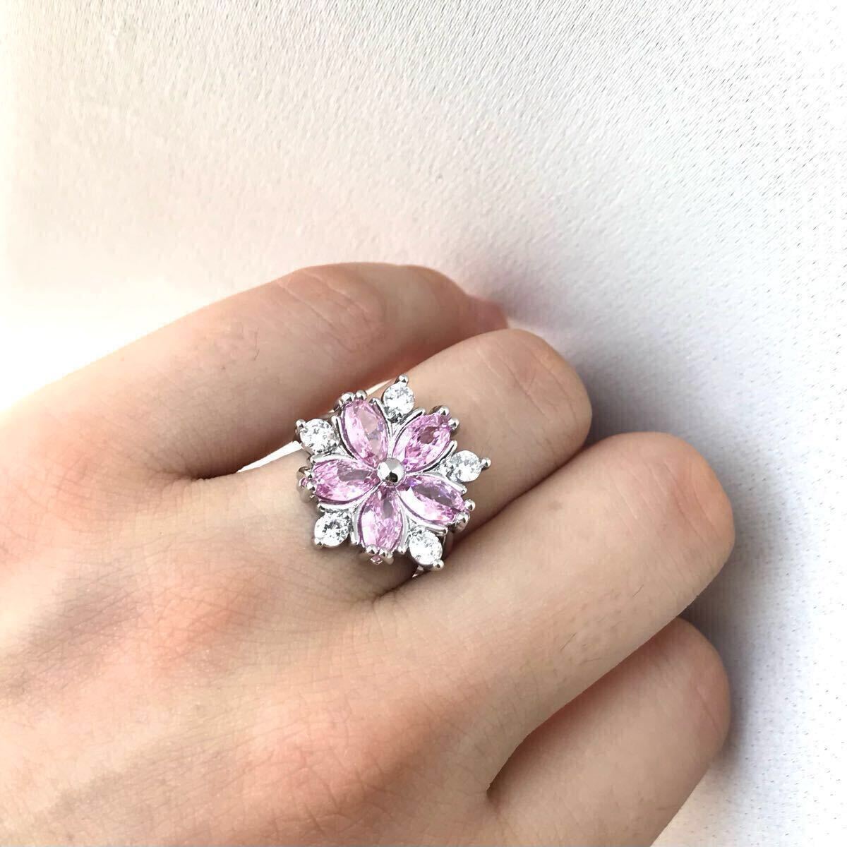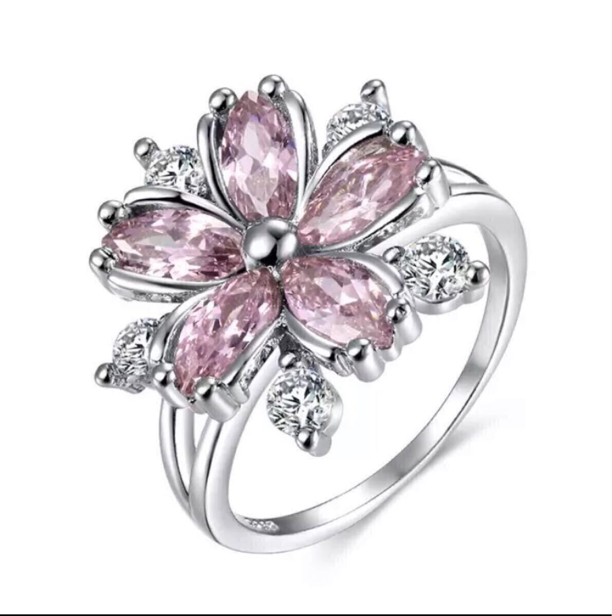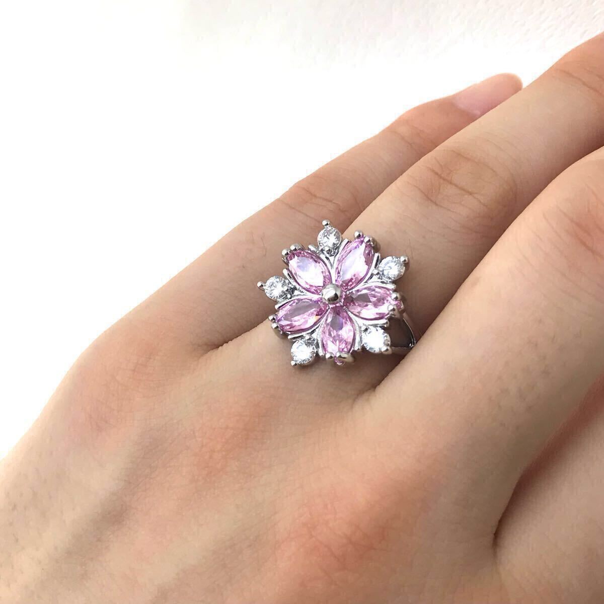 フラワーモチーフのCZピンクダイヤと周りを彩るCZクリアーダイヤが視線を集めるリングです。女性らしい魅力を引き立てるフェミニンなデザインです。