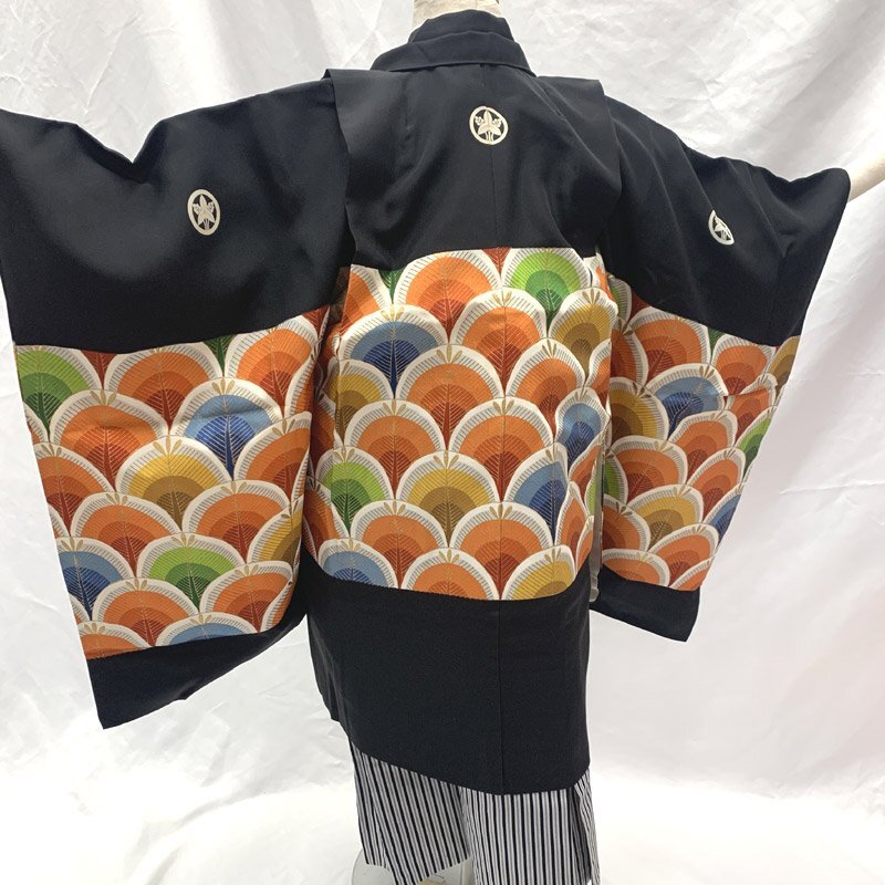 | ■七五三 五歳 男児 着物&羽織&袴&角帯 五つ紋■状態良好 (No.gd) 色彩豊かな孔雀青海波文がモダンでスタイリッシュな5歳七五三のお着物セットです。五つ紋(丸に沢潟紋)入り。こちらの商品は着物、羽織、袴、角帯です。 長襦袢、懐剣、末広などのお小物はセットに含まれでおりませんのでご用意をお願いします。 画像のお小物類(懐剣、末広)は別途3000円です。*懐剣はハンドメイド商品のため、よれなどがある場合がございます。ハンドメイドにご興味、ご理解がない方のご購入はご遠慮くださいませ。 (着物)右前身頃にシミがございますが、お着付けをすると隠れる部分です。右身頃の肩上げが取れてしまっておりますので、お直しをお願いいたします。 (長襦袢)こちらには長襦袢が付属いたしません。 (帯)状態は良い方です。 【素材】(着物)正絹、(羽織)正絹、(袴)ポリエステル、(帯)ポリエステル 【色】黒 *モニターによって色味は実際と異なる場合がございます。 【サイズ】(着物) 裄:45cm、肩上げ:6.5cm、袖幅:30.7cm、袖丈:56.5cm、丈(肩から):103.5cm、腰上げ:0cm、前幅:18.3cm、後幅:24.3cm (羽織) 裄:43cm、肩上げ:6cm、袖幅:30.5cm、袖丈:56cm、丈(肩から):67.7cm、腰上げ:0cm、前幅:11cm、後幅:24.5cm (袴) 紐下丈:60.5cm (帯) 幅:6cm、長さ:210cm *素人採寸のため、多少の誤差はご容赦ください。 お求め安い価格での出品ですので、いかがでしょうか? | |