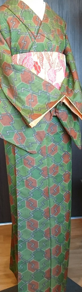 ●●夜桜●●袷お着物●正絹●大島紬★深緑系のさらり感の手触り★九寸名古屋帯★縮緬の型抜き染めは感謝としてお付けしてます★●No86