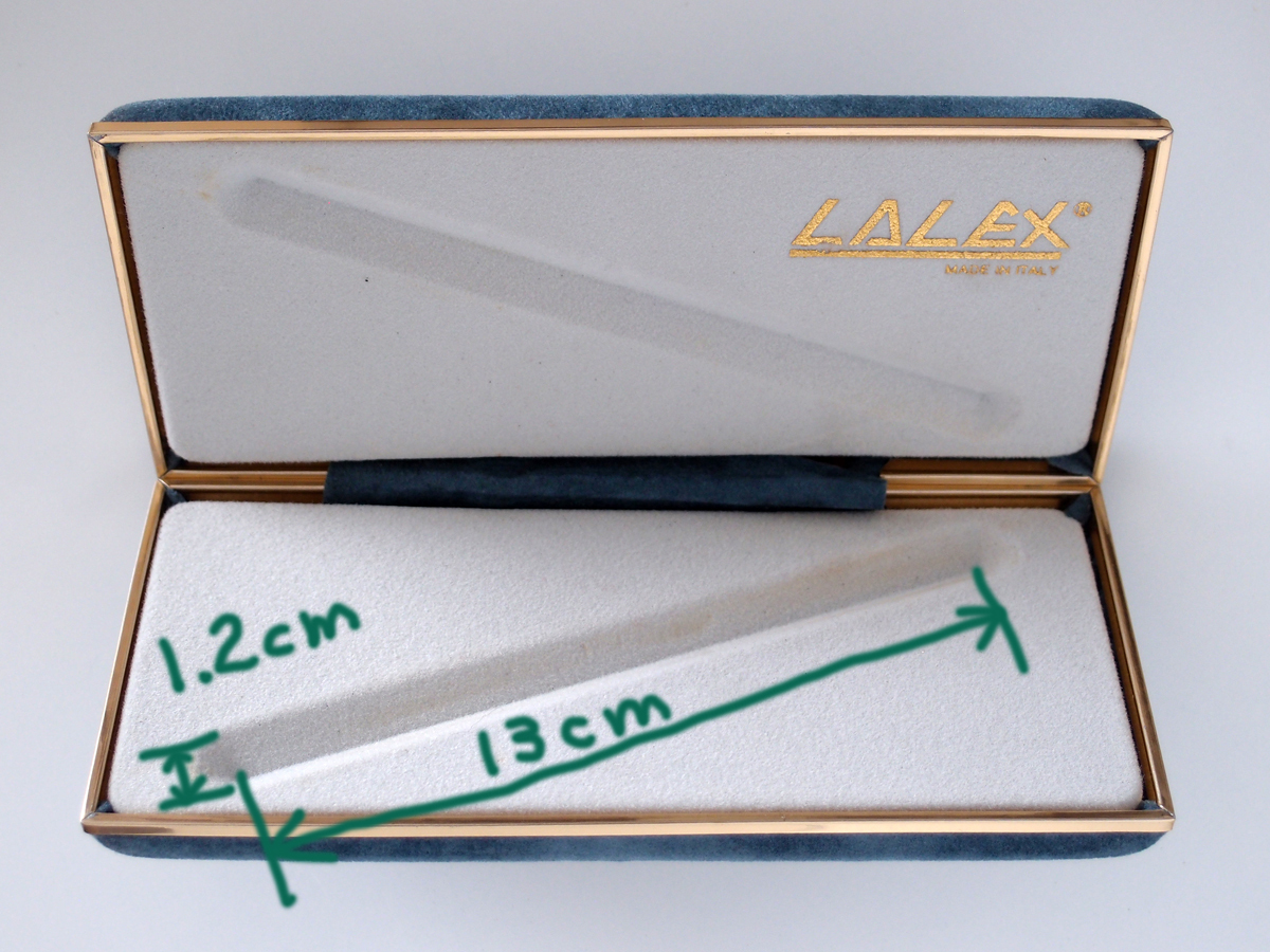 昔のLALEX ボールペン用 空ケース 外箱です。ケースサイズ:7cm×16.2cm×厚み2.5cm。ペン収納スペース1.2cm×13cm。古いもののため、経年の汚れ・変色がございます。現状ノークレームにてよろしくお願い致します。