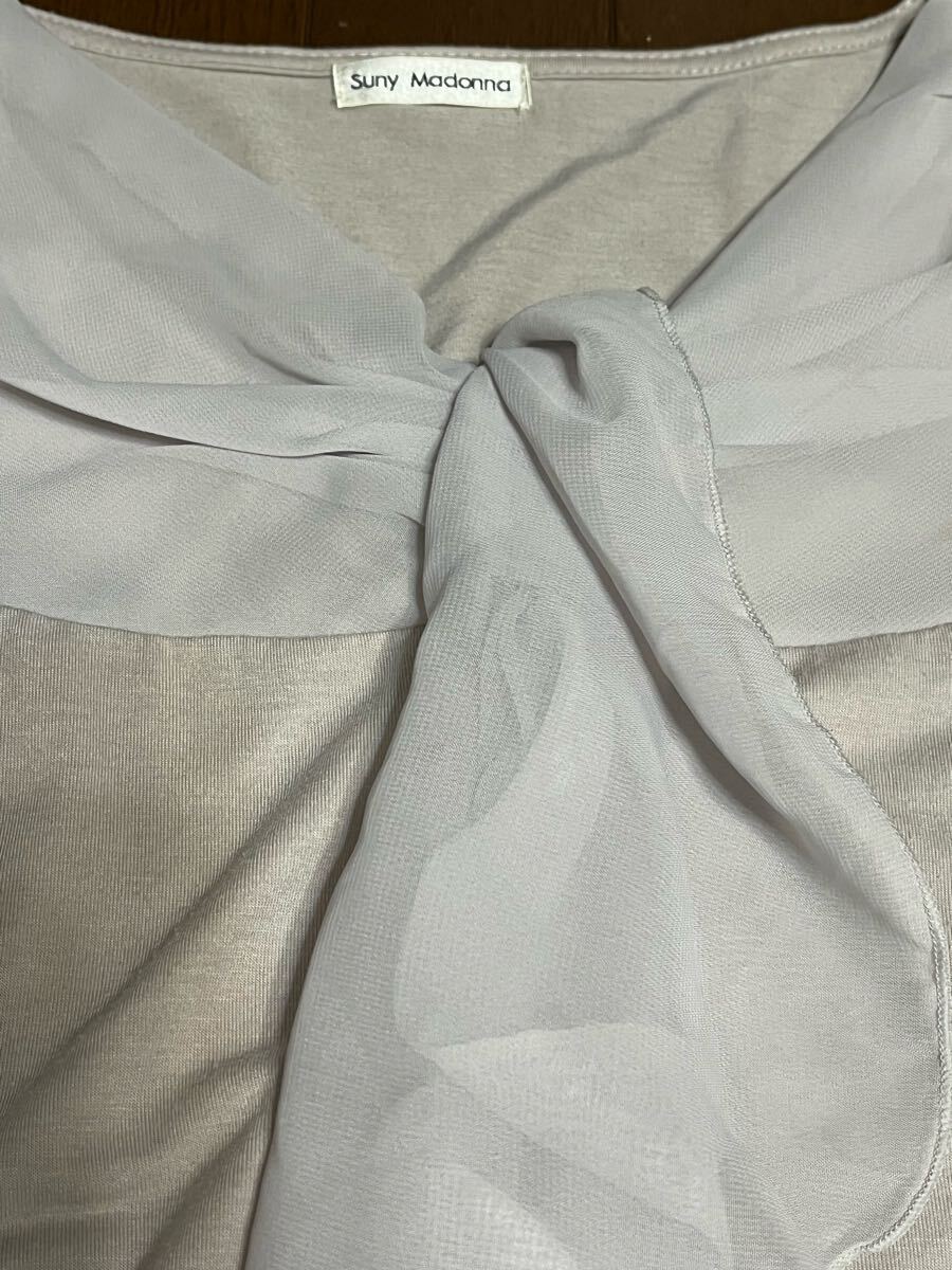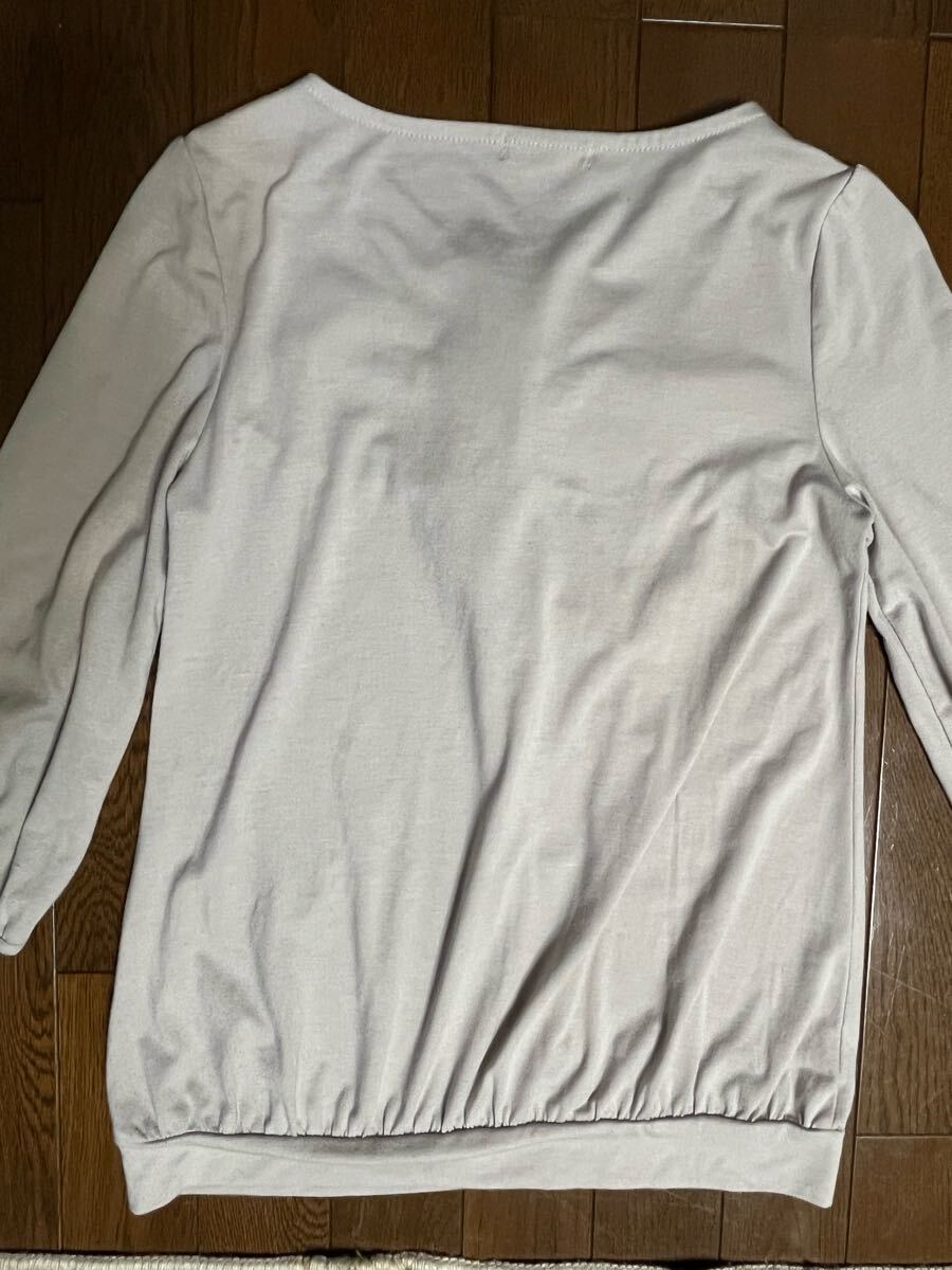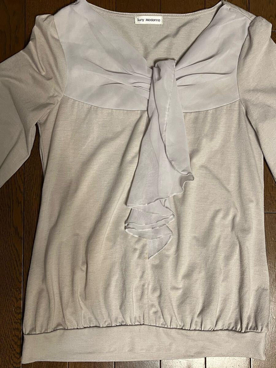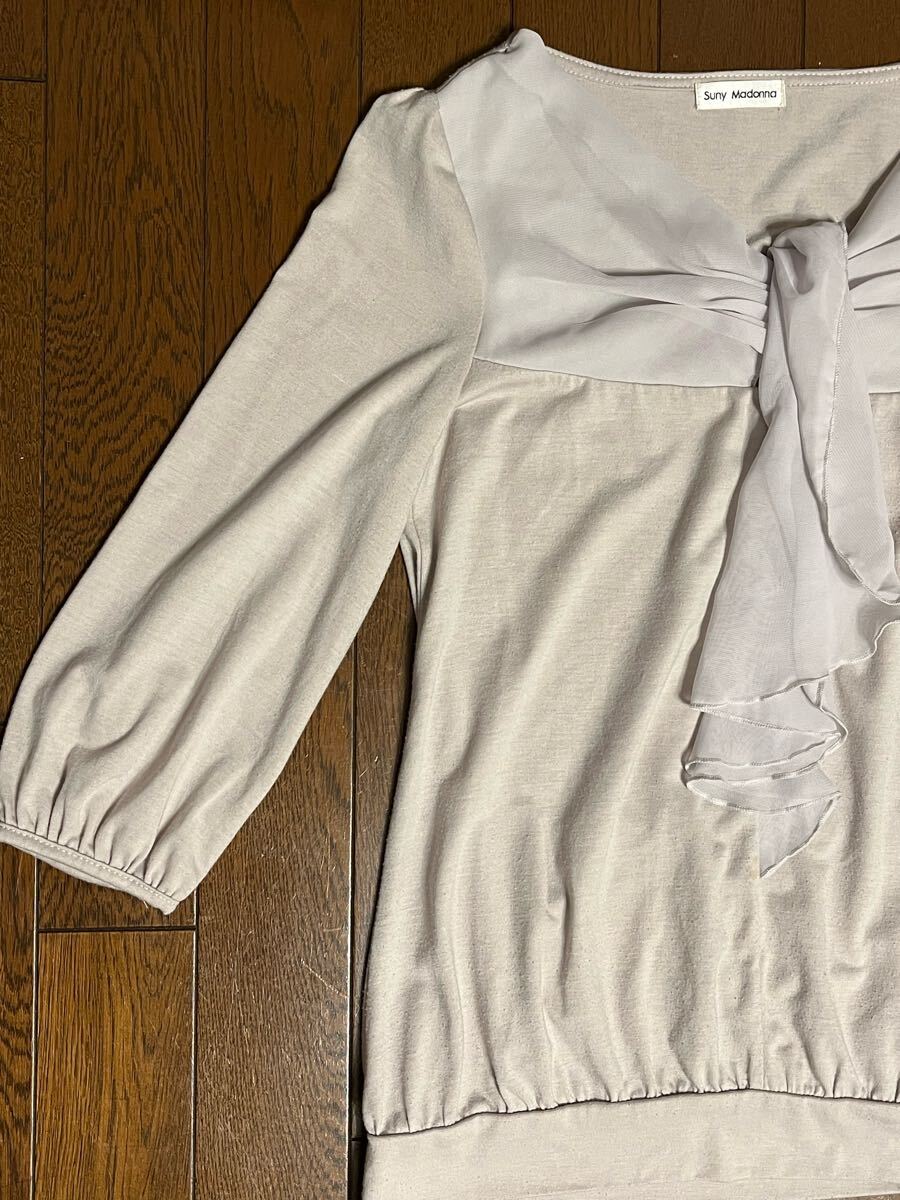 5分袖カットソー  フロントリボン付き  ライトグレー  五分袖トップス  カットソー 大人可愛い フリル