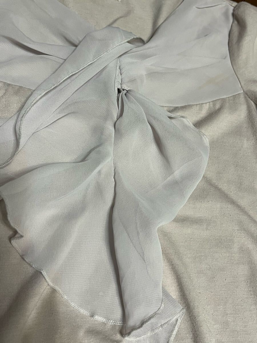 上品なお色とデザイン、きちんとした印象を与える胸元のフリルはオーガンジーでふんわりしています。