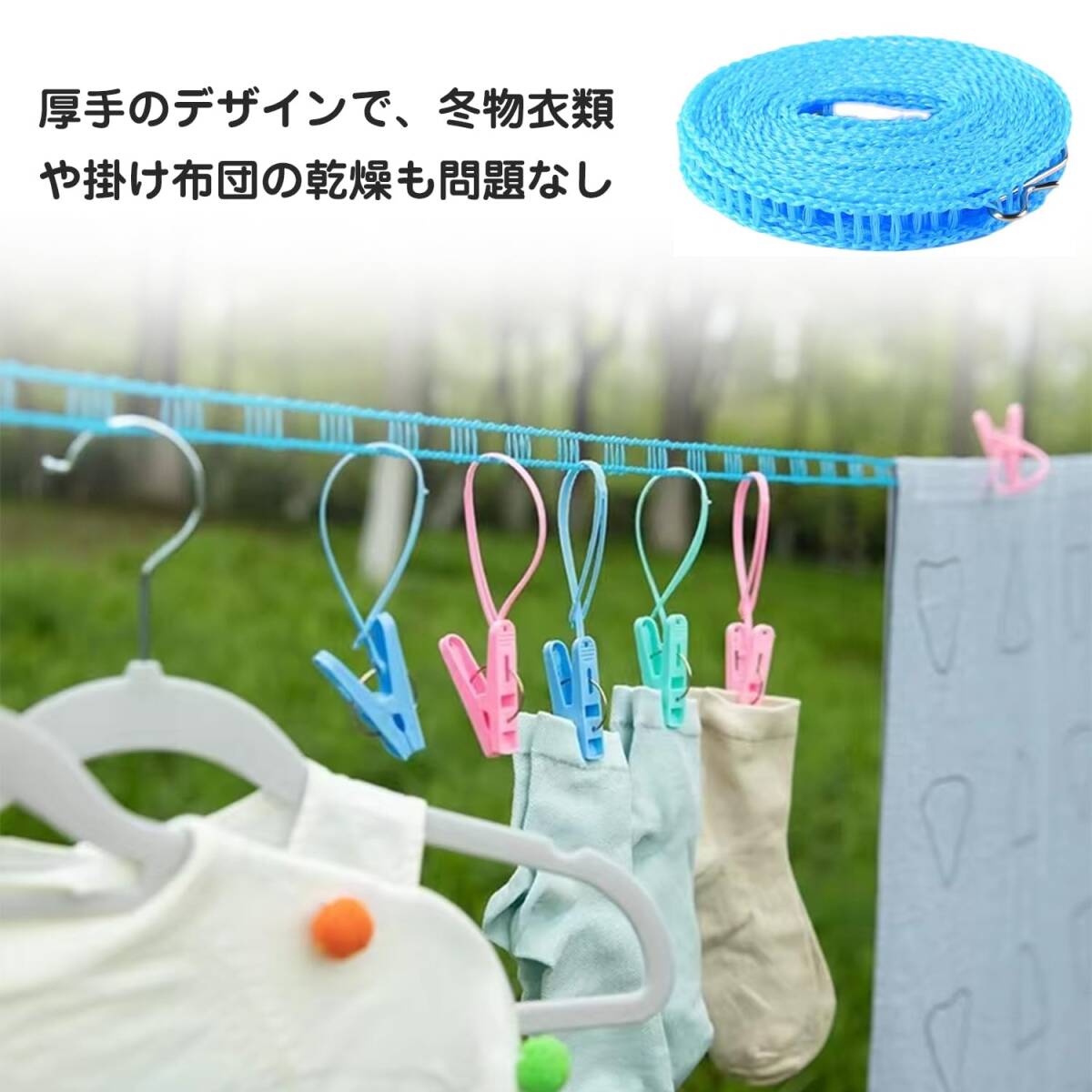 【優れた設計】洗濯物を乾燥させるロープだけでなく、洗濯ロープ内の小さなスロットがハンガーを保持し、ハンガーが互いに転がり込むのを防ぎ、衣類を分離します。