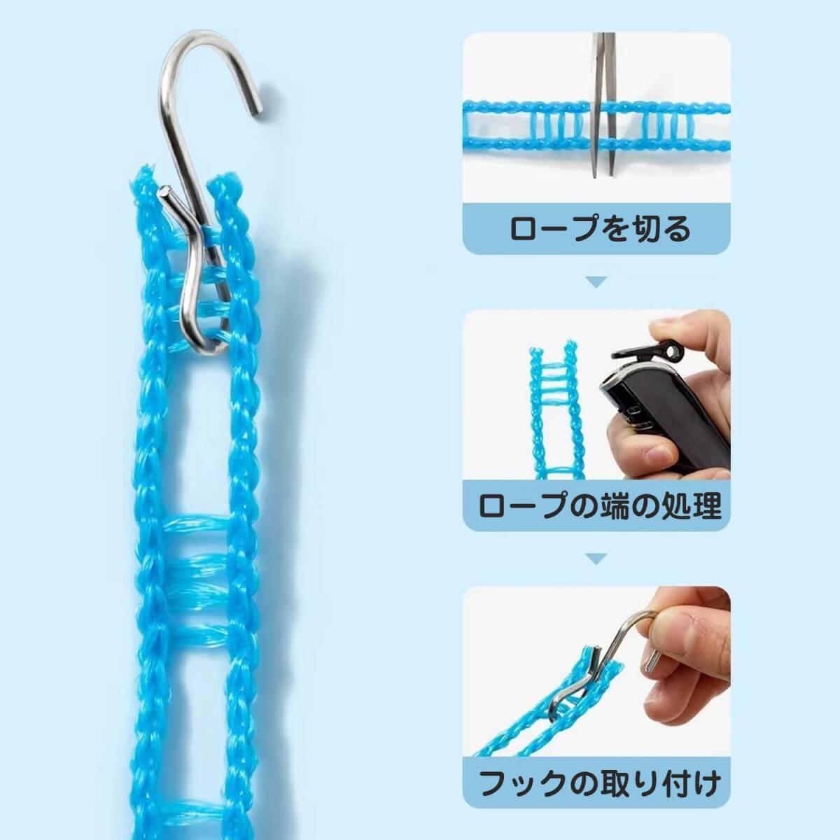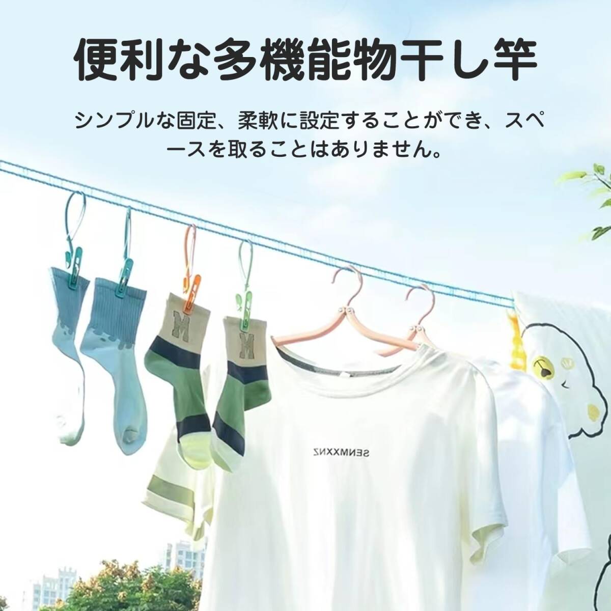 【簡単に固定】乾燥物の重量に耐えられる場所ならどこでもロープを巻き付け、両側のバックルで固定します。ロープをさらに数回巻き付けて、洗濯ロープを真っ直ぐにしっかりと固定してください。重い服を掛けても曲がりにくくなります。