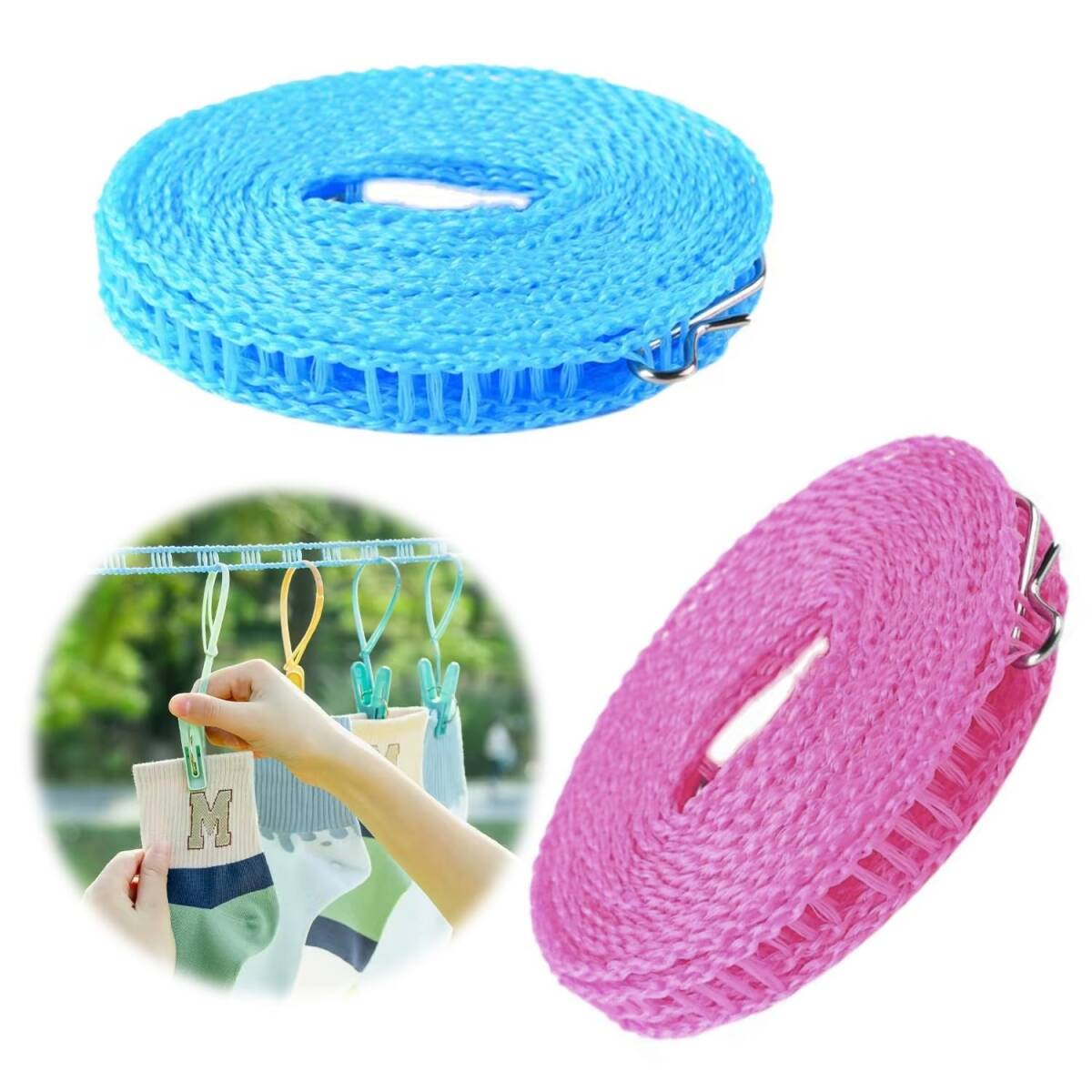 【商品詳細】◆洗濯ロープ長さ:伸びさ約5m ◆材質:ステンレスフック+ナイロンロープ ◆カラー:ピンク+ブルー。このタイプの物干しロープは丈夫で耐摩耗性があり、老化しにくく、耐荷重性が高く、耐用年数が長いナイロンロープで織られています。