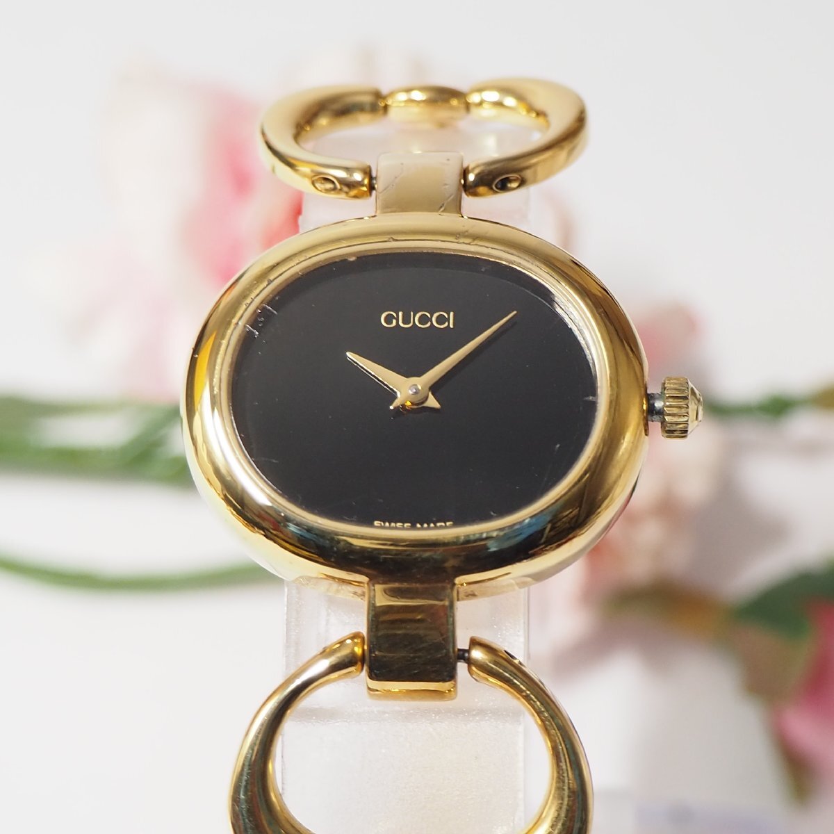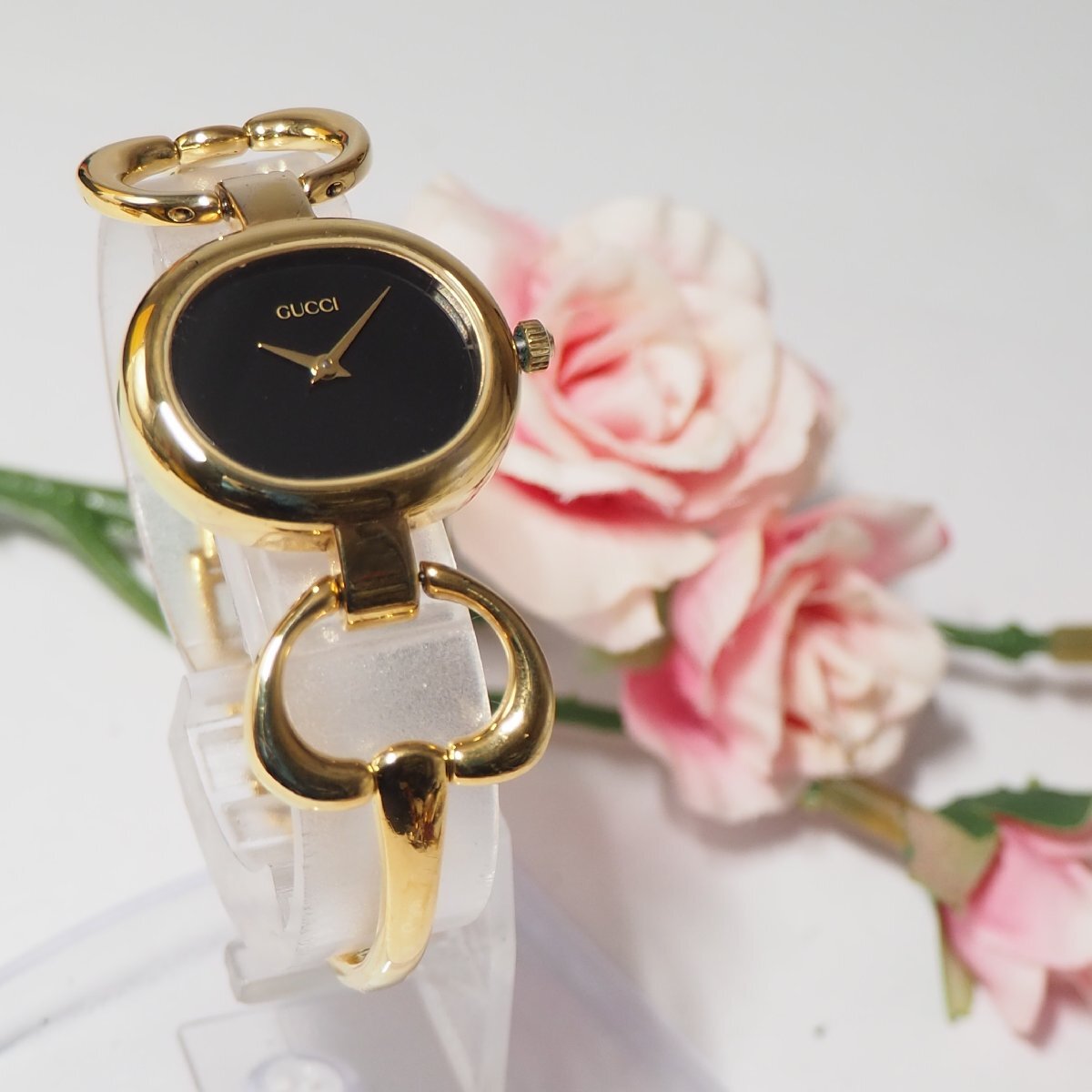 ★★★★ グッチ GUCCI 黒文字盤 バングルウォッチ ブレスレット レディース 腕時計 ゴールド F477 中古★★★★ |