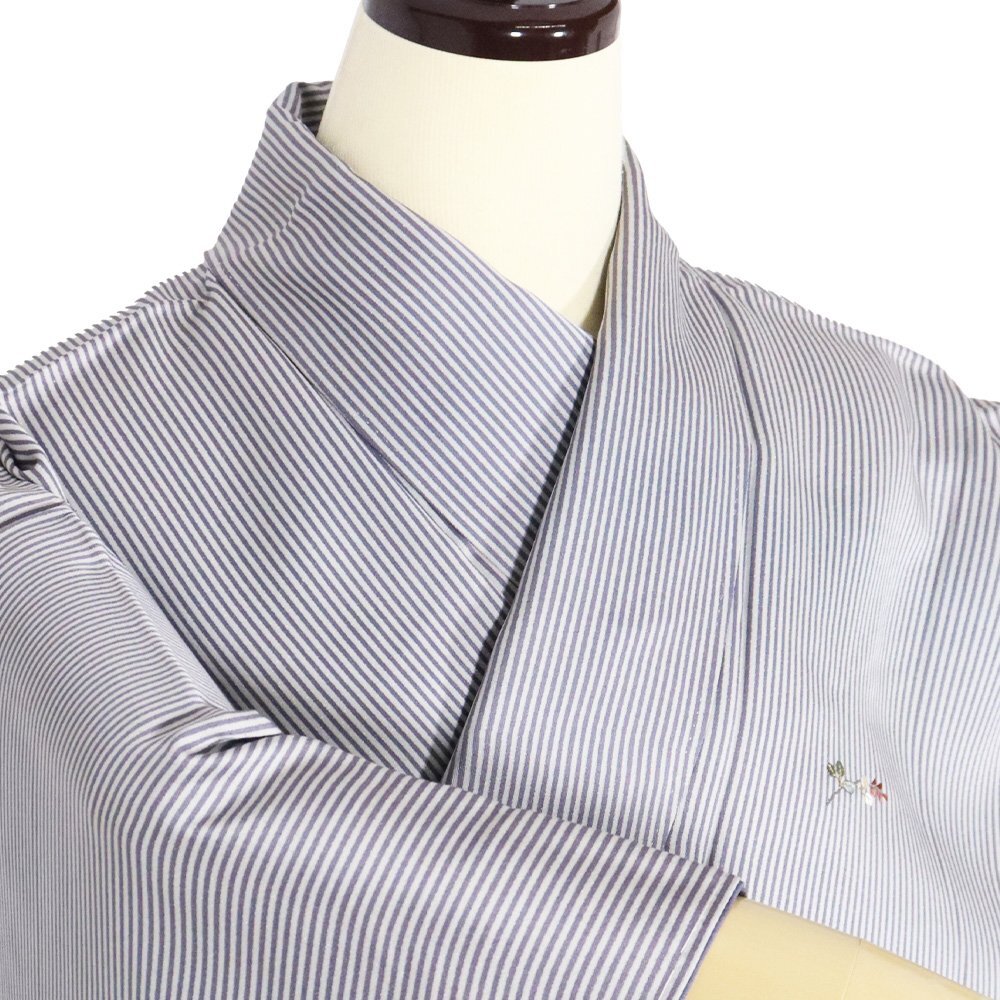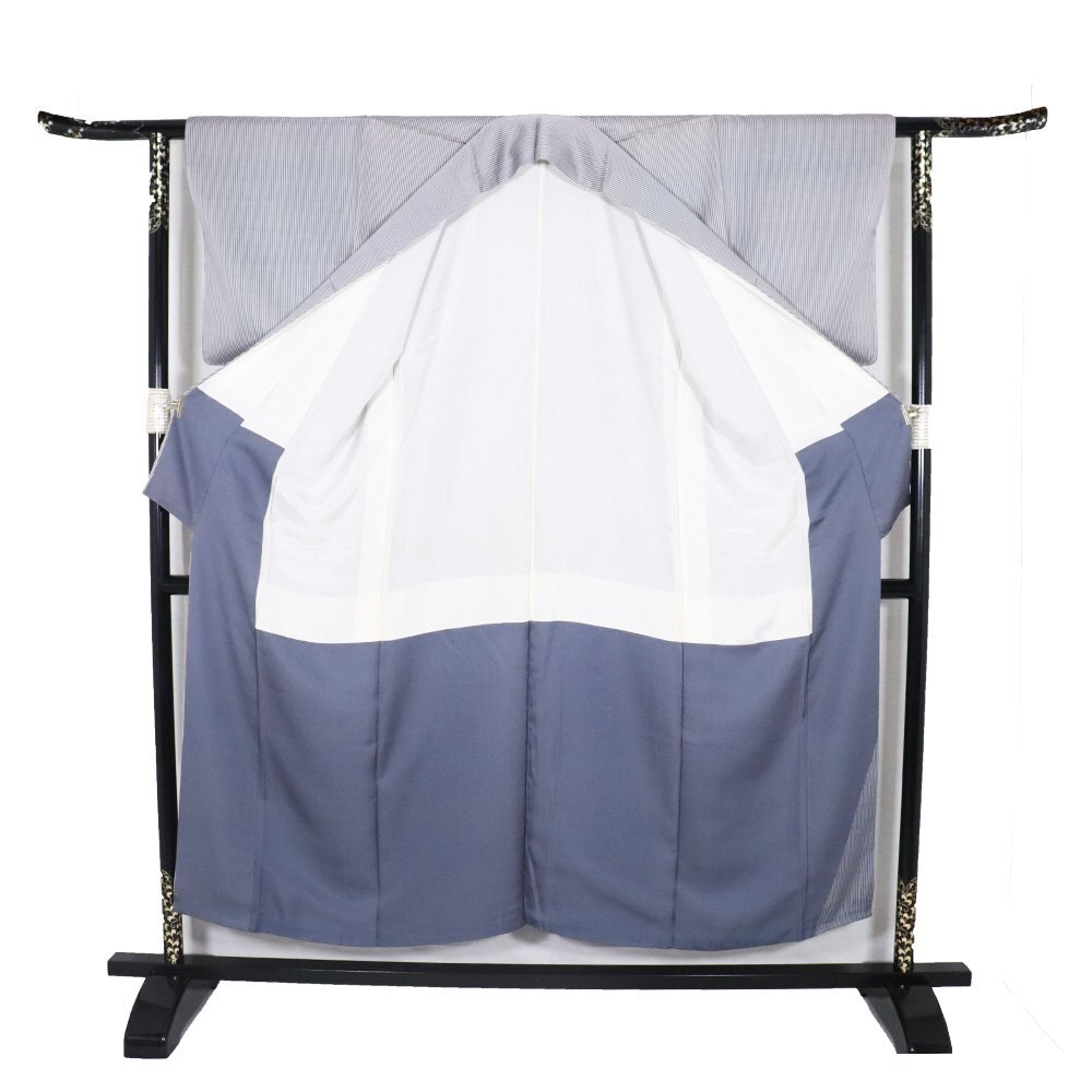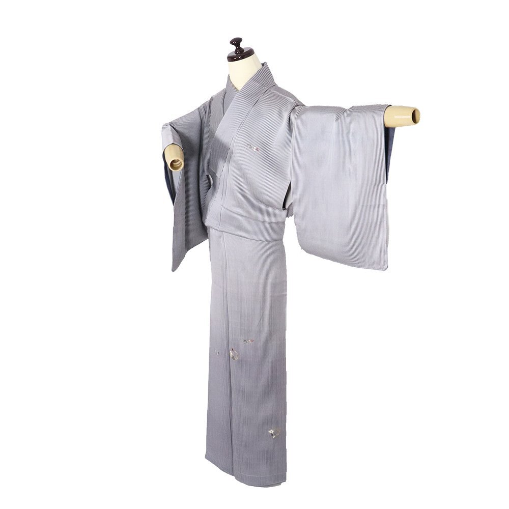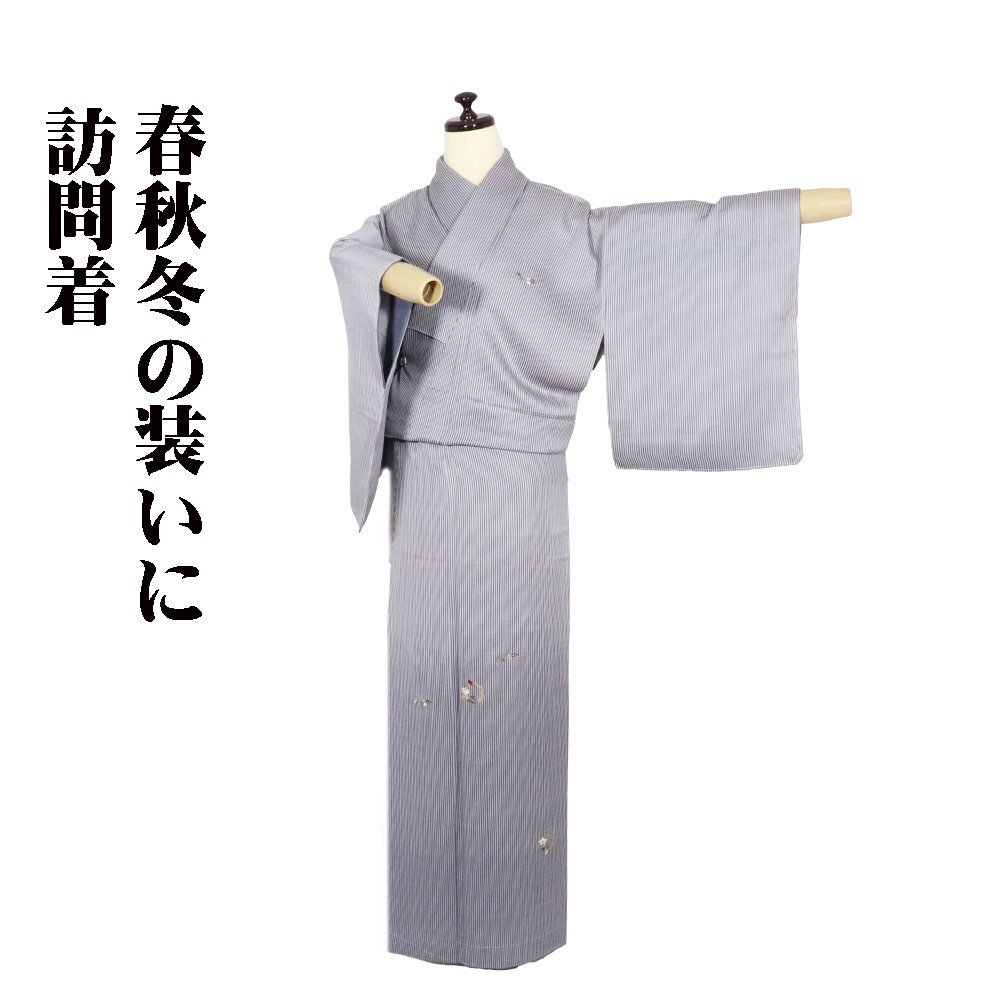 | 訪問着 袷 丹後縮緬地 グレー(薄鼠色)・薄グレー(絹鼠色)・縦縞・ 暈し地 刺繍・花 158 広襟 仕付け付き |