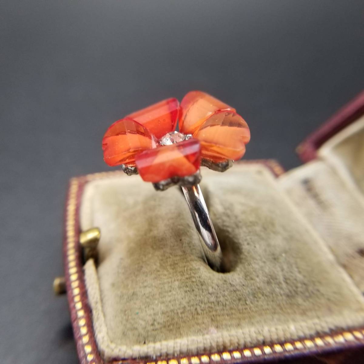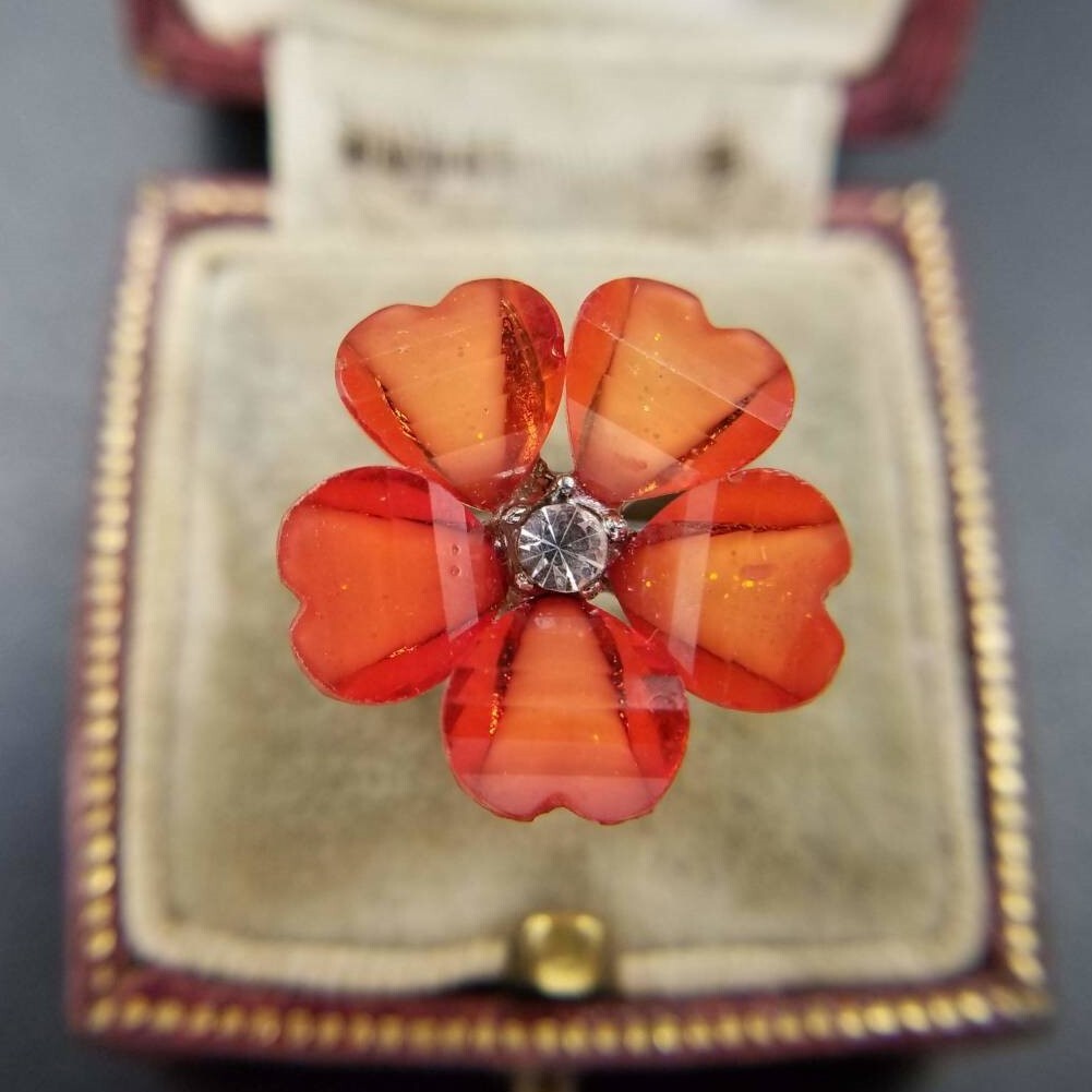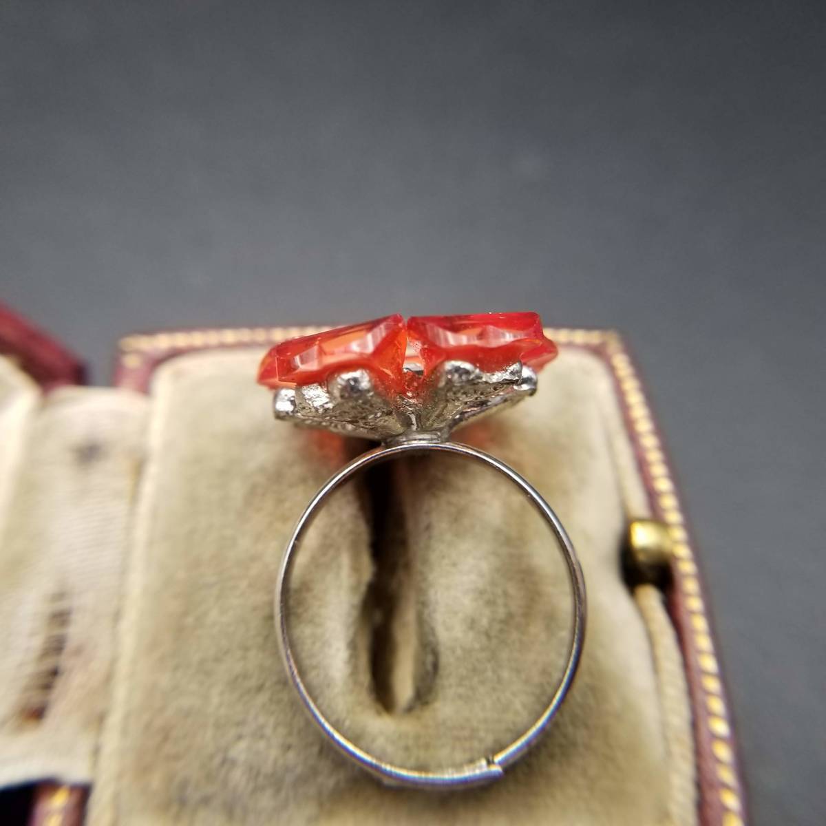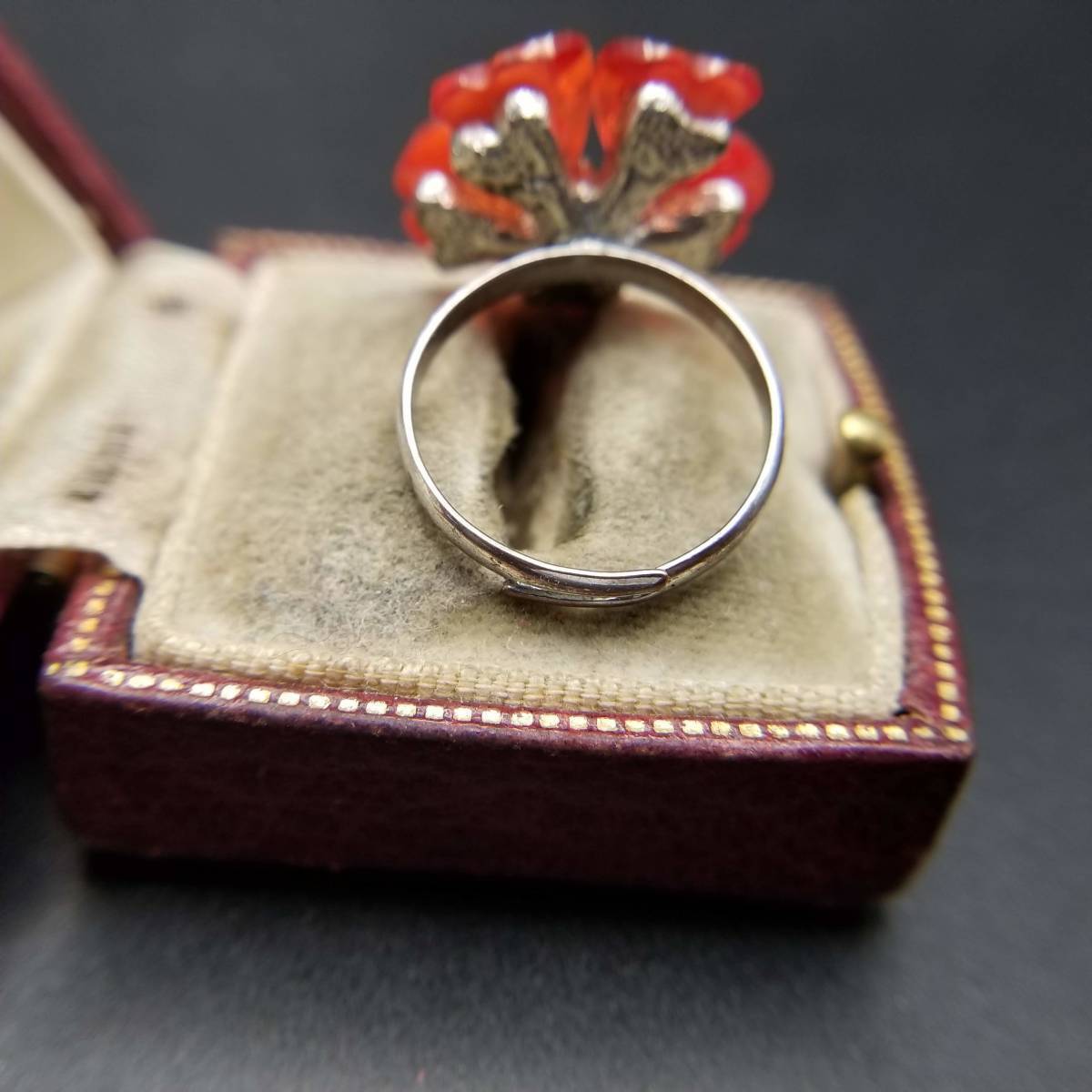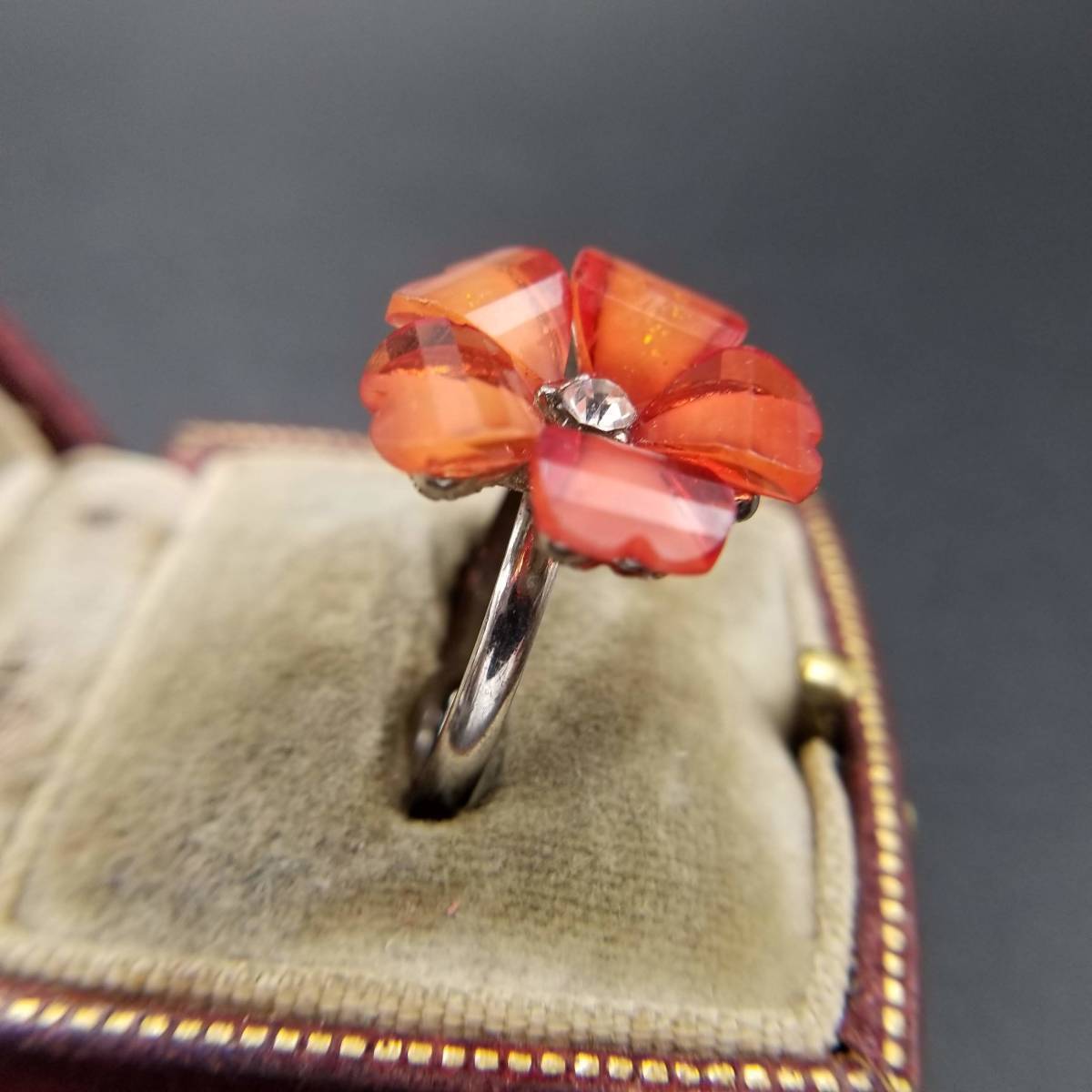 オレンジのお花 ハート型の花びら ヴィンテージ フラワー リング 指輪 レトロ ファッションジュエリー 艶 存在感 フリーサイズバンド Y6-K