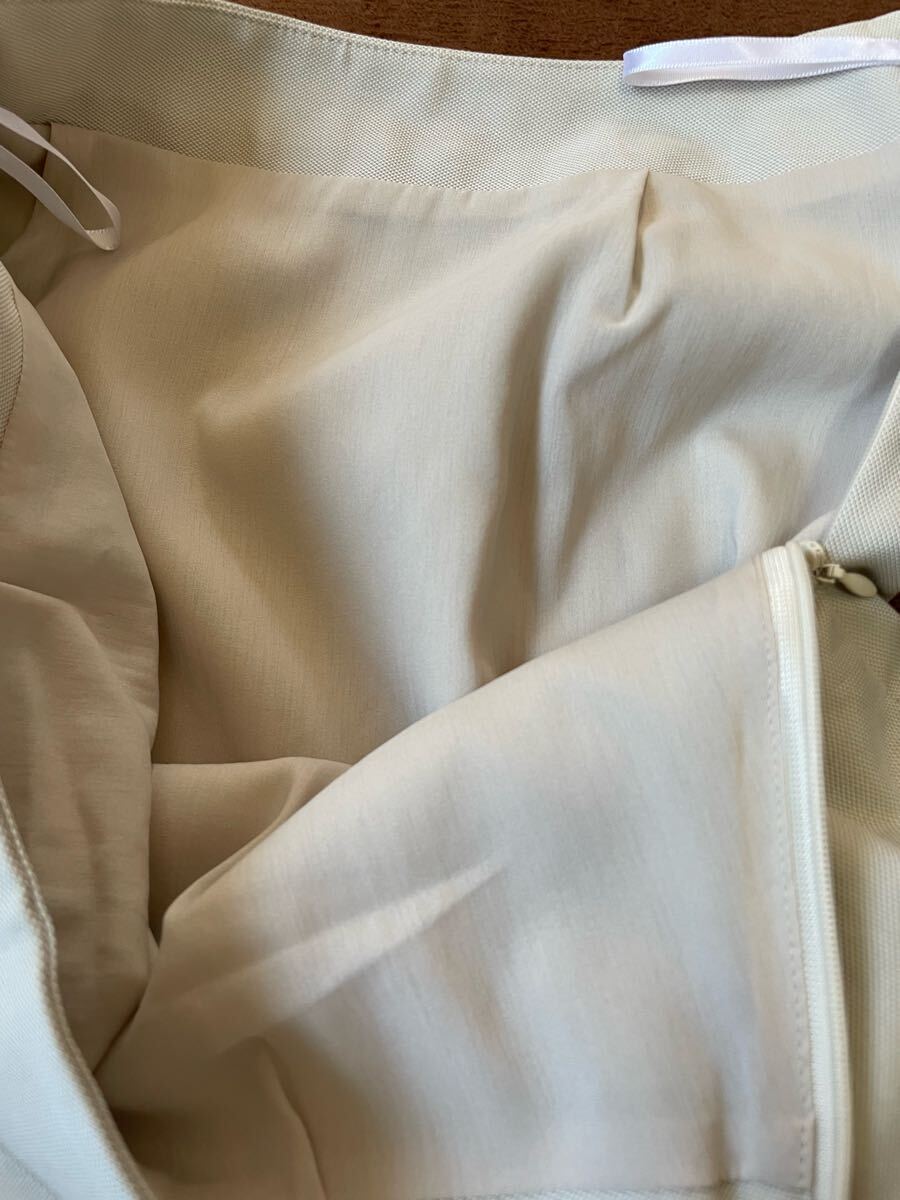 ベージュのシングルボタンジャケットとプリーツスカートのセットアップ。
