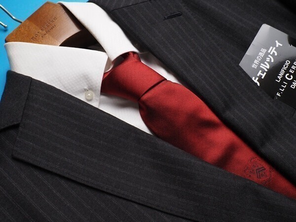 水牛釦、本切羽、AMFステッチ、ラペル毛芯など、百貨店向けならではの上級仕立てで仕上げられております。ファブリックは1881年にイタリアのビエラで創業されたチェルッティ社のウール100%生地を使用。