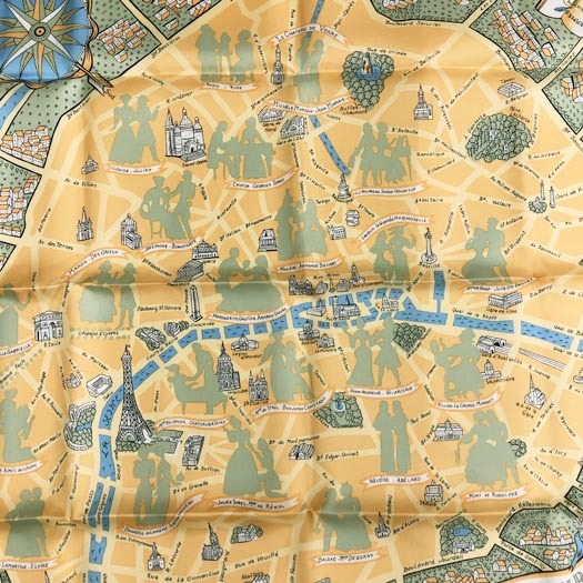 | エルメスのカレ90 スカーフ「新パリの恋人たち」です。首に巻いたり、 バッグに付けたり、ヘアアクセサリーにしたり様々なシーンでお使いいただけます。 | ||