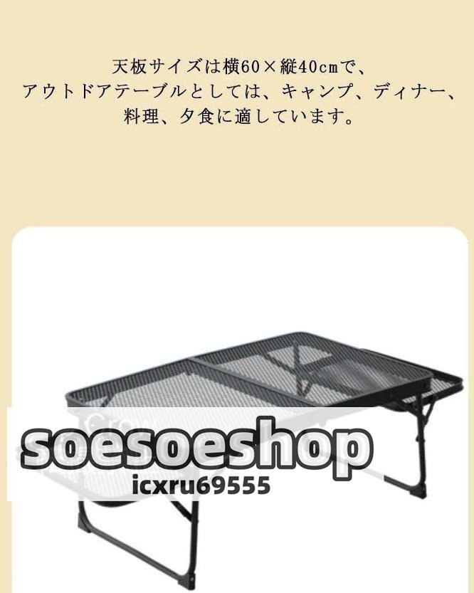 【アウトドアテーブルだけでなく、室内の使用でも安心】天板サイズは横60×縦40cmで、アウトドアテーブルとしては、キャンプ、ディナー、料理、夕食に適しています。お皿、鍋などを置けます。網が密集していて、雑誌、パソコン、おやつ、飲み物など物を置くことに適します。来客用のちゃぶ台、お子様テーブルとしてなど、室内での様々なシーンに対応します。 【安定感抜群!筋交いプレート4本】 キャンプは、砂の場所、芝生の場所、砂利の場所、土の場所など、いろんな場所で楽しむと思います。テーブルには調理器具、お酒などの飲み物、スマホやカメラなど、いろんな物を置きますので、より安定感が求められます。当商品は斜めに設置された4箇所の筋交いに加えて、より安定して使えるようにしました。 【コンパクトな折り畳み式で持ちやすい】設営・撤収は簡単で時間かかりません。収納バッグ付属し、収納サイズをコンパクトにし、持ち運びも楽で、キャンプではメインにもサブにもなるテーブルです。工具不要で、5秒ぐらい組み立てられます、または片手で取り付けられます。 【様々な場所に活躍】持ち運び便利なのでお花見、ツーリング、運動会、ピクニック、登山、お釣り、キャンプ、遠足、運動会など幅広くご使用できます。一人でキャンプやアウトドア活動など場合は荷物を減られように良いです。室内で使用しても違和感なく、使いやすいです。 サイズ フリー サイズについての説明 展開後:長さ92cm 幅さ42cm 高さ30cm 折りたたみ:32*42*6.5cm 素材 アルミニウム合金 色 図通り 備考 ●サイズ詳細等の測り方はスタッフ間で統一、徹底はしておりますが、実寸は商品によって若干の誤差(1cm~3cm )がある場合がございますので、予めご了承ください。 ●製造ロットにより、細部形状の違いや、同色でも色味に多少の誤差が生じます。 ●パッケージは改良のため予告なく仕様を変更する場合があります。 ▼商品の色は、撮影時の光や、お客様のモニターの色具合などにより、実際の商品と異なる場合がございます。あらかじめ、ご了承ください。 ▼生地の特性上、やや匂いが強く感じられるものもございます。数日のご使用や陰干しなどで気になる匂いはほとんど感じられなくなります。 ▼同じ商品でも生産時期により形やサイズ、カラーに多少の誤差が生じる場合もございます。