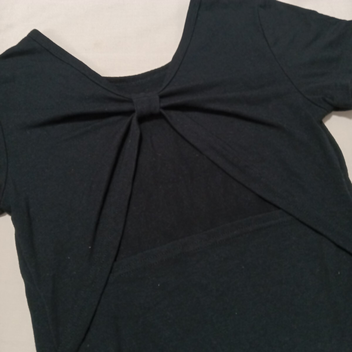 黒の半袖Tシャツは、後ろの一部が開いているデザインです。