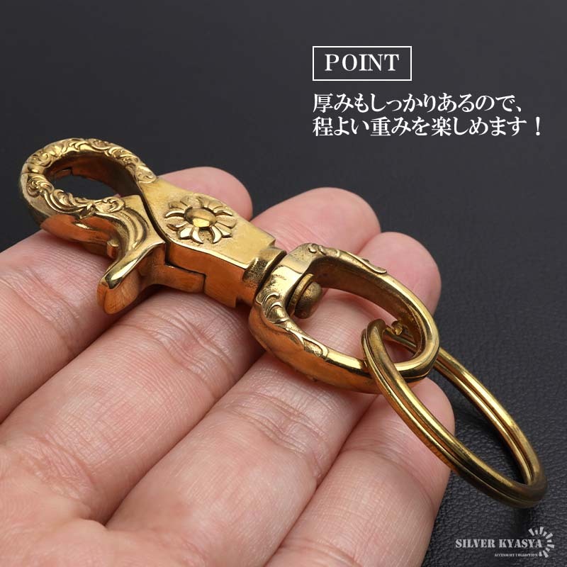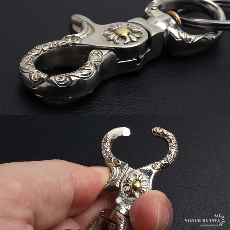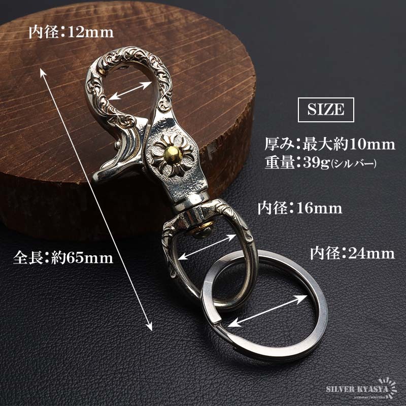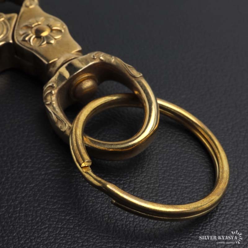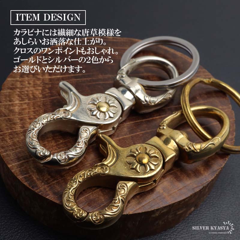 カラビナには繊細な唐草模様をあしらいお洒落な仕上がり。クロスのワンポイントもおしゃれ。ゴールドとシルバーの2色からお選びいただけます。